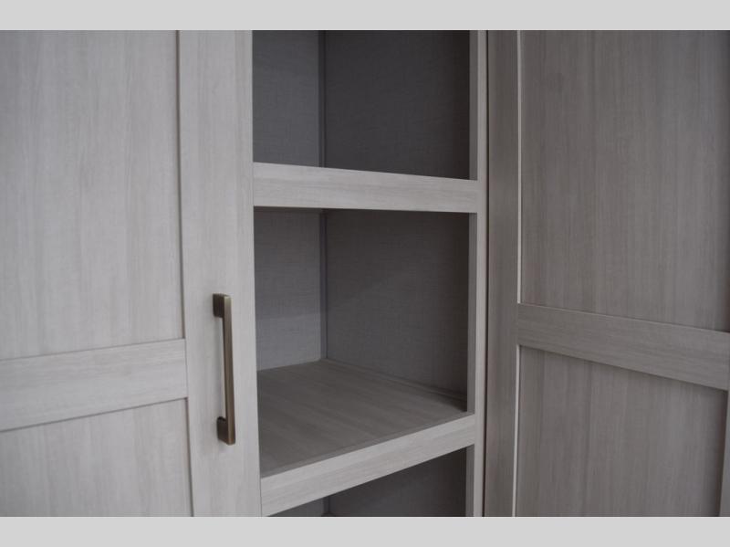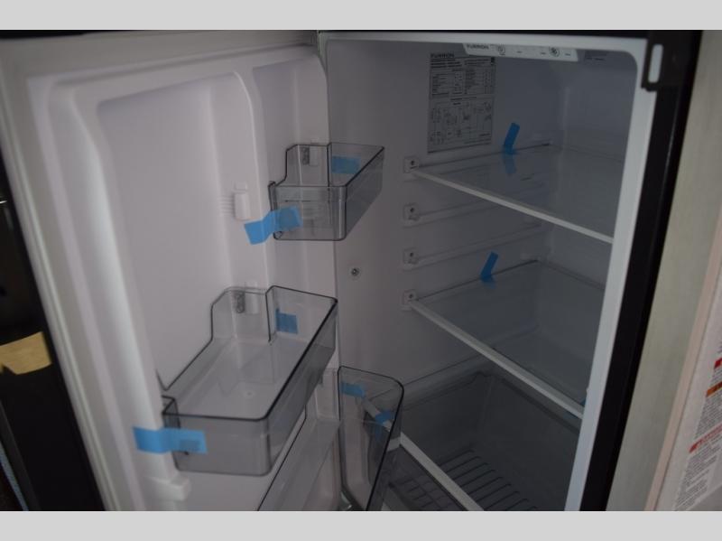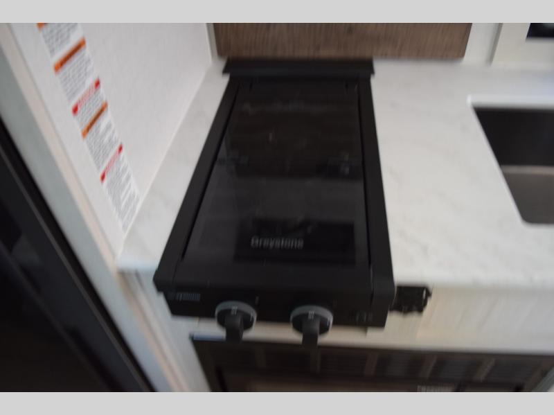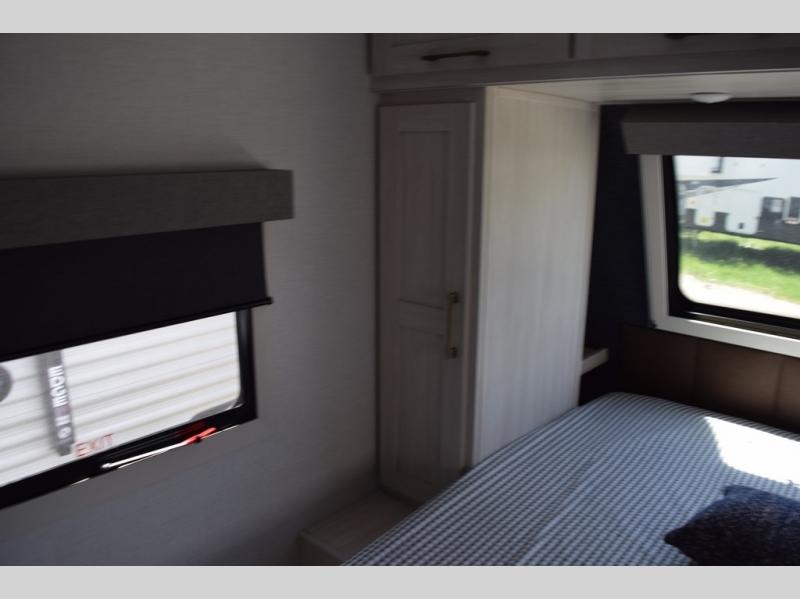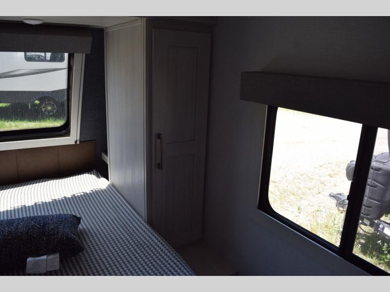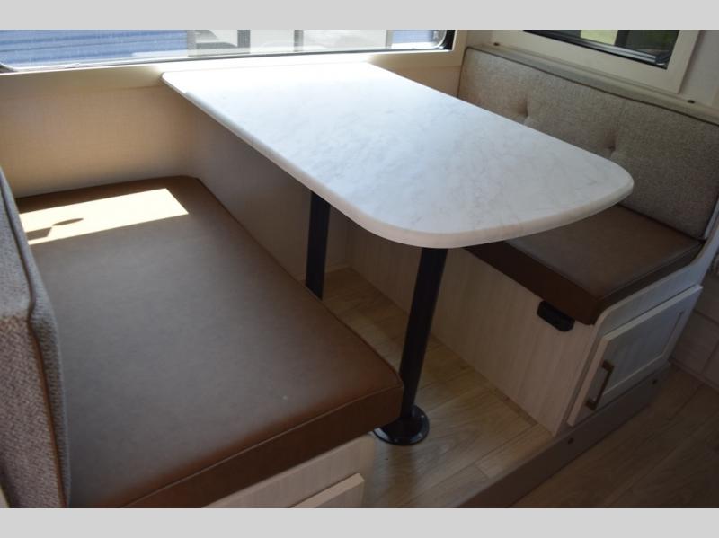 This couple's trailer resembles the layout of model 19MBLE, but with a queen-size bed up front instead of a Murphy bed. If you have an overnight guest or two little ones, they can sleep on the dinette slide, and everyone will appreciate the privacy of the full rear bath. You will have everything needed each day to prepare meals, including a two burner cooktop, a convection microwave, plus an outside kitchen. The pass-through storage will be be perfect for fishing poles, tackle boxes, or lawn chairs, and there is a 15' electric awning with LED lights to relax under!