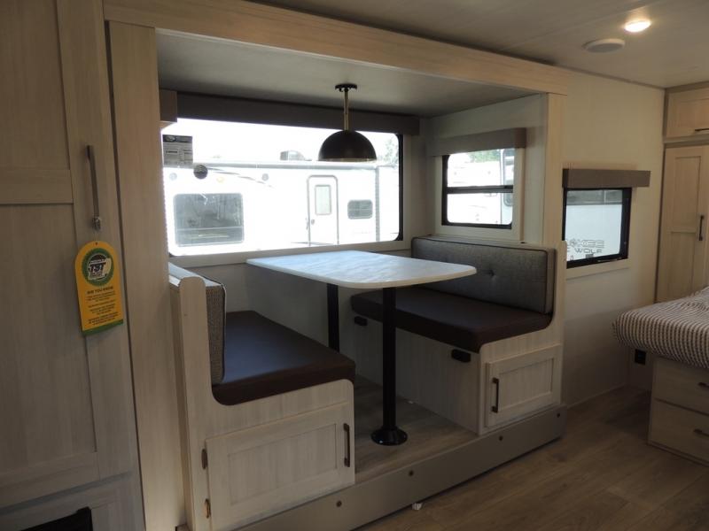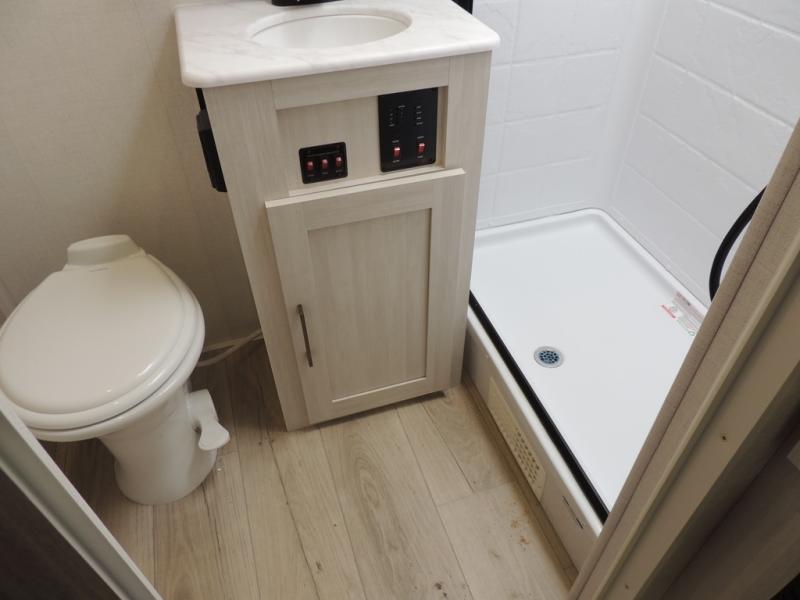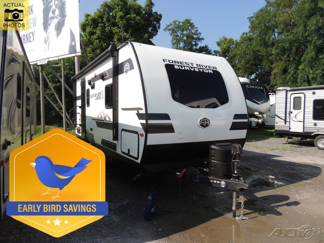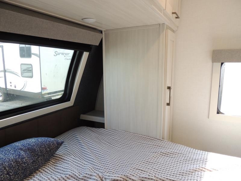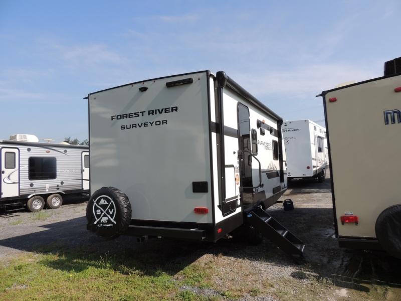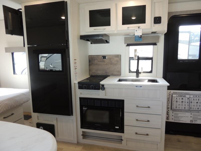With any Surveyor Legend travel trailer by Forest River you will enjoy quality craftsmanship, convenient amenities, and at-home comforts. The Azdel composite walls provide a longer-lasting trailer, and the power tongue jack with a hitch light will get you back on the road in no-time. There are also Goodyear tires and a tire pressure monitoring system for hassle-free towing. Each model includes the Surveyor Legend Package that comes standard with oversized dinette storage access doors, front slam latch baggage doors, plus an automotive style tinted front windshield. You'll appreciate camping with a tankless water heater for endless hot showers, a 2" accessory hitch to bring bikes along, plus carpet-free interiors and a central vacuum system for easy clean up.