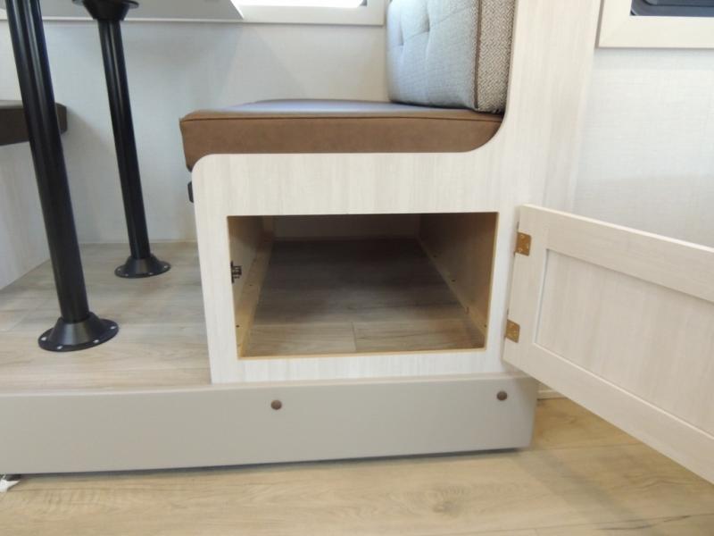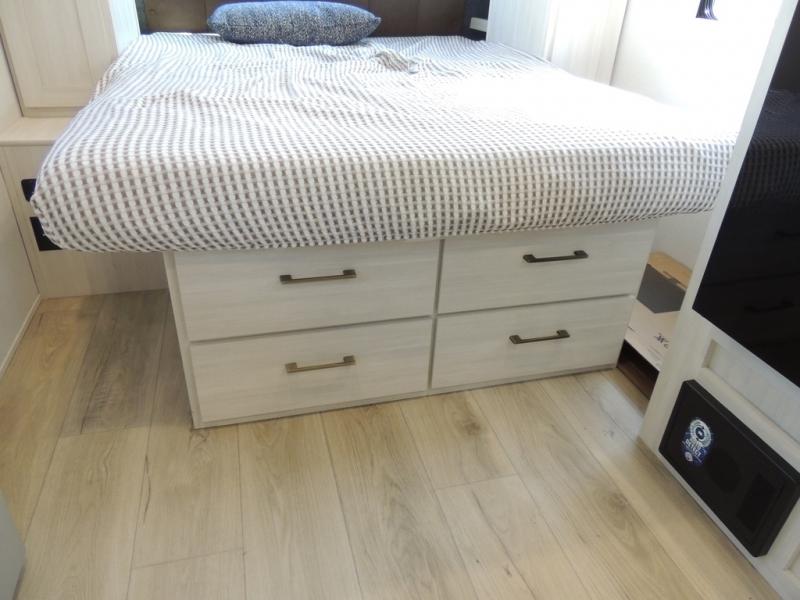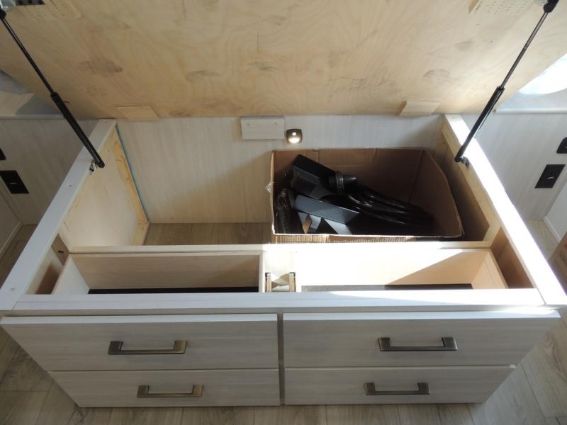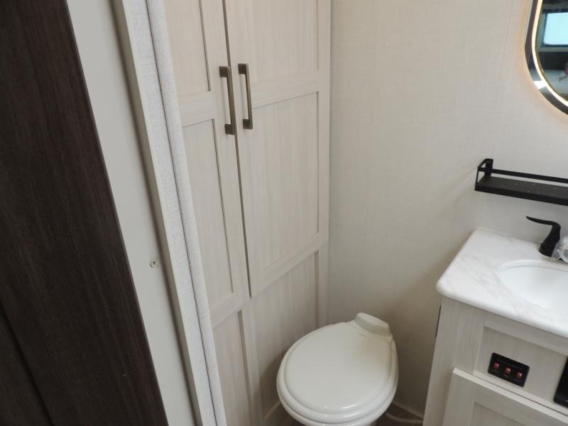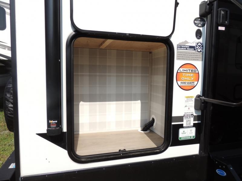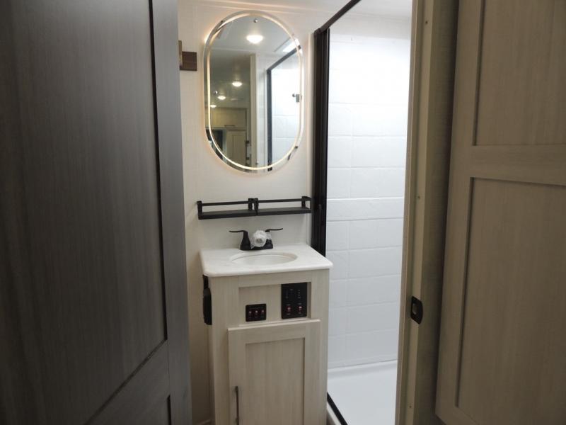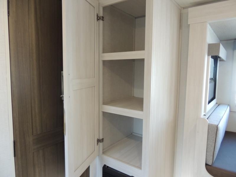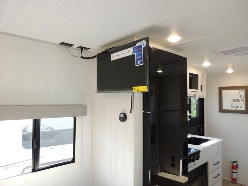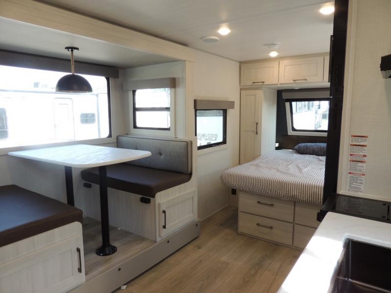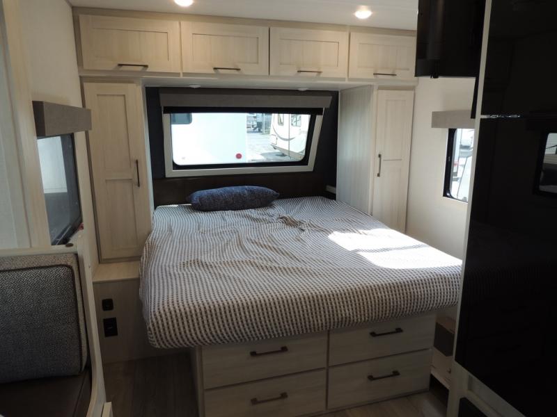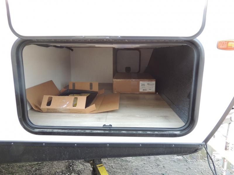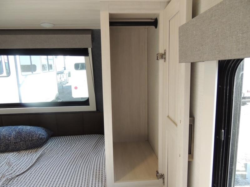 This couple's trailer resembles the layout of model 19MBLE, but with a queen-size bed up front instead of a Murphy bed. If you have an overnight guest or two little ones, they can sleep on the dinette slide, and everyone will appreciate the privacy of the full rear bath. You will have everything needed each day to prepare meals, including a two burner cooktop, a convection microwave, plus an outside kitchen. The pass-through storage will be be perfect for fishing poles, tackle boxes, or lawn chairs, and there is a 15' electric awning with LED lights to relax under!