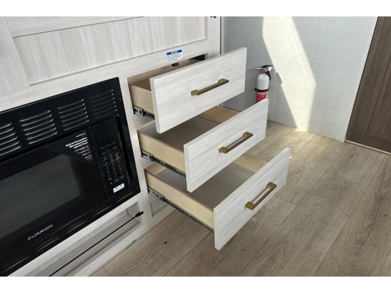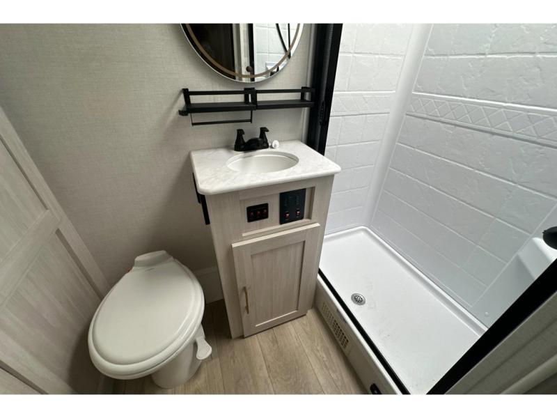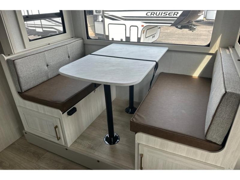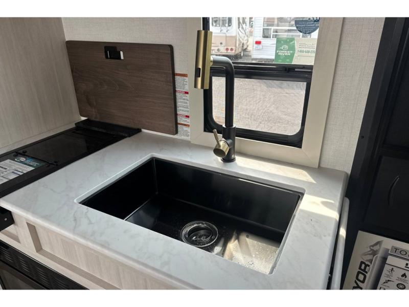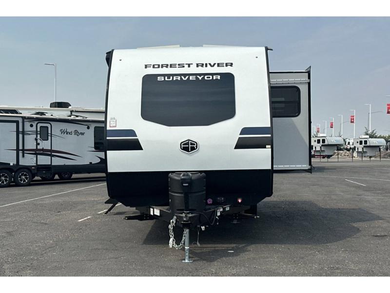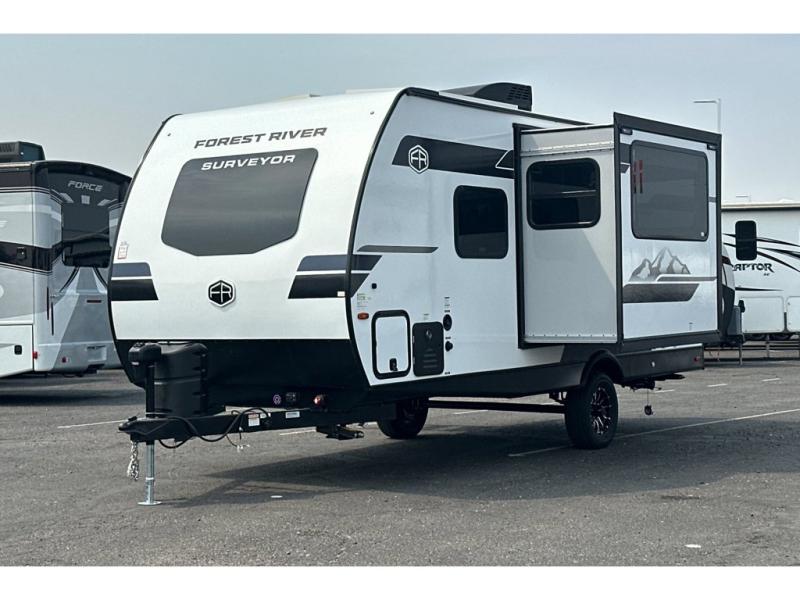 With any Surveyor Legend travel trailer by Forest River you will enjoy quality craftsmanship, convenient amenities, and at-home comforts. The Azdel composite walls provide a longer-lasting trailer, and the power tongue jack with a hitch light will get you back on the road in no-time. There are also Goodyear tires and a tire pressure monitoring system for hassle-free towing. Each model includes the Surveyor Legend Package that comes standard with oversized dinette storage access doors, front slam latch baggage doors, plus an automotive style tinted front windshield. You'll appreciate camping with a tankless water heater for endless hot showers, a 2" accessory hitch to bring bikes along, plus carpet-free interiors and a central vacuum system for easy clean up.