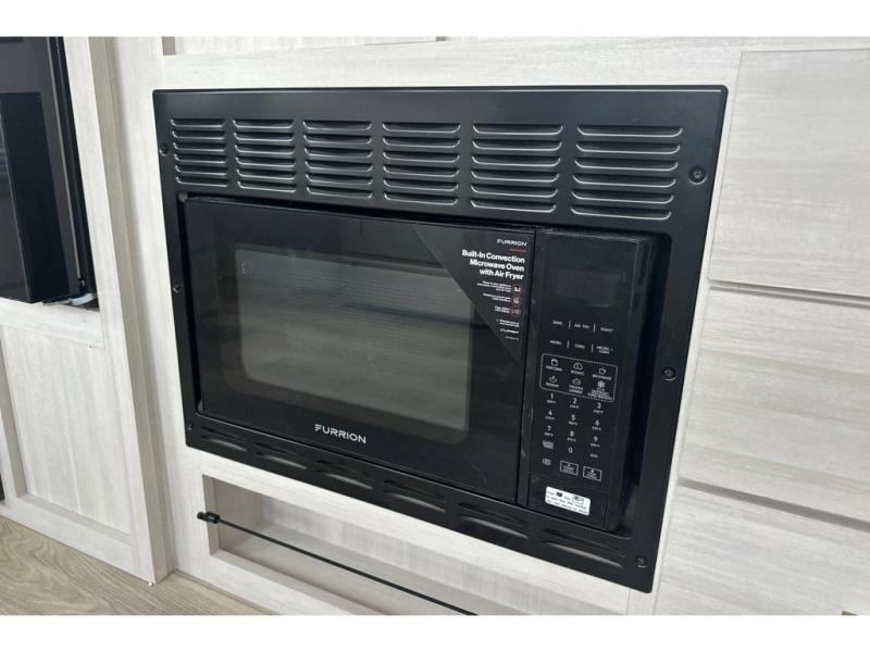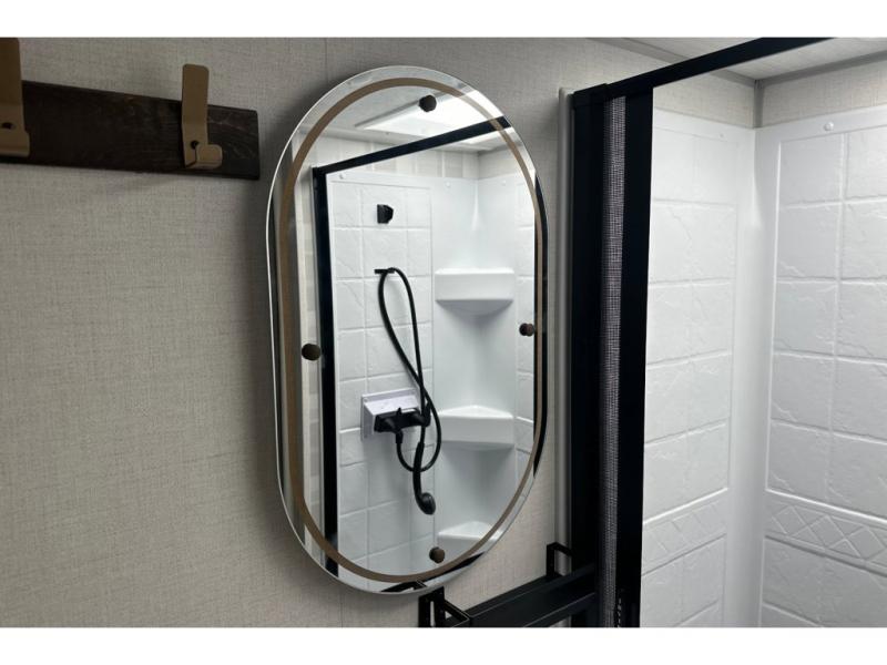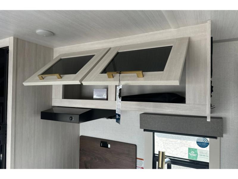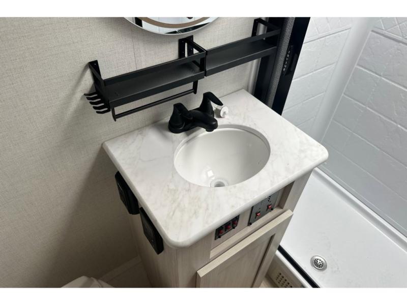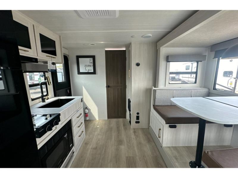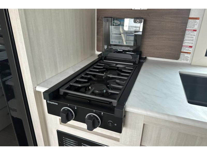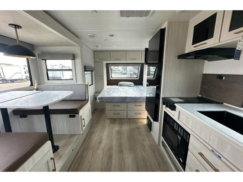 This couple's trailer resembles the layout of model 19MBLE, but with a queen-size bed up front instead of a Murphy bed. If you have an overnight guest or two little ones, they can sleep on the dinette slide, and everyone will appreciate the privacy of the full rear bath. You will have everything needed each day to prepare meals, including a two burner cooktop, a convection microwave, plus an outside kitchen. The pass-through storage will be be perfect for fishing poles, tackle boxes, or lawn chairs, and there is a 15' electric awning with LED lights to relax under!