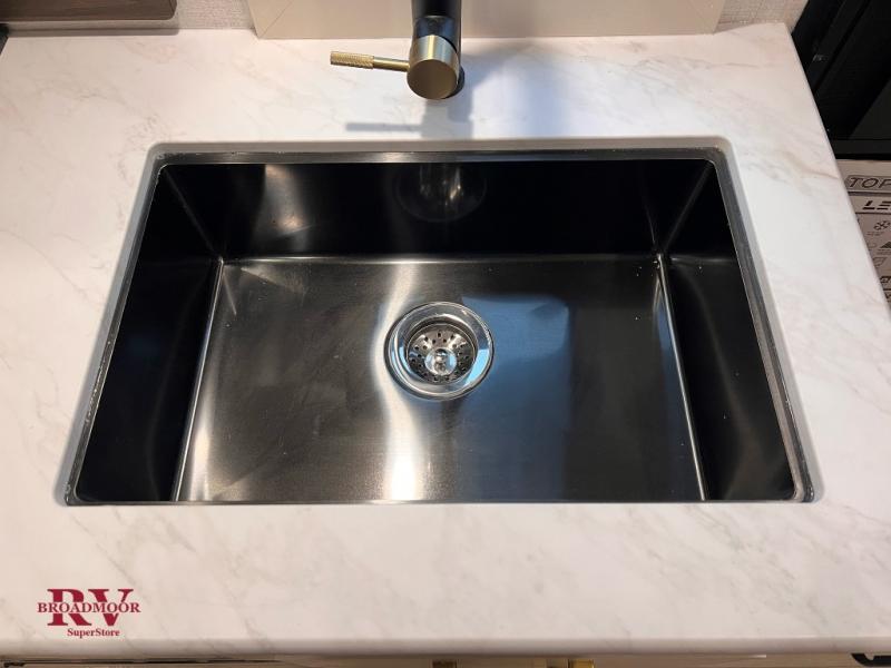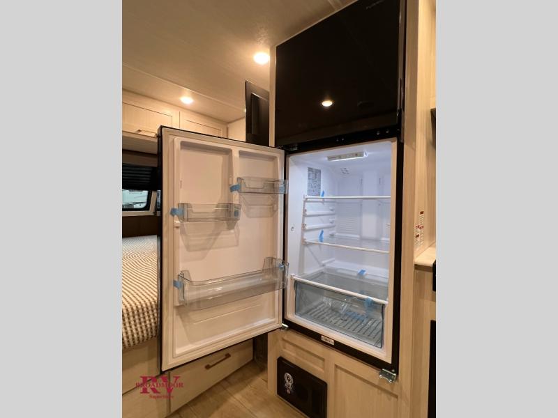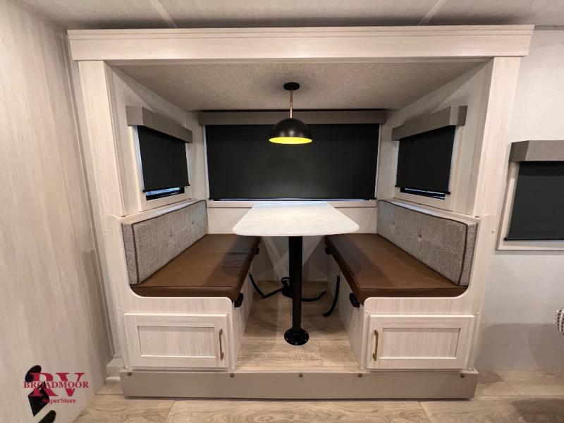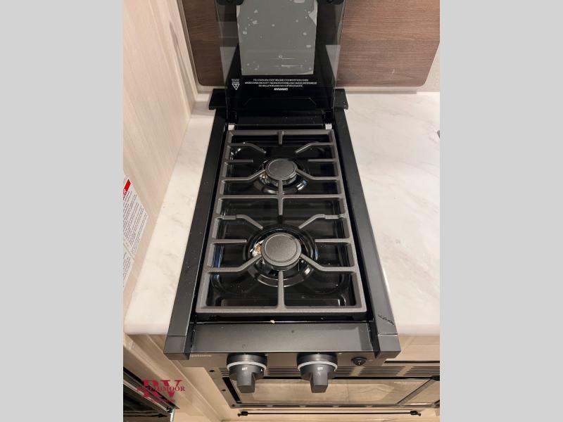This couple's trailer resembles the layout of model 19MBLE, but with a queen-size bed up front instead of a Murphy bed. If you have an overnight guest or two little ones, they can sleep on the dinette slide, and everyone will appreciate the privacy of the full rear bath. You will have everything needed each day to prepare meals, including a two burner cooktop, a convection microwave, plus an outside kitchen. The pass-through storage will be be perfect for fishing poles, tackle boxes, or lawn chairs, and there is a 15' electric awning with LED lights to relax under!