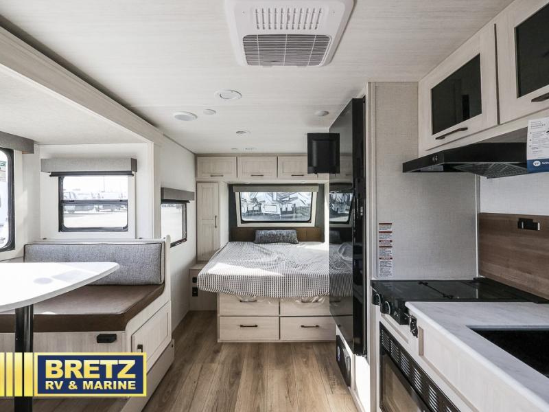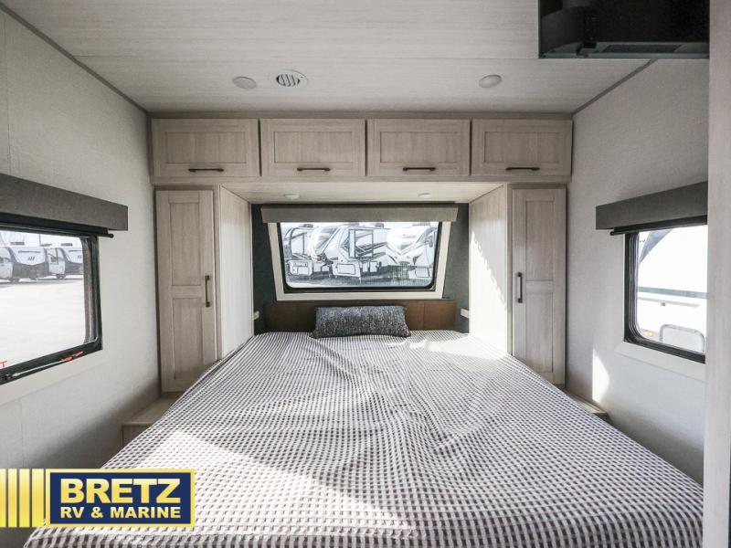 This couple's trailer resembles the layout of model 19MDBLE, but with a queen-size bed up front instead of a Murphy bed. If you have an overnight guest or two little ones, they can sleep on the dinette slide, and everyone will appreciate the privacy of the full rear bath. You will have everything needed each day to prepare meals, including a two burner cooktop, a convection microwave, plus an outside kitchen. The pass-through storage will be be perfect for fishing poles, tackle boxes, or lawn chairs, and there is a 15' electric awning with LED lights to relax under!