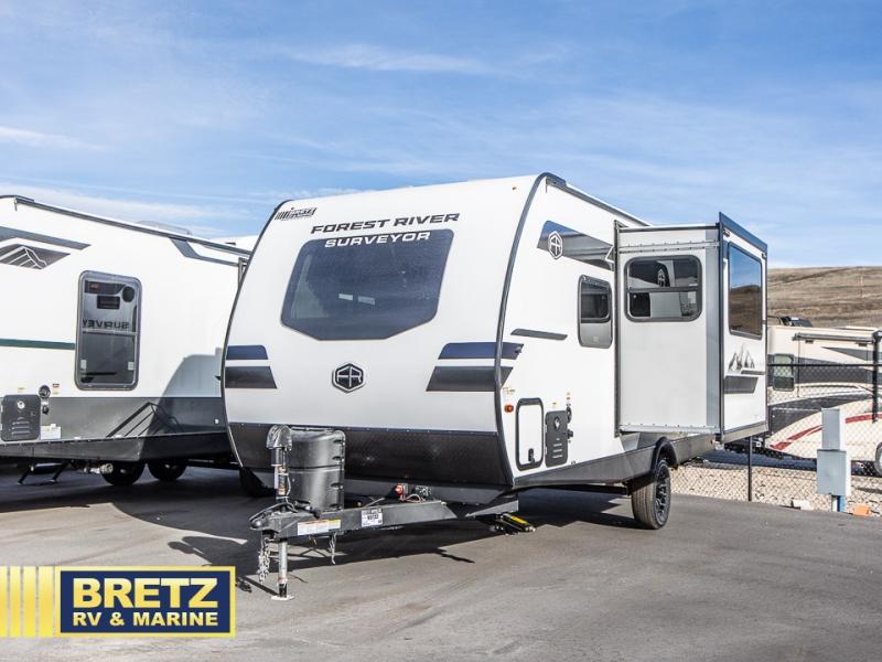 With any Surveyor Legend travel trailer by Forest River you will enjoy quality craftsmanship, convenient amenities, and at-home comforts. The Azdel composite walls provide a longer-lasting trailer, and the power tongue jack with a hitch light will get you back on the road in no-time. There are also Goodyear tires and a tire pressure monitoring system for hassle-free towing. Each model includes the Surveyor Legend Package that comes standard with oversized dinette storage access doors, front slam latch baggage doors, plus an automotive style tinted front windshield. You'll appreciate camping with a tankless water heater for endless hot showers, a 2" accessory hitch to bring bikes along, plus carpet-free interiors and a central vacuum system for easy clean up.