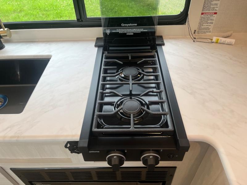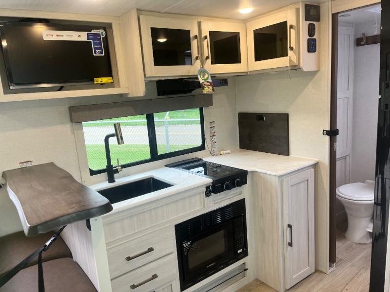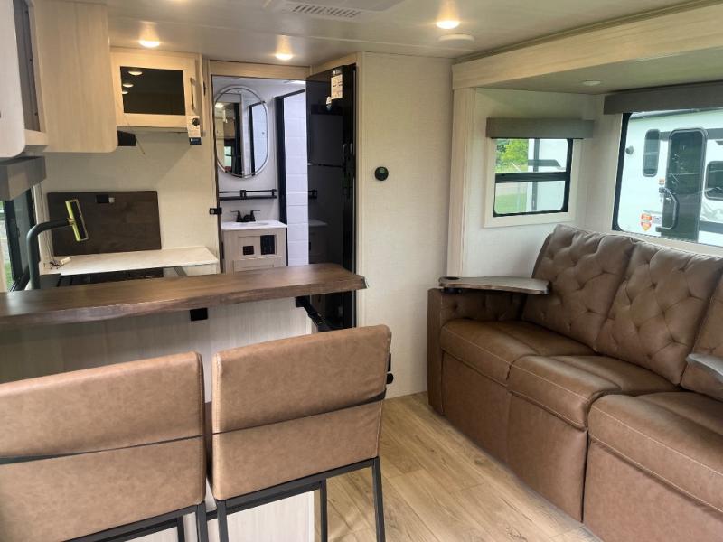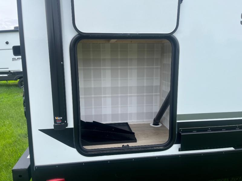 Hit the road with this Surveyor Legend trailer in tow, featuring a tri-fold sofa slide for added seating, sleeping, and interior space. You will also love the breakfast bar with two stools for dining. The queen bed up front will provide a great night's rest, and there is overhead storage at the head of the bed along with dual wardrobes for your things on either side. If you have an overnight guest or two little ones, they can sleep on the tri-fold sofa slide, and everyone will appreciate the privacy of the full rear bath. You will have everything needed each day to prepare meals, including a two burner cooktop, a convection microwave, and refrigerator for your perishables. The pass-through storage will be be perfect for fishing poles, outdoor chairs, yard games, plus there is additional outdoor storage along the rear curbside for your hiking gear!