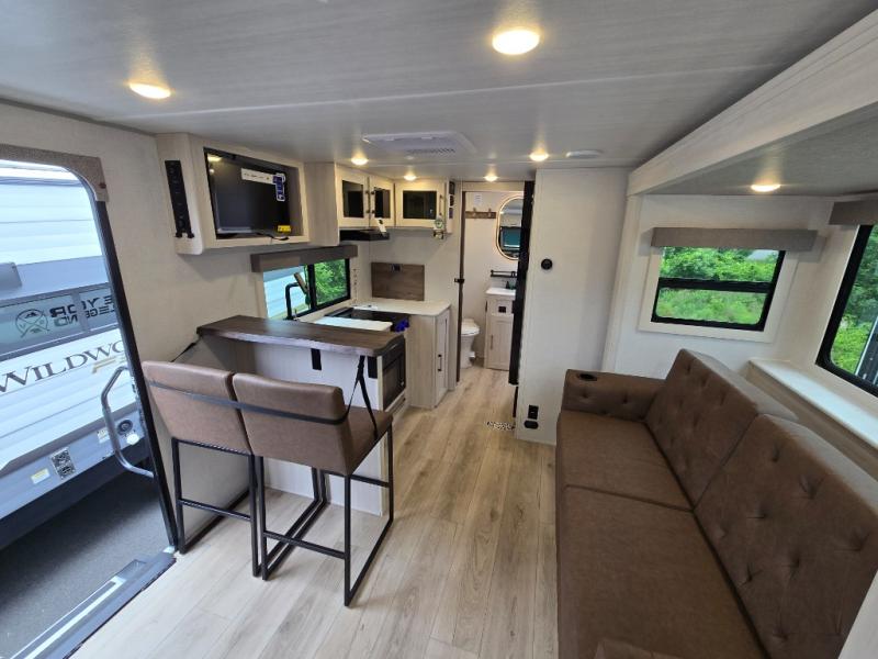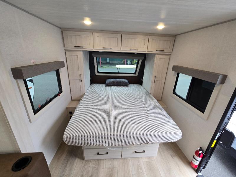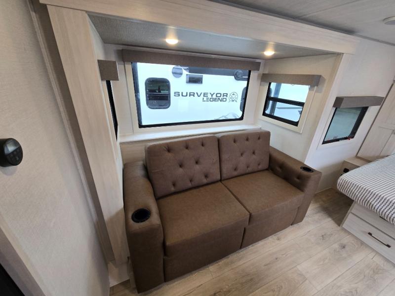 Hit the road with this Surveyor Legend trailer in tow, featuring a tri-fold sofa slide for added seating, sleeping, and interior space. You will also love the breakfast bar with two stools for dining. The queen bed up front will provide a great night's rest, and there is overhead storage at the head of the bed along with dual wardrobes for your things on either side. If you have an overnight guest or two little ones, they can sleep on the tri-fold sofa slide, and everyone will appreciate the privacy of the full rear bath. You will have everything needed each day to prepare meals, including a two burner cooktop, a convection microwave, and refrigerator for your perishables. The pass-through storage will be be perfect for fishing poles, outdoor chairs, yard games, plus there is additional outdoor storage along the rear curbside for your hiking gear!