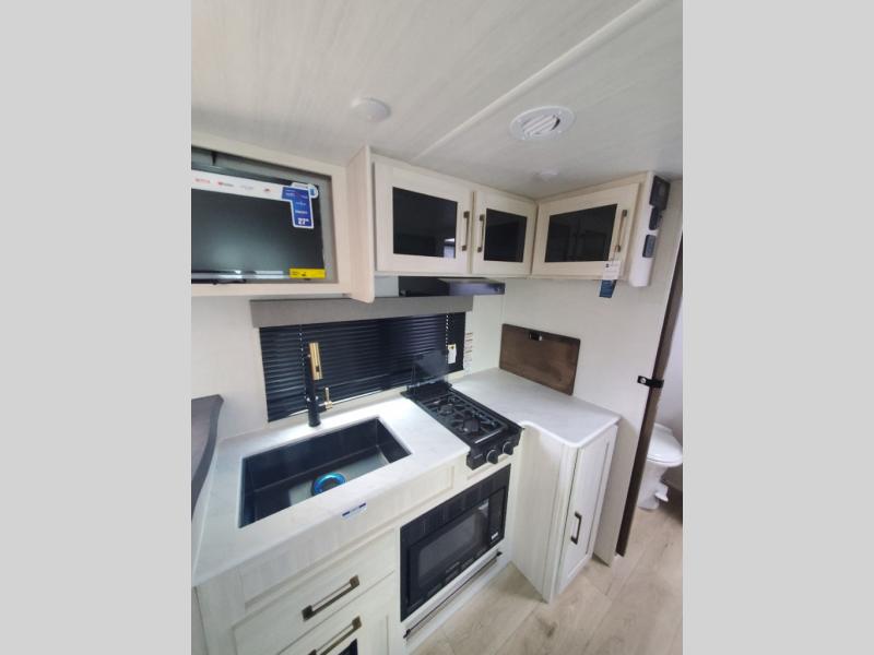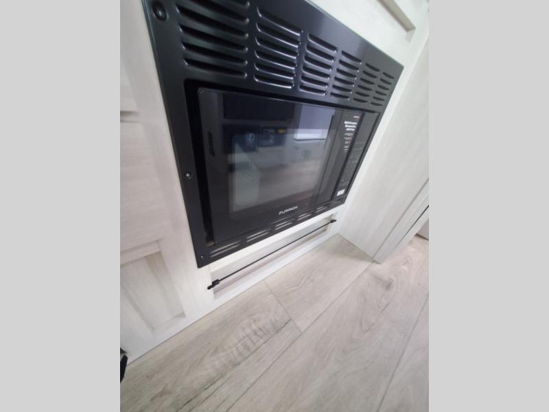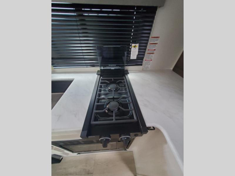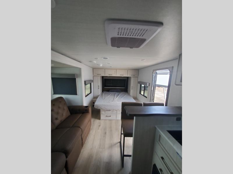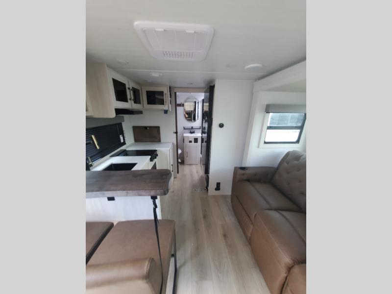 Hit the road with this Surveyor Legend trailer in tow, featuring a tri-fold sofa slide for added seating, sleeping, and interior space. You will also love the breakfast bar with two stools for dining. The queen bed up front will provide a great night's rest, and there is overhead storage at the head of the bed along with dual wardrobes for your things on either side. If you have an overnight guest or two little ones, they can sleep on the tri-fold sofa slide, and everyone will appreciate the privacy of the full rear bath. You will have everything needed each day to prepare meals, including a two burner cooktop, a convection microwave, and refrigerator for your perishables. The pass-through storage will be be perfect for fishing poles, outdoor chairs, yard games, plus there is additional outdoor storage along the rear curbside for your hiking gear!