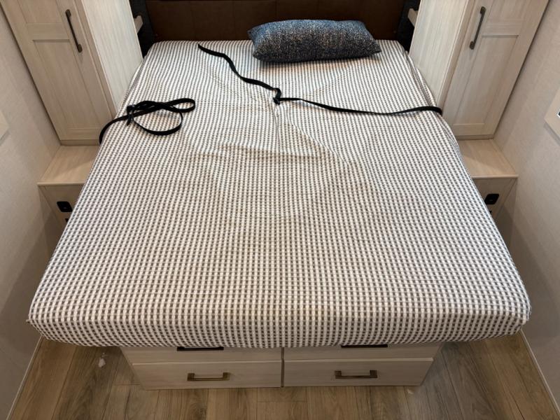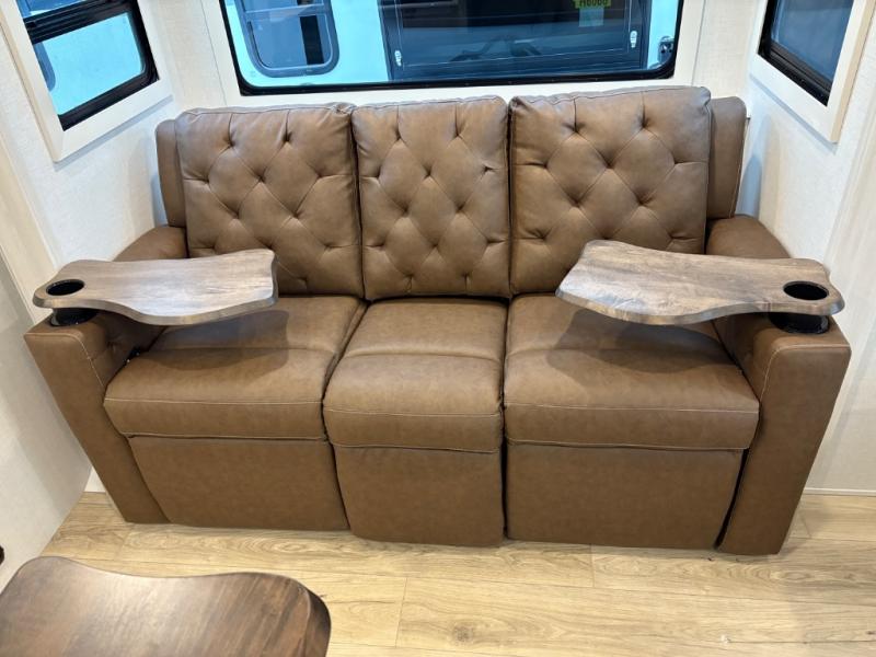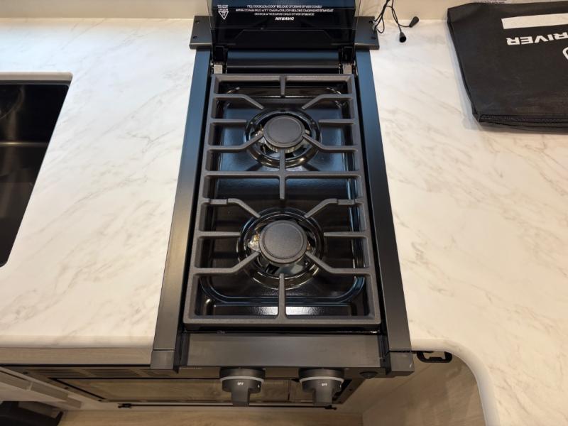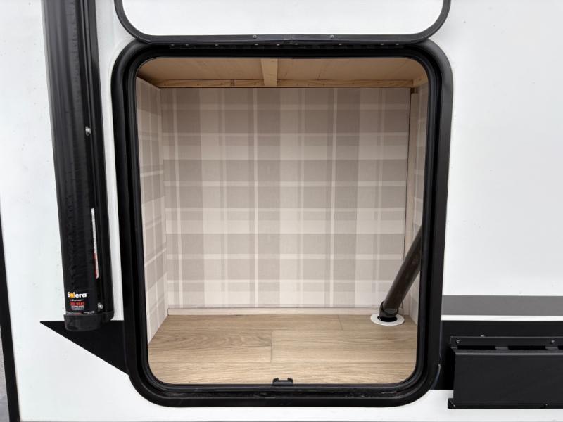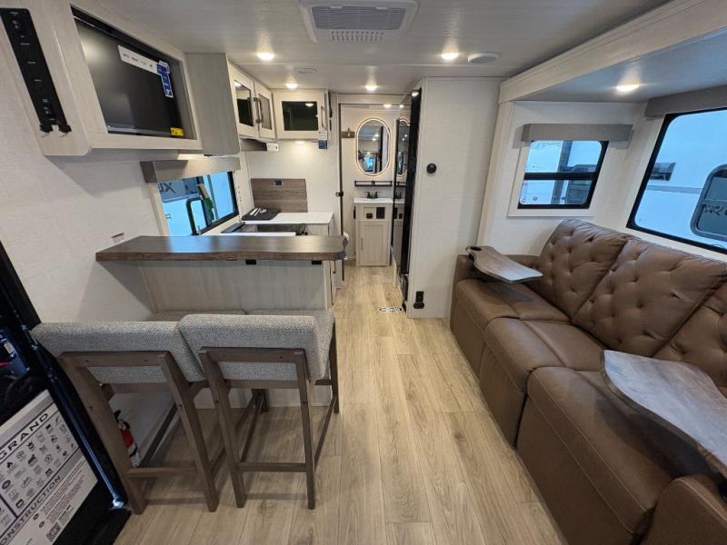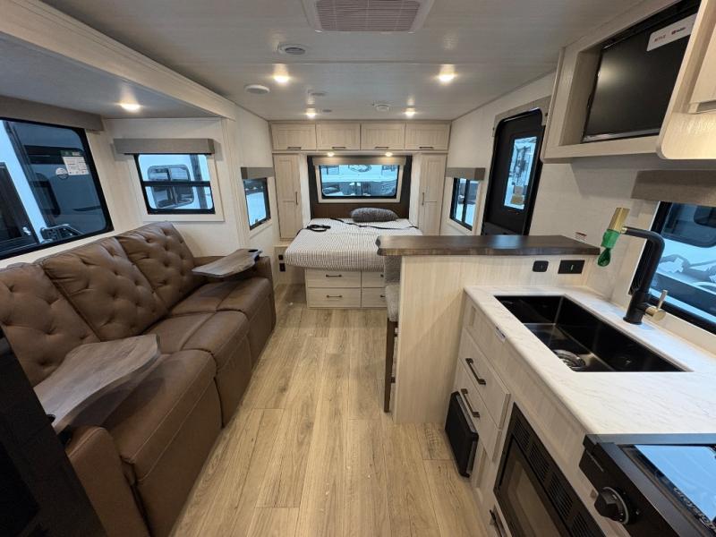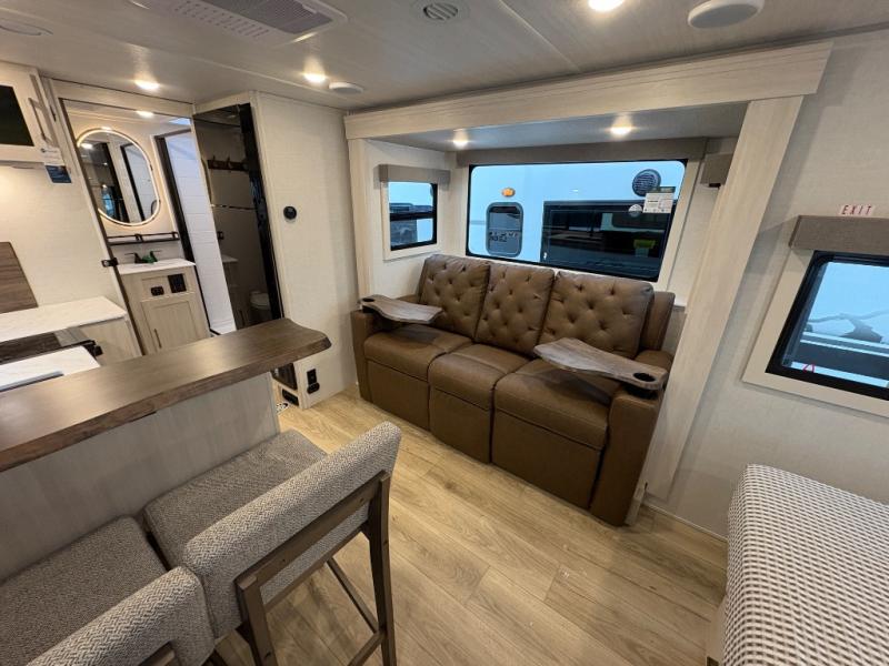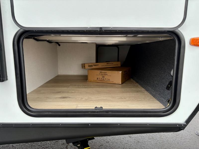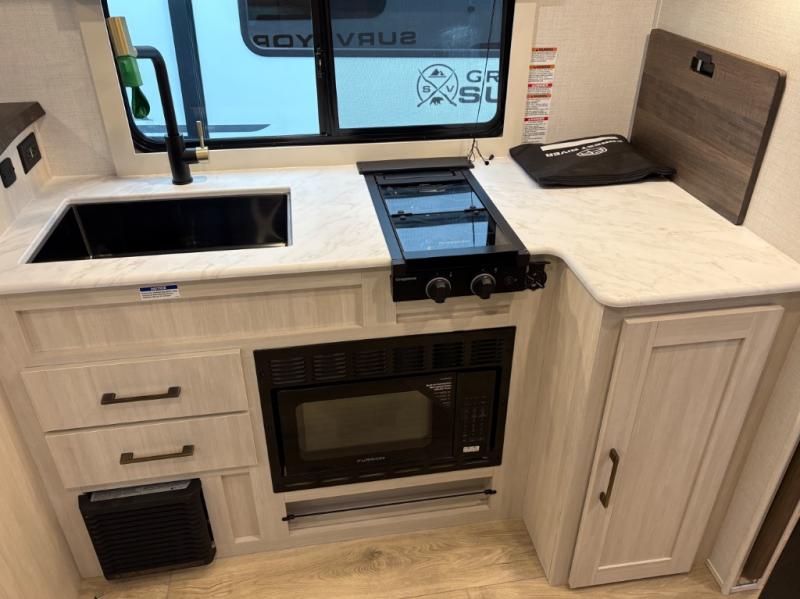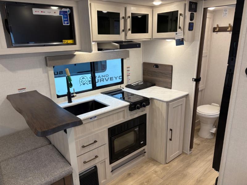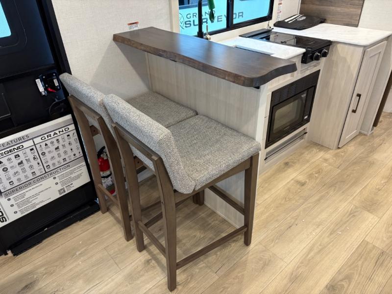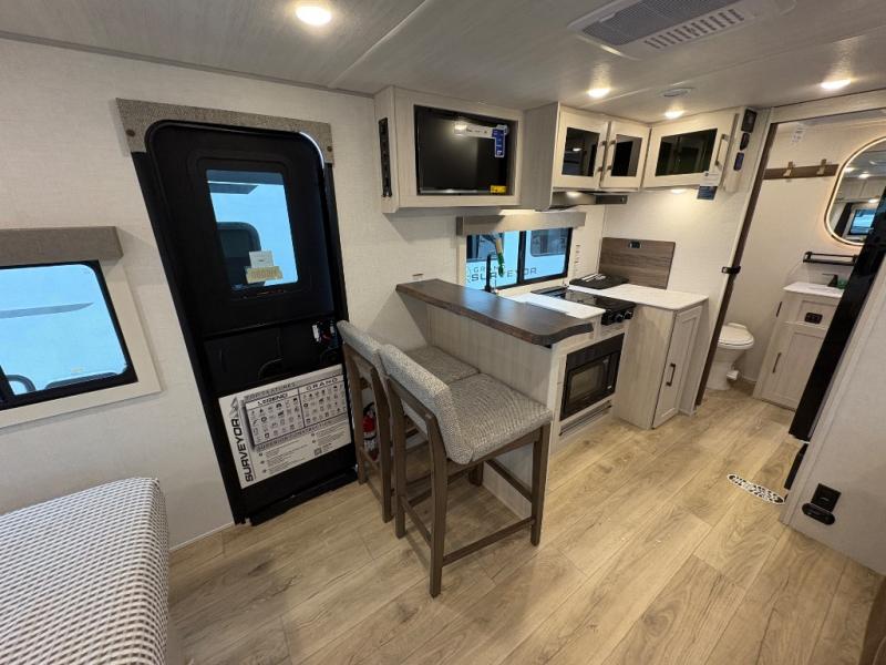 Hit the road with this Surveyor Legend trailer in tow, featuring a tri-fold sofa slide for added seating, sleeping, and interior space. You will also love the breakfast bar with two stools for dining. The queen bed up front will provide a great night's rest, and there is overhead storage at the head of the bed along with dual wardrobes for your things on either side. If you have an overnight guest or two little ones, they can sleep on the tri-fold sofa slide, and everyone will appreciate the privacy of the full rear bath. You will have everything needed each day to prepare meals, including a two burner cooktop, a convection microwave, and refrigerator for your perishables. The pass-through storage will be be perfect for fishing poles, outdoor chairs, yard games, plus there is additional outdoor storage along the rear curbside for your hiking gear!