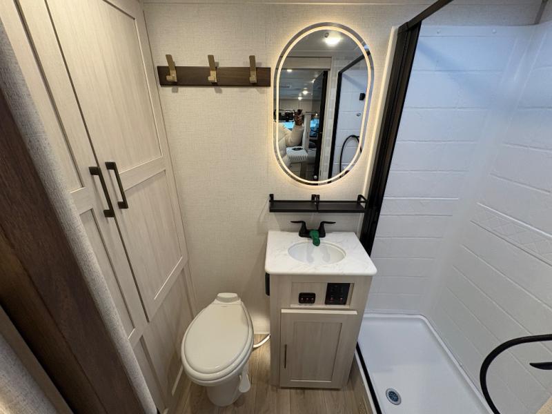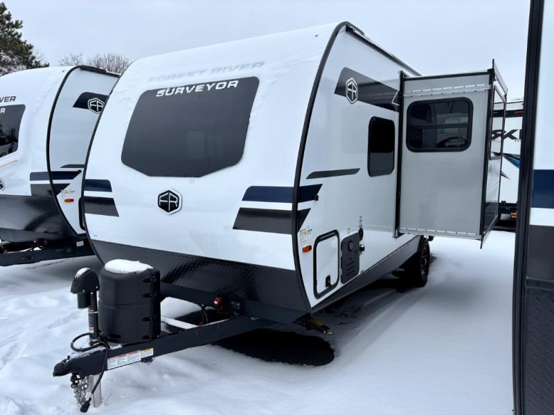 With any Surveyor Legend travel trailer by Forest River you will enjoy quality craftsmanship, convenient amenities, and at-home comforts. The Azdel composite walls provide a longer-lasting trailer, and the power tongue jack with a hitch light will get you back on the road in no-time. There are also Goodyear tires and a tire pressure monitoring system for hassle-free towing. Each model includes the Surveyor Legend Package that comes standard with oversized dinette storage access doors, front slam latch baggage doors, plus an automotive style tinted front windshield. You'll appreciate camping with a tankless water heater for endless hot showers, a 2" accessory hitch to bring bikes along, plus carpet-free interiors and a central vacuum system for easy clean up.