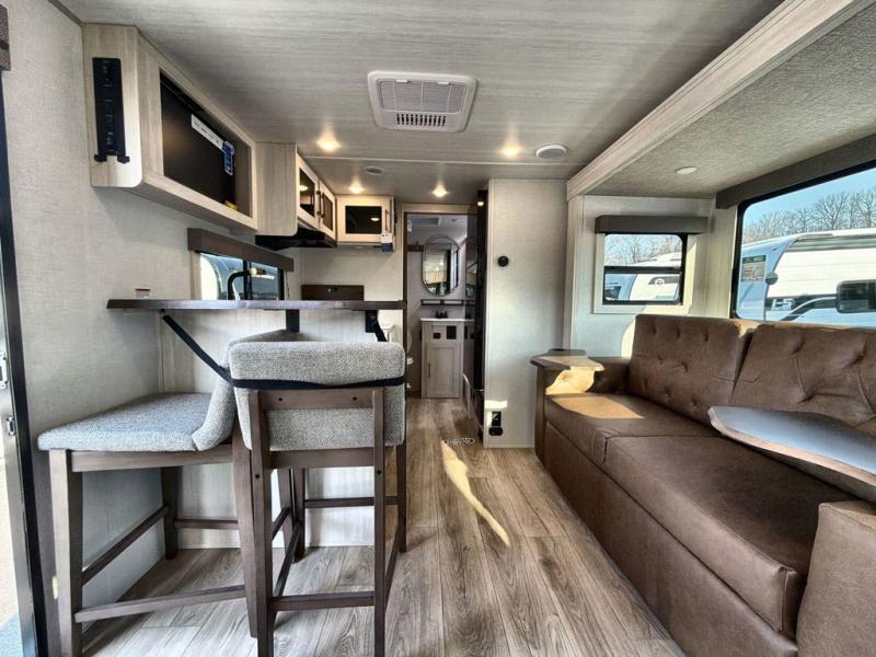 Hit the road with this Surveyor Legend trailer in tow, featuring a tri-fold sofa slide for added seating, sleeping, and interior space. You will also love the breakfast bar with two stools for dining. The queen bed up front will provide a great night's rest, and there is overhead storage at the head of the bed along with dual wardrobes for your things on either side. If you have an overnight guest or two little ones, they can sleep on the tri-fold sofa slide, and everyone will appreciate the privacy of the full rear bath. You will have everything needed each day to prepare meals, including a two burner cooktop, a convection microwave, and refrigerator for your perishables. The pass-through storage will be be perfect for fishing poles, outdoor chairs, yard games, plus there is additional outdoor storage along the rear curbside for your hiking gear!