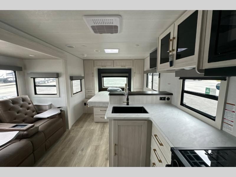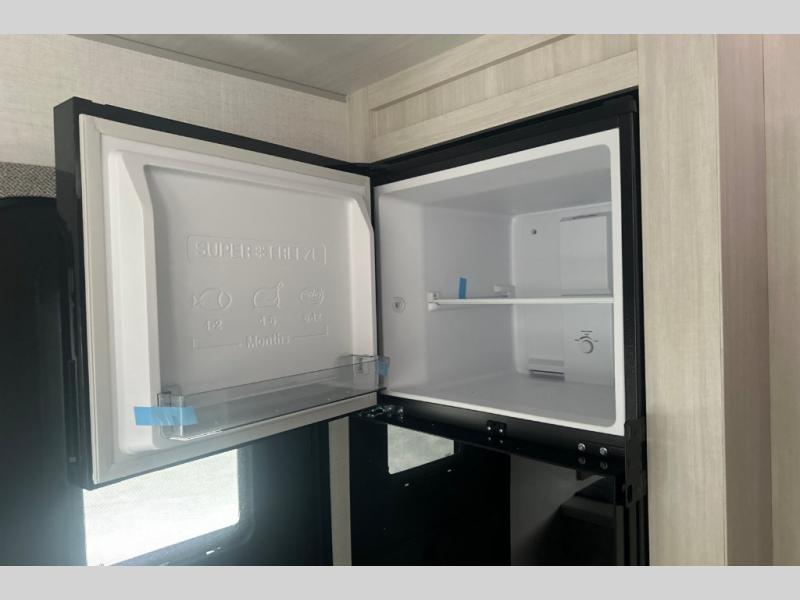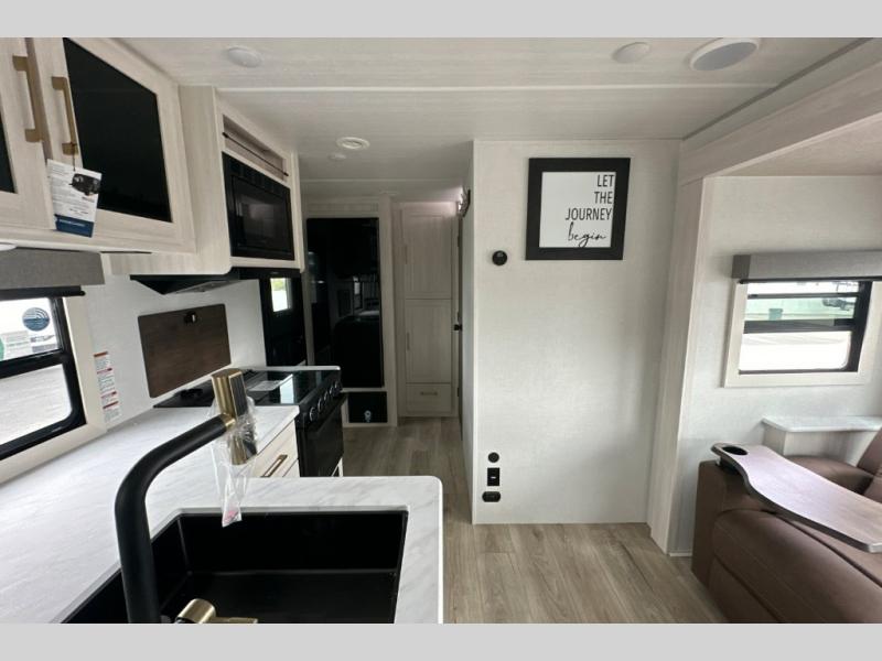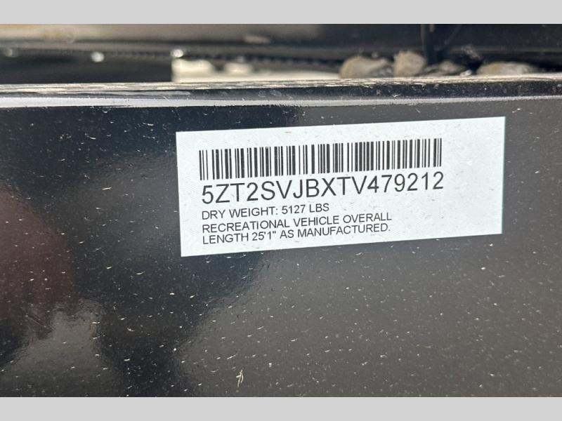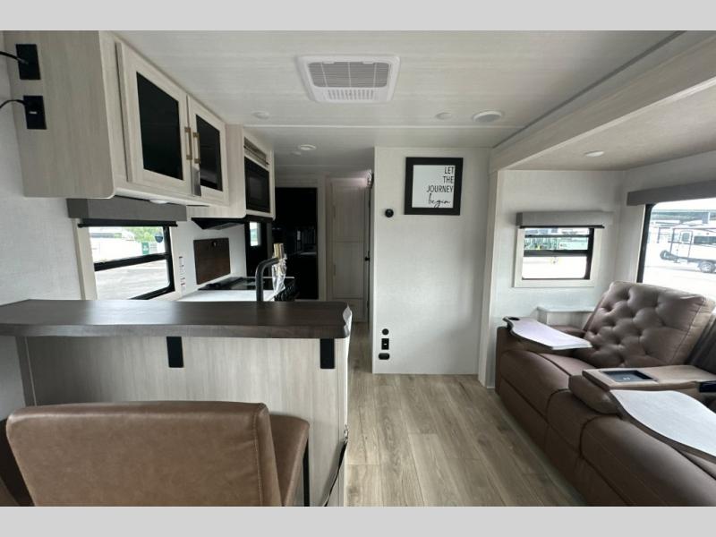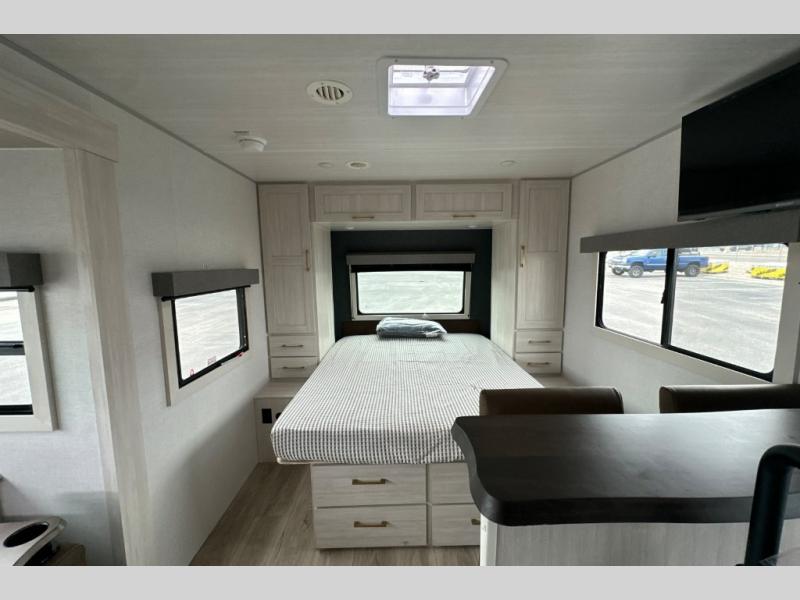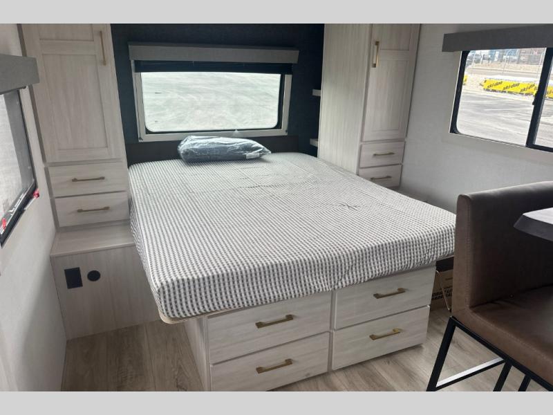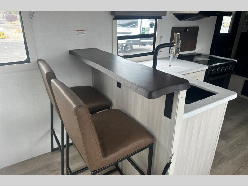 You're going to love every minute spent in this 25' travel trailer! The counter with stools will be the perfect place to enjoy your morning coffee at, plus there is a dinette slide for more seating space. You will get a great night's rest on the queen bed in the front bedroom, and the two wardrobes allow you to keep your clothes tidy. Further customize this trailer by adding the theater seating option or tri-fold sofa option in place of the dinette, and you'll enjoy the standard HD TV for late-night movies!