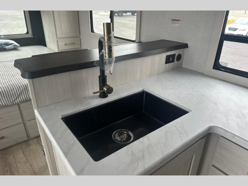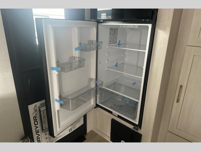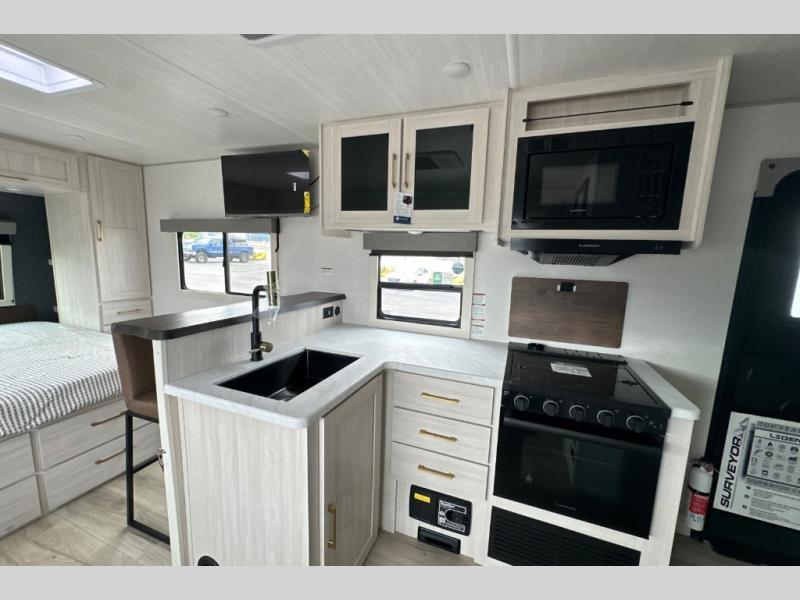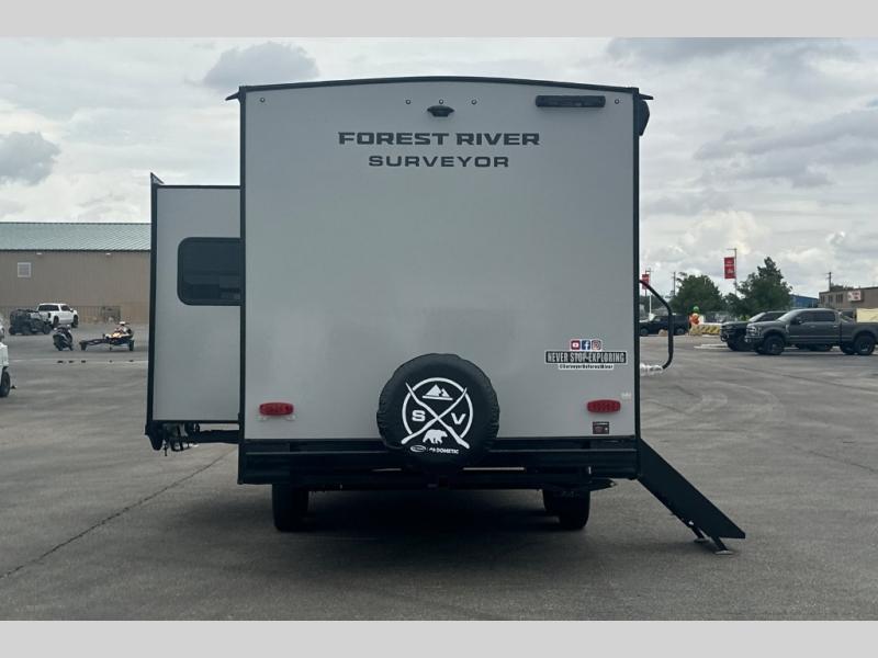 With any Surveyor Legend travel trailer by Forest River you will enjoy quality craftsmanship, convenient amenities, and at-home comforts. The Azdel composite walls provide a longer-lasting trailer, and the power tongue jack with a hitch light will get you back on the road in no-time. There are also Goodyear tires and a tire pressure monitoring system for hassle-free towing. Each model includes the Surveyor Legend Package that comes standard with oversized dinette storage access doors, front slam latch baggage doors, plus an automotive style tinted front windshield. You'll appreciate camping with a tankless water heater for endless hot showers, a 2" accessory hitch to bring bikes along, plus carpet-free interiors and a central vacuum system for easy clean up.