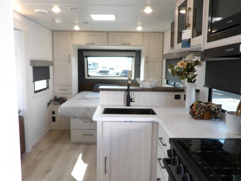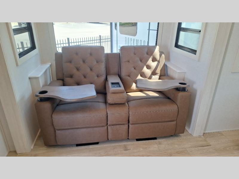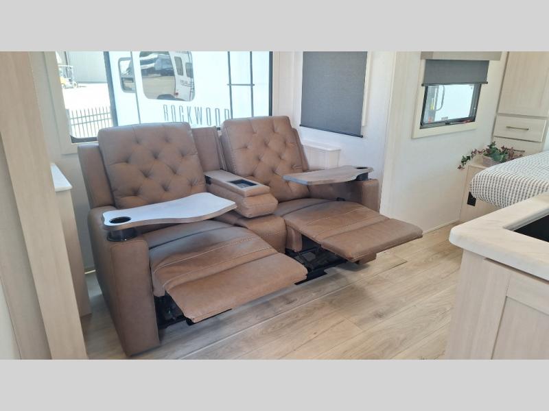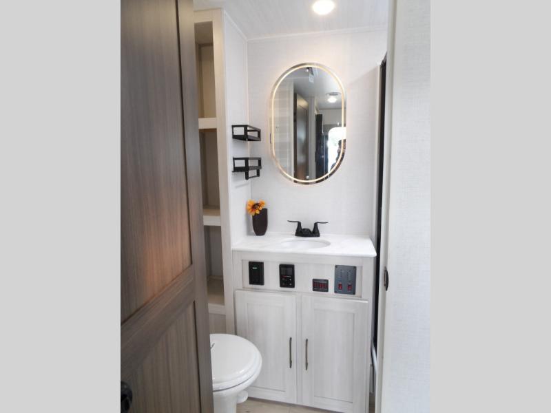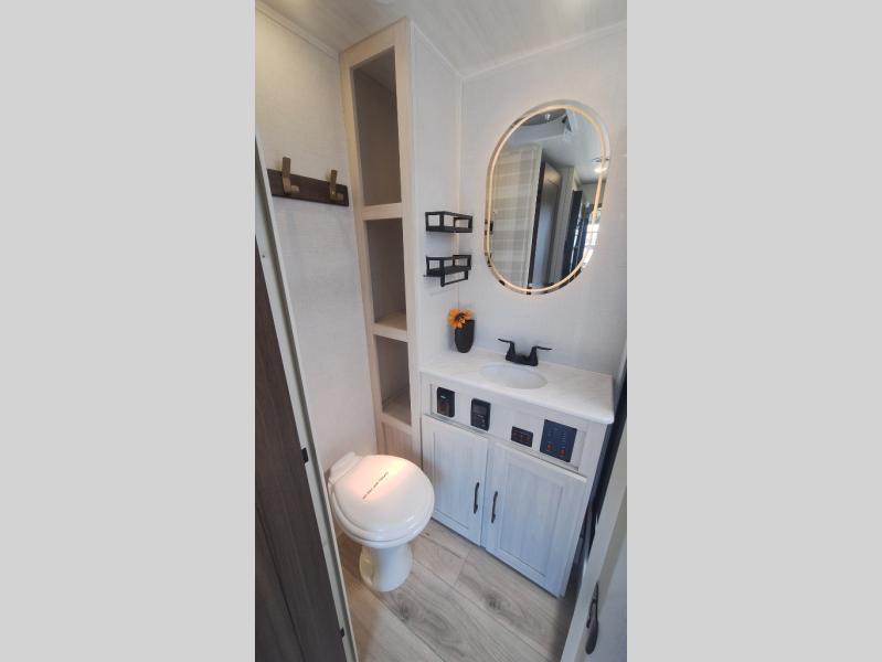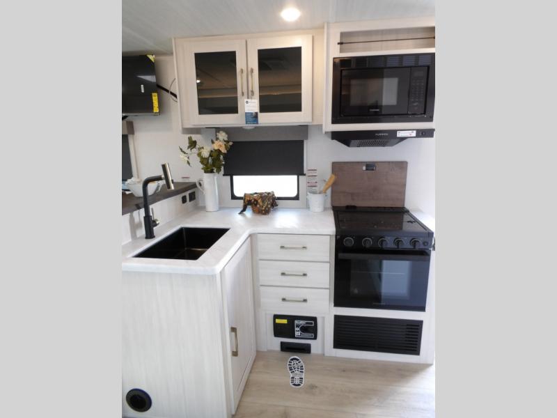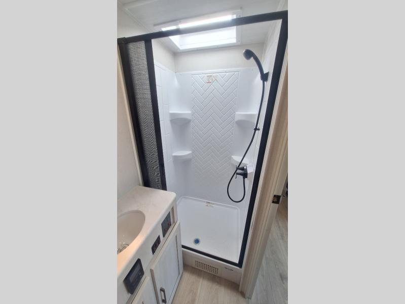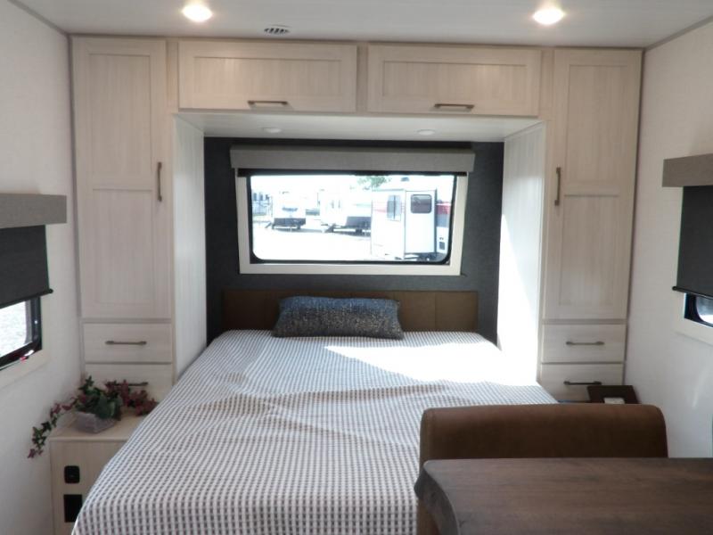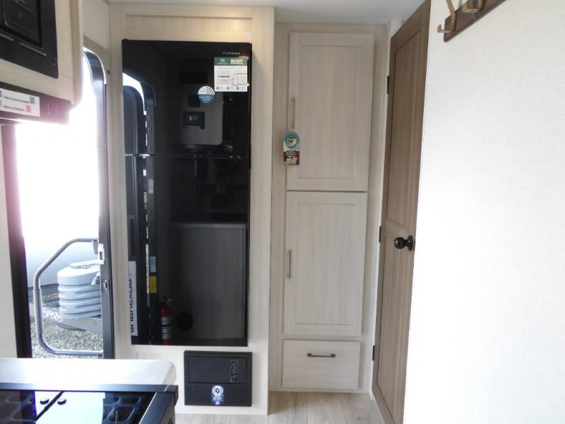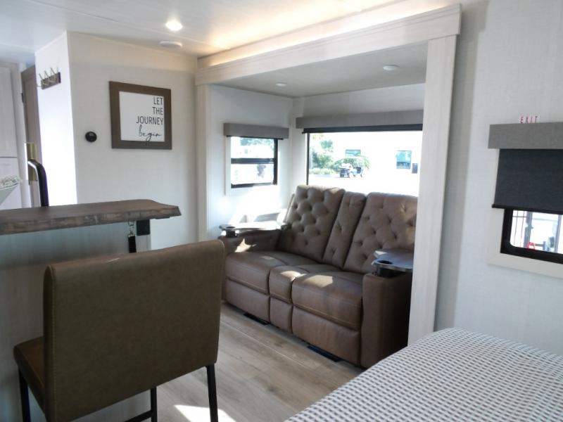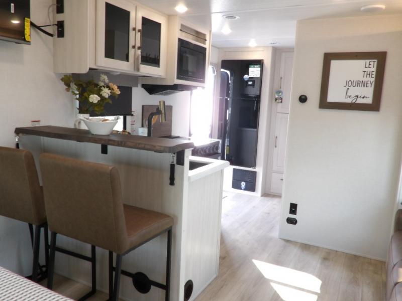 You're going to love every minute spent in this 25' travel trailer! The counter with stools will be the perfect place to enjoy your morning coffee at, plus there is a dinette slide for more seating space. You will get a great night's rest on the queen bed in the front bedroom, and the two wardrobes allow you to keep your clothes tidy. Further customize this trailer by adding the theater seating option or tri-fold sofa option in place of the dinette, and you'll enjoy the standard HD TV for late-night movies!