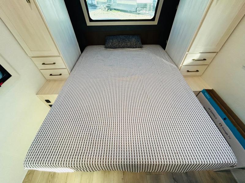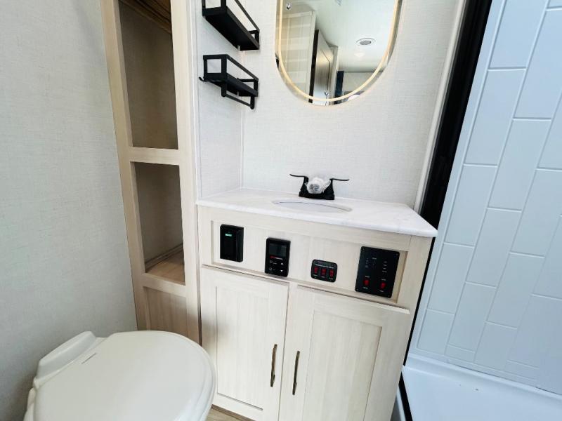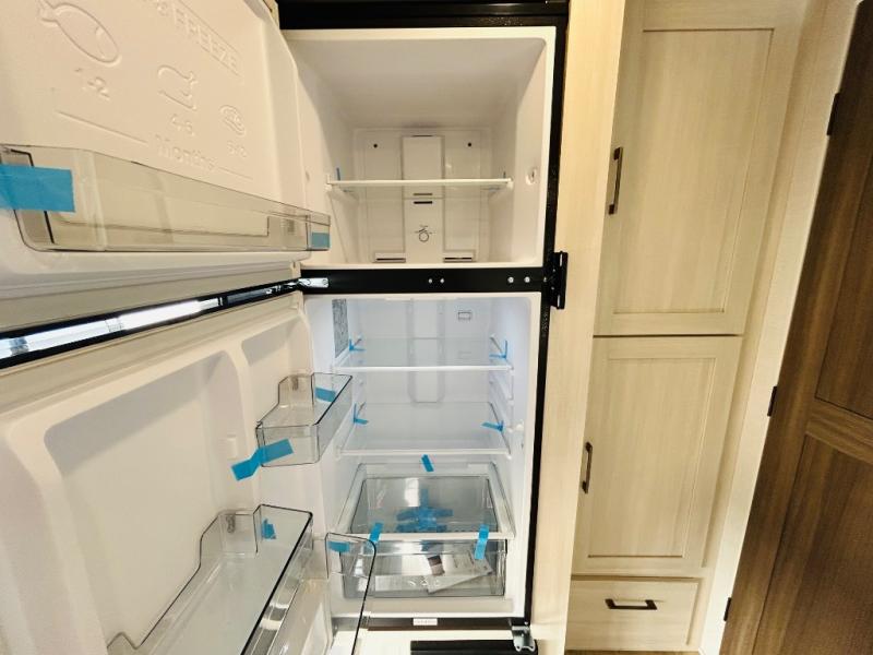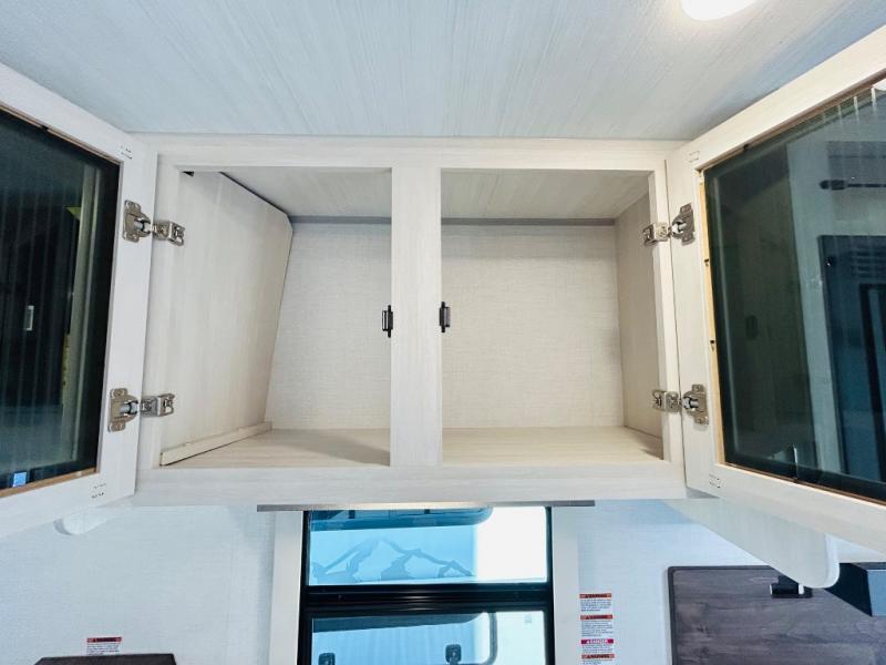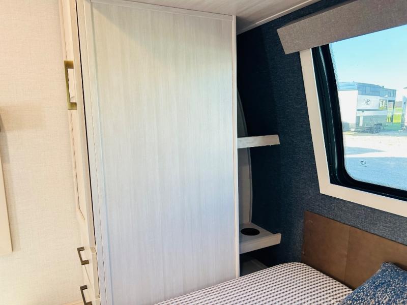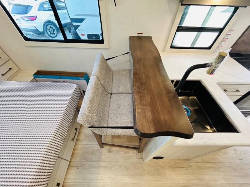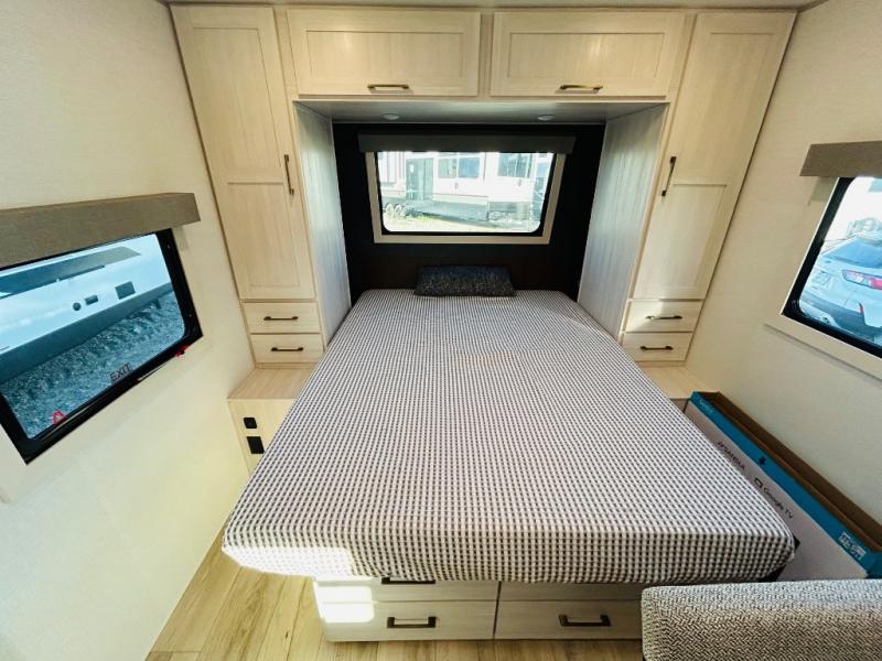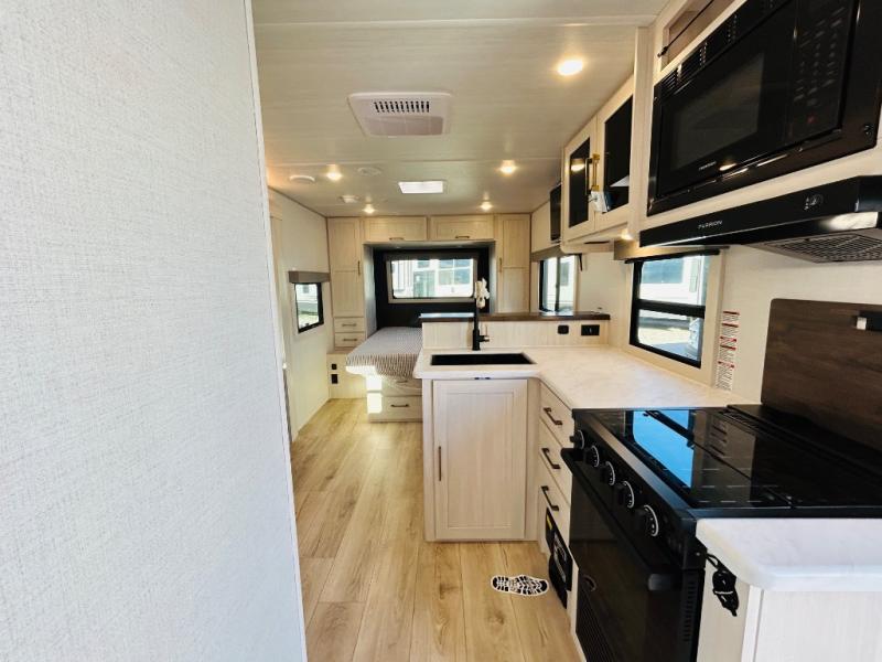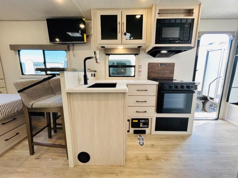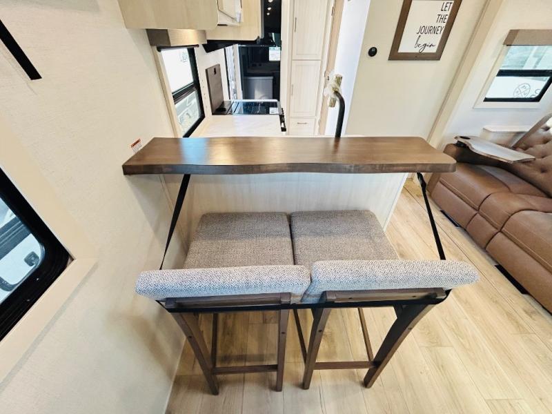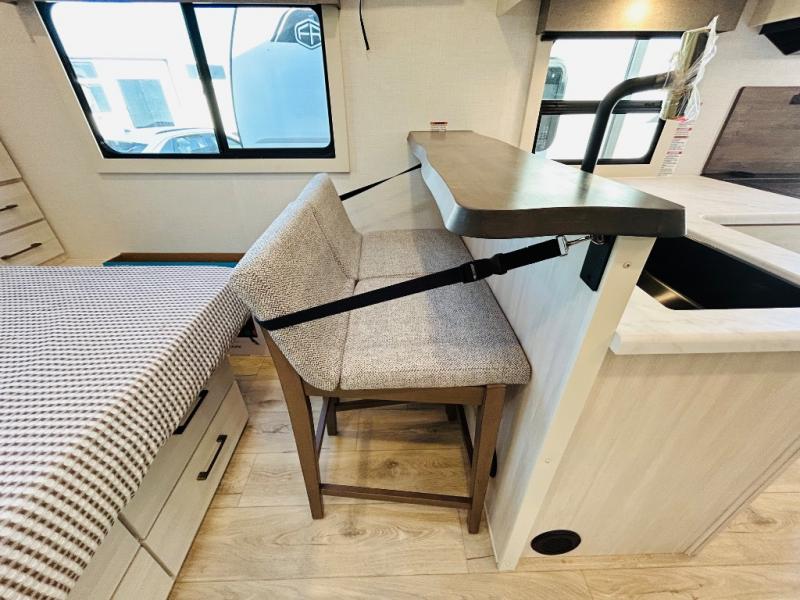 You're going to love every minute spent in this 25' travel trailer! The counter with stools will be the perfect place to enjoy your morning coffee at, plus there is a dinette slide for more seating space. You will get a great night's rest on the queen bed in the front bedroom, and the two wardrobes allow you to keep your clothes tidy. Further customize this trailer by adding the theater seating option or tri-fold sofa option in place of the dinette, and you'll enjoy the standard HD TV for late-night movies!