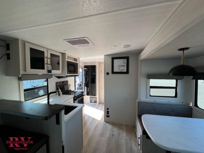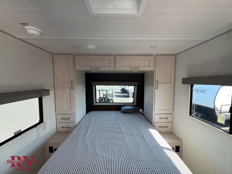 You're going to love every minute spent in this 25' travel trailer! The counter with stools will be the perfect place to enjoy your morning coffee at, plus there is a dinette slide for more seating space. You will get a great night's rest on the queen bed in the front bedroom, and the two wardrobes allow you to keep your clothes tidy. Further customize this trailer by adding the theater seating option or tri-fold sofa option in place of the dinette, and you'll enjoy the standard HD TV for late-night movies!