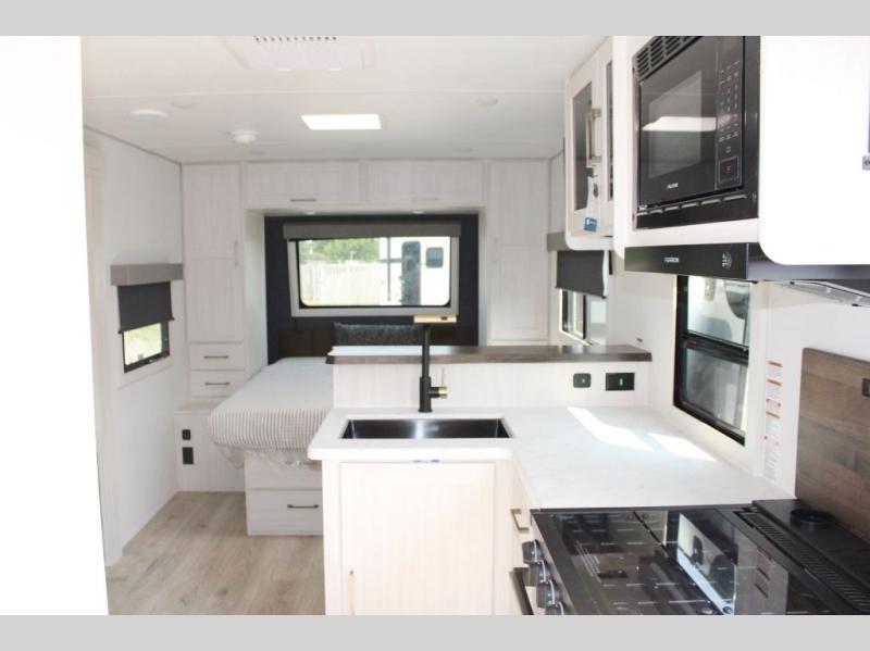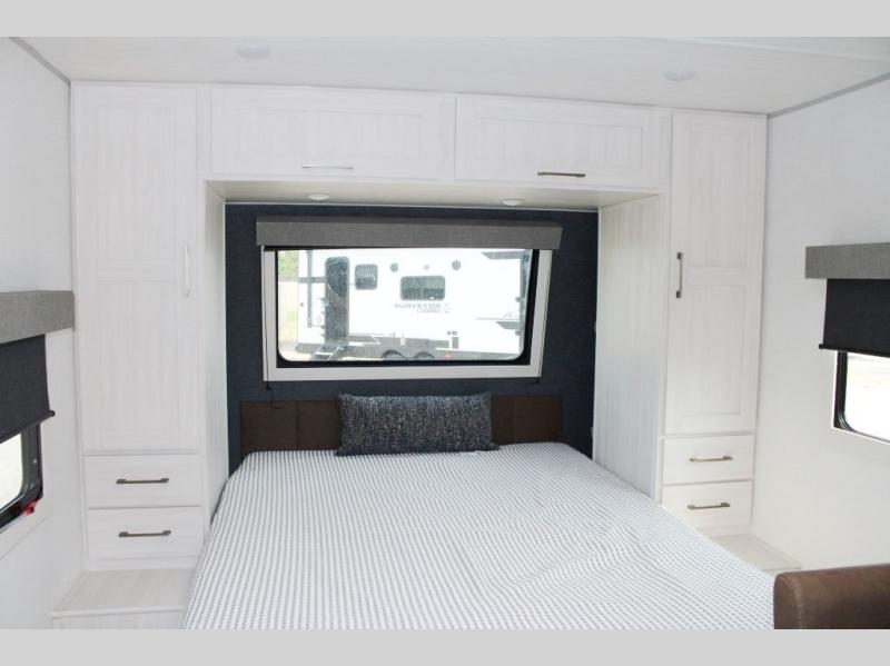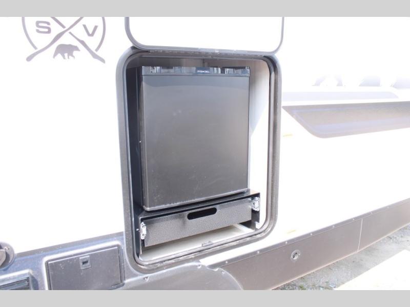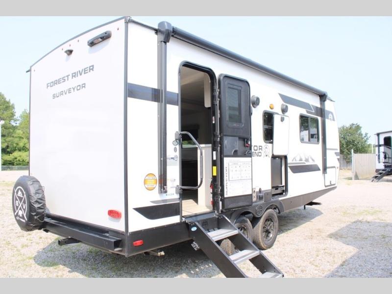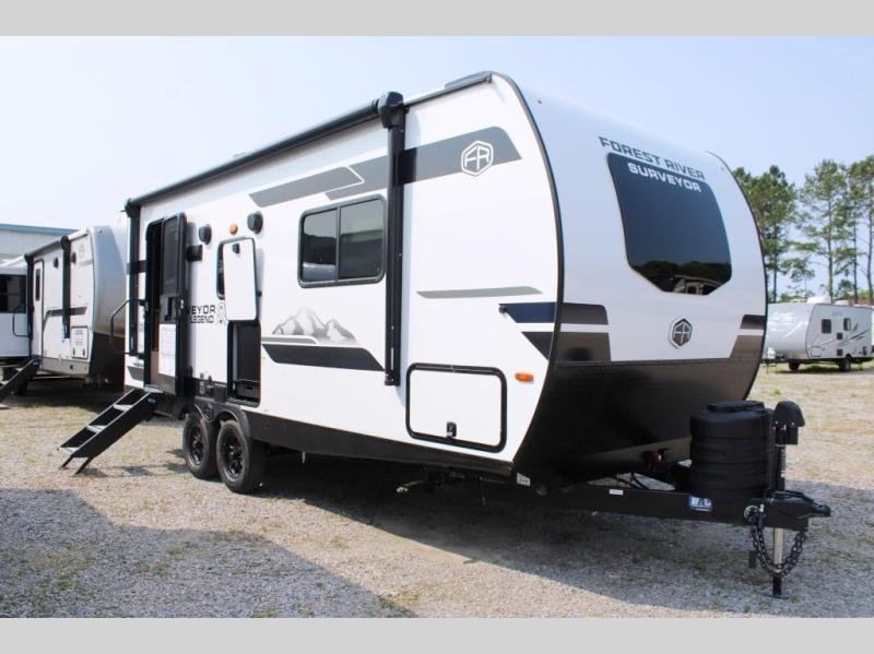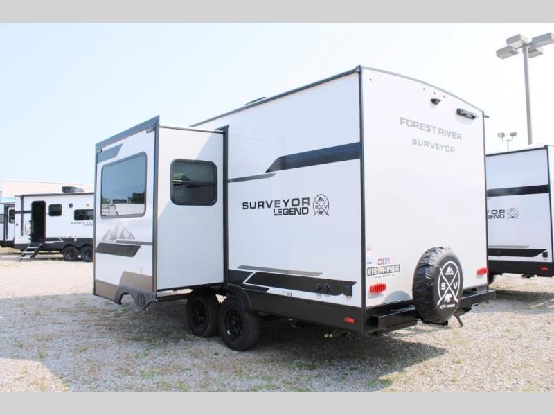 With any Surveyor Legend travel trailer by Forest River you will enjoy quality craftsmanship, convenient amenities, and at-home comforts. The Azdel composite walls provide a longer-lasting trailer, and the power tongue jack with hitch light makes getting back on the road quick and easy. There are also Goodyear® tires and a tire pressure monitoring system (TPMS) for more confident, hassle-free towing. Each model is built with thoughtful details like slam-latch exterior baggage doors and an automotive-style tinted front windshield that gives the front cap a sleek look while letting in natural light. You’ll appreciate camping with a tankless water heater for endless hot showers, a 2" rear accessory hitch to bring bikes or extra gear along, plus a central vacuum system that helps keep your easy-to-clean interior looking fresh.