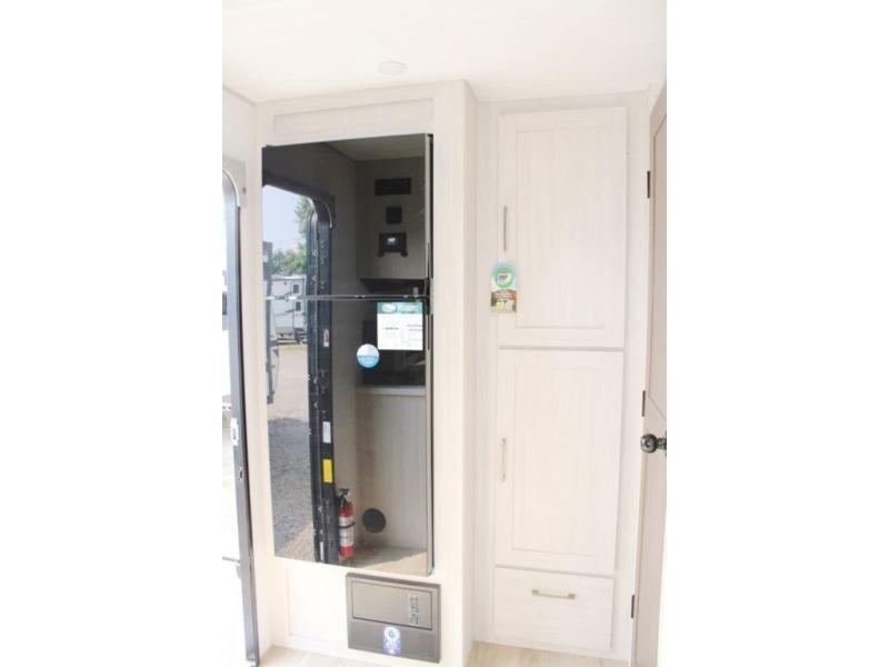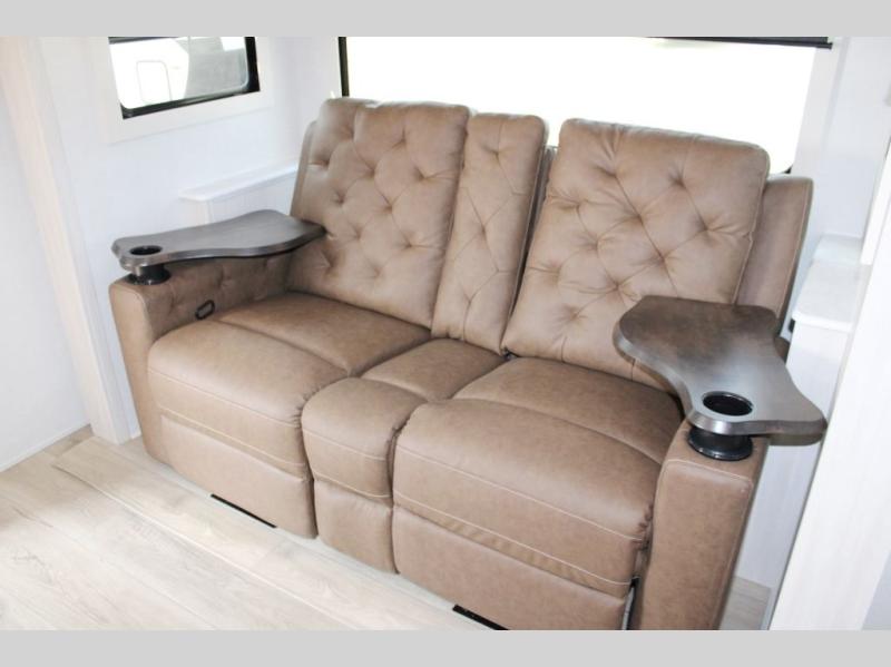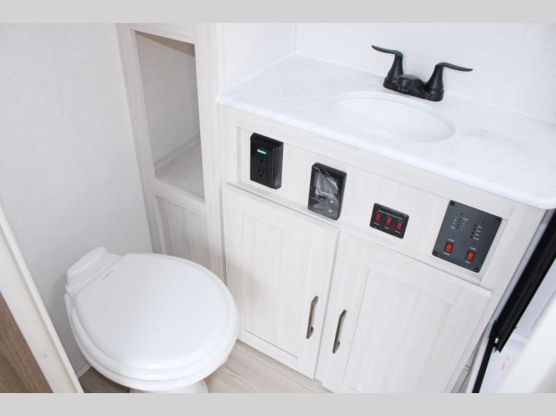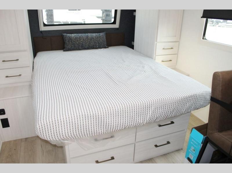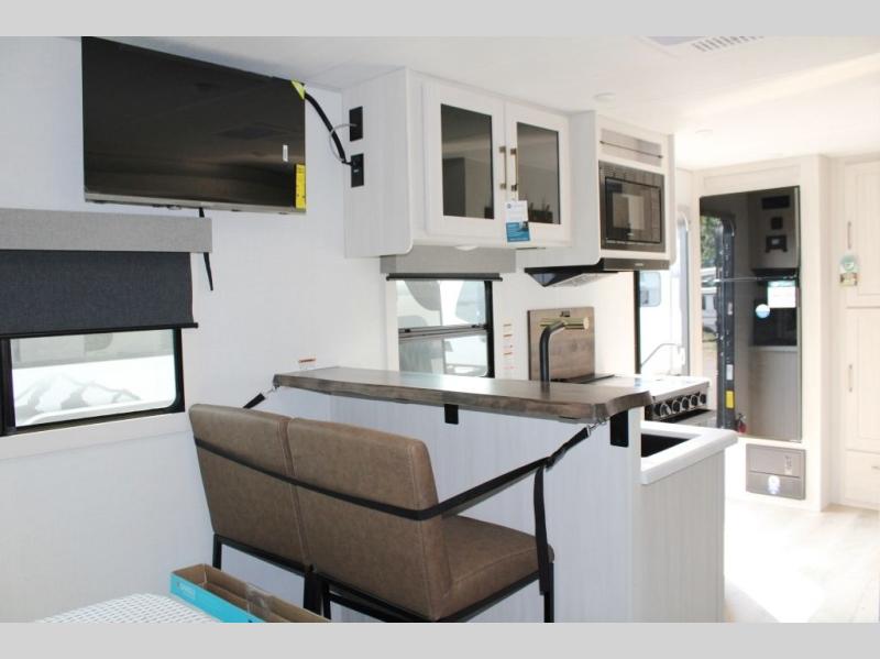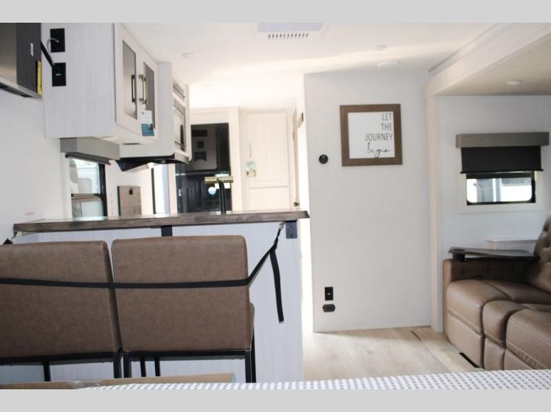 You're going to love every minute spent in this 25' travel trailer! The counter with stools will be the perfect place to enjoy your morning coffee at, plus there is a dinette slide for more seating space. You will get a great night's rest on the queen bed in the front bedroom, and the two wardrobes allow you to keep your clothes tidy. Further customize this trailer by adding the theater seating option or tri-fold sofa option in place of the dinette, and you'll enjoy the standard HD TV for late-night movies!
