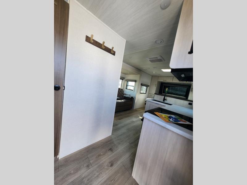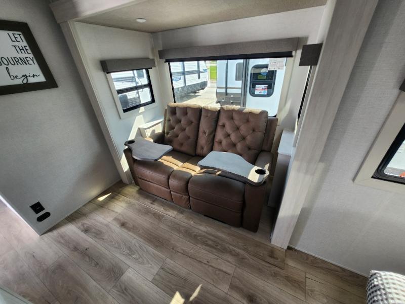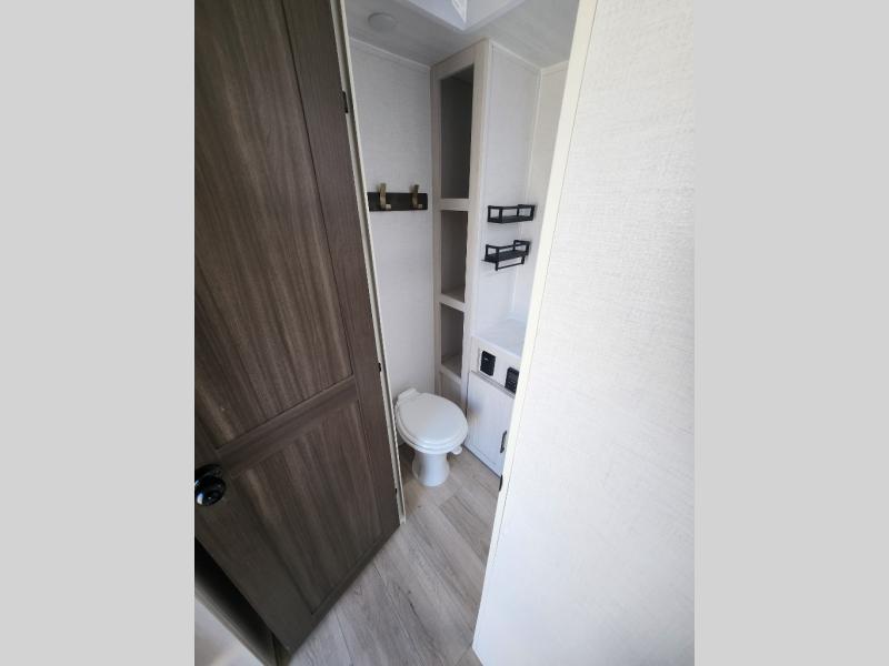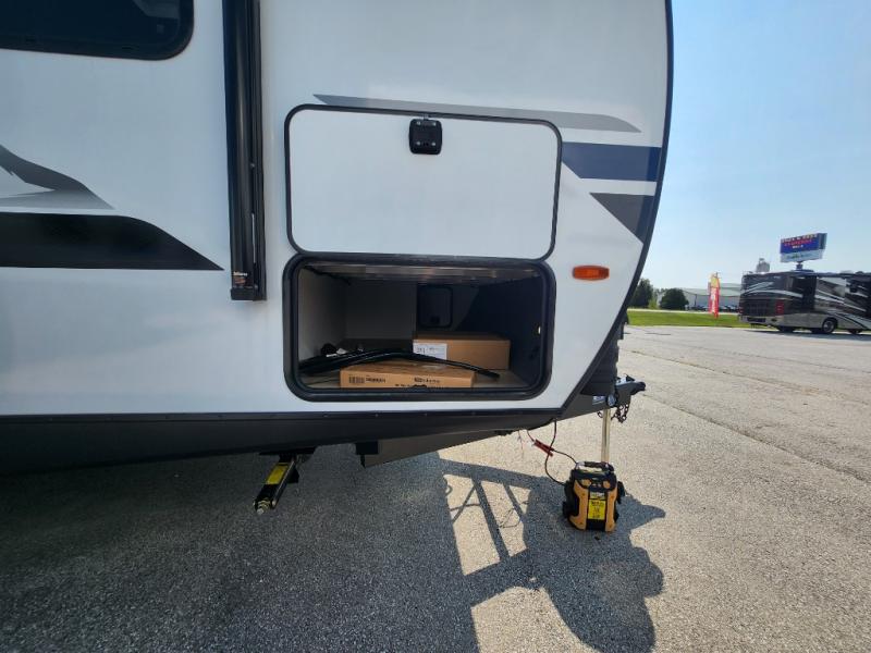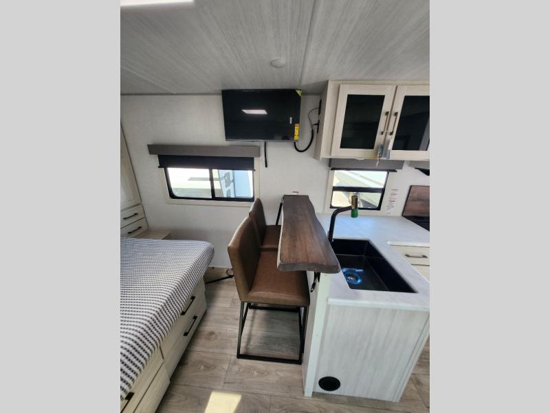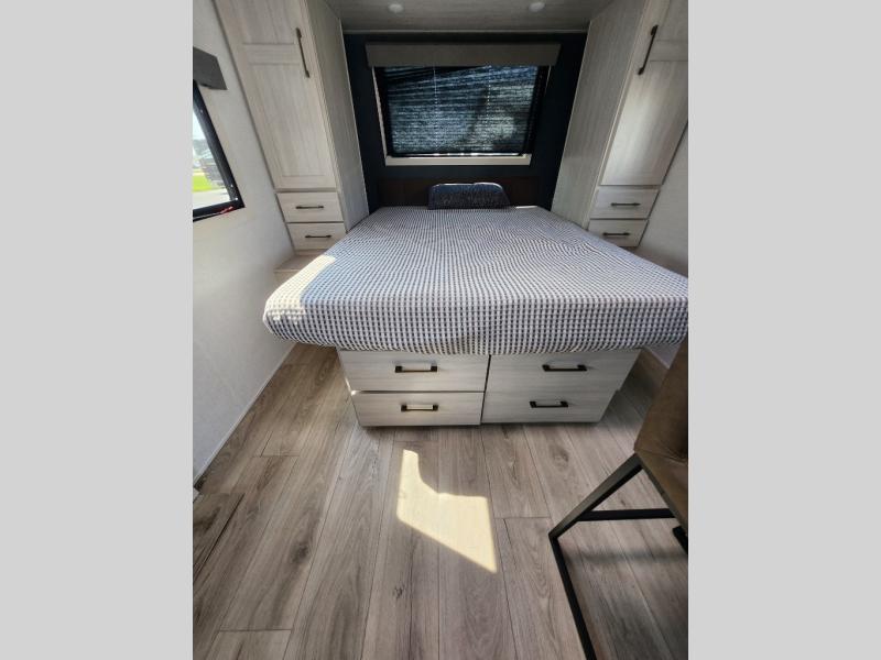 You're going to love every minute spent in this 25' travel trailer! The counter with stools will be the perfect place to enjoy your morning coffee at, plus there is a dinette slide for more seating space. You will get a great night's rest on the queen bed in the front bedroom, and the two wardrobes allow you to keep your clothes tidy. Further customize this trailer by adding the theater seating option or tri-fold sofa option in place of the dinette, and you'll enjoy the standard HD TV for late-night movies!