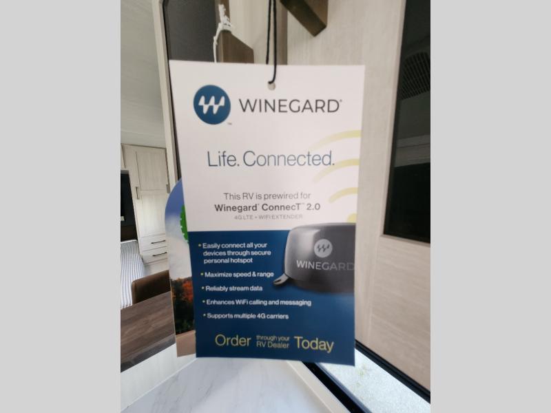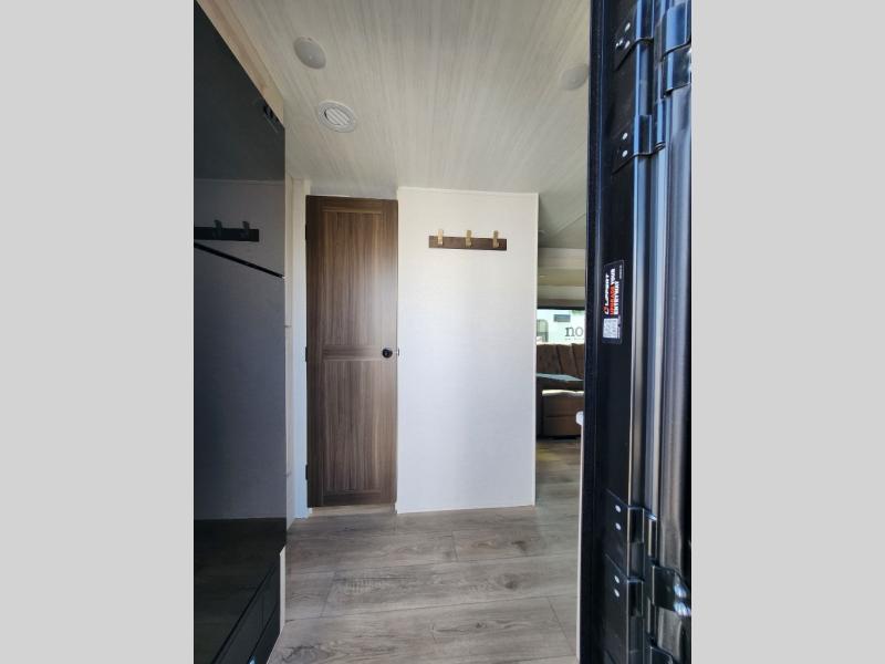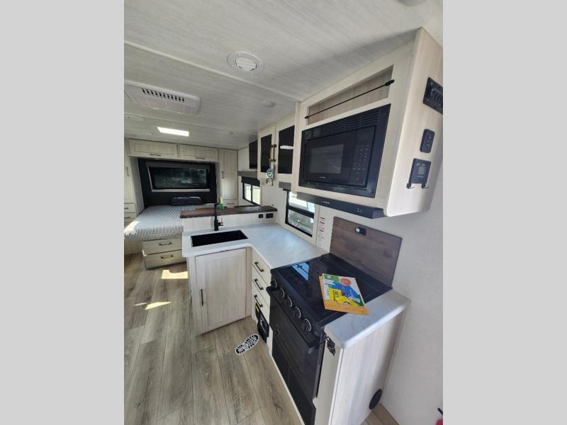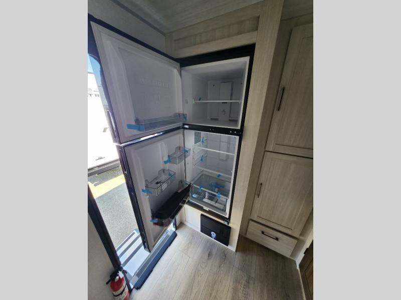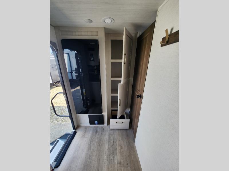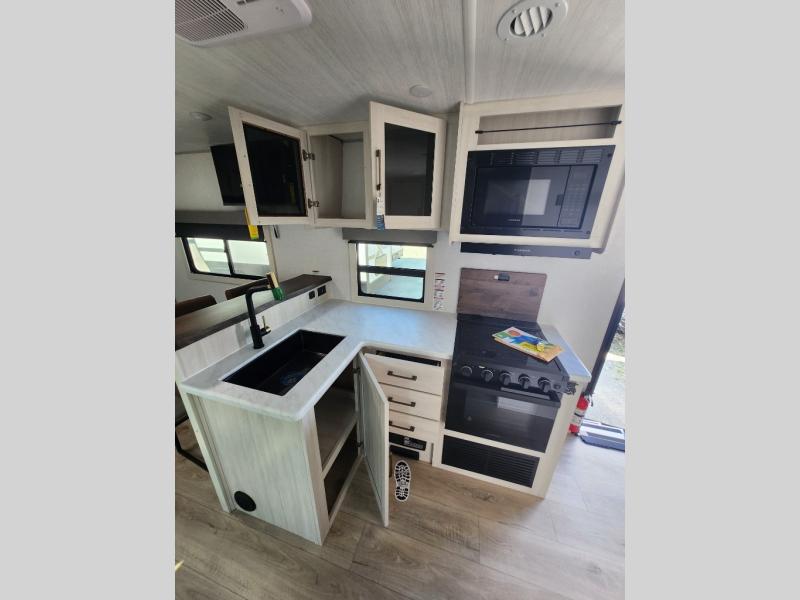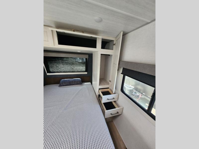 You're going to love every minute spent in this 25' travel trailer! The counter with stools will be the perfect place to enjoy your morning coffee at, plus there is a dinette slide for more seating space. You will get a great night's rest on the queen bed in the front bedroom, and the two wardrobes allow you to keep your clothes tidy. Further customize this trailer by adding the theater seating option or tri-fold sofa option in place of the dinette, and you'll enjoy the standard HD TV for late-night movies!