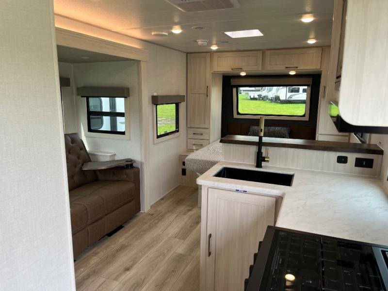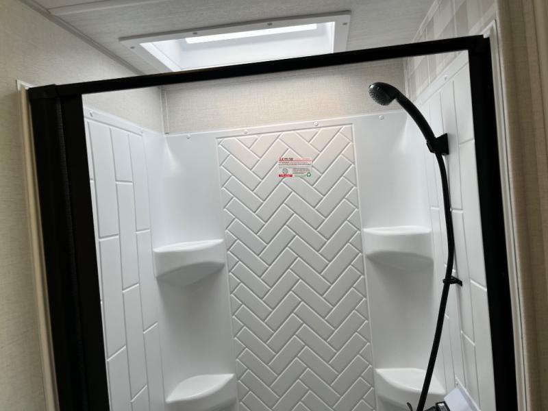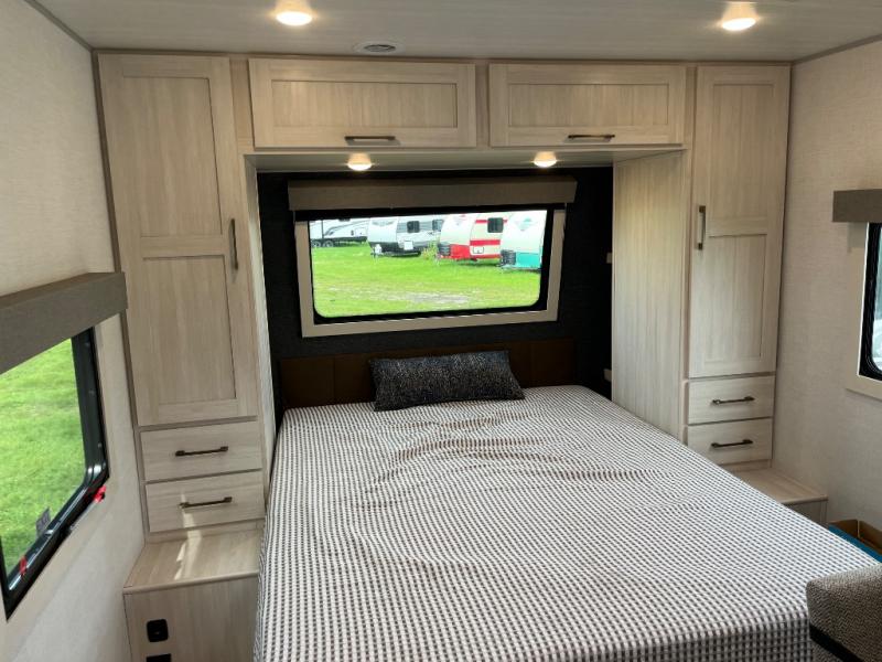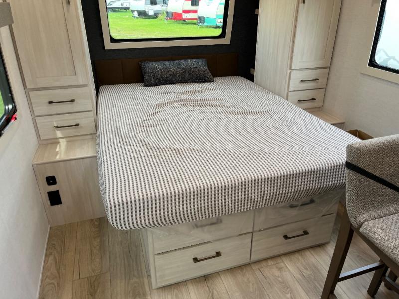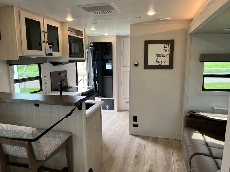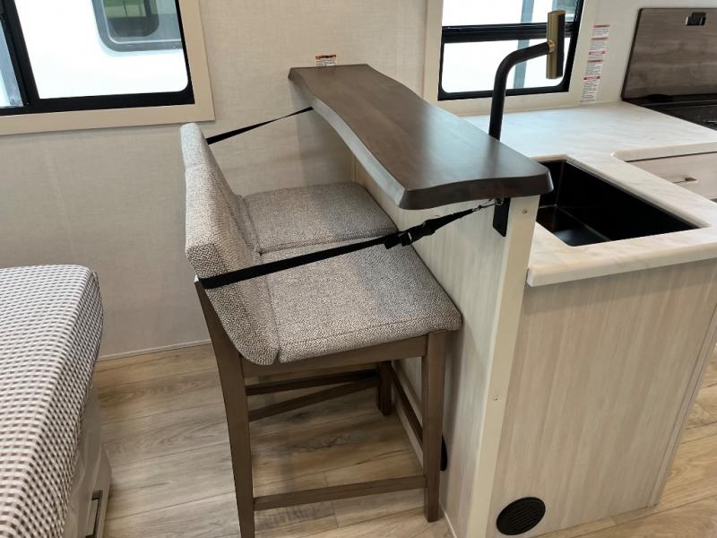 You're going to love every minute spent in this 25' travel trailer! The counter with stools will be the perfect place to enjoy your morning coffee at, plus there is a dinette slide for more seating space. You will get a great night's rest on the queen bed in the front bedroom, and the two wardrobes allow you to keep your clothes tidy. Further customize this trailer by adding the theater seating option or tri-fold sofa option in place of the dinette, and you'll enjoy the standard HD TV for late-night movies!