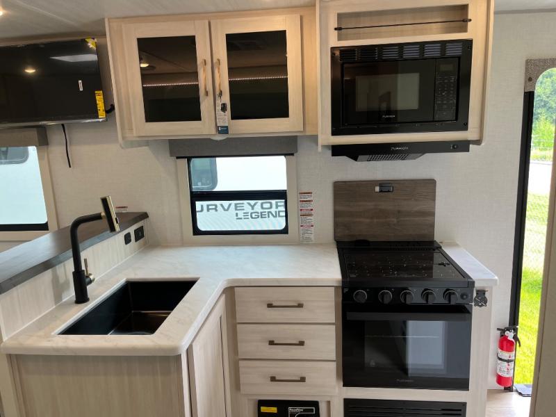 With any Surveyor Legend travel trailer by Forest River you will enjoy quality craftsmanship, convenient amenities, and at-home comforts. The Azdel composite walls provide a longer-lasting trailer, and the power tongue jack with a hitch light will get you back on the road in no-time. There are also Goodyear tires and a tire pressure monitoring system for hassle-free towing. Each model includes the Surveyor Legend Package that comes standard with oversized dinette storage access doors, front slam latch baggage doors, plus an automotive style tinted front windshield. You'll appreciate camping with a tankless water heater for endless hot showers, a 2" accessory hitch to bring bikes along, plus carpet-free interiors and a central vacuum system for easy clean up.