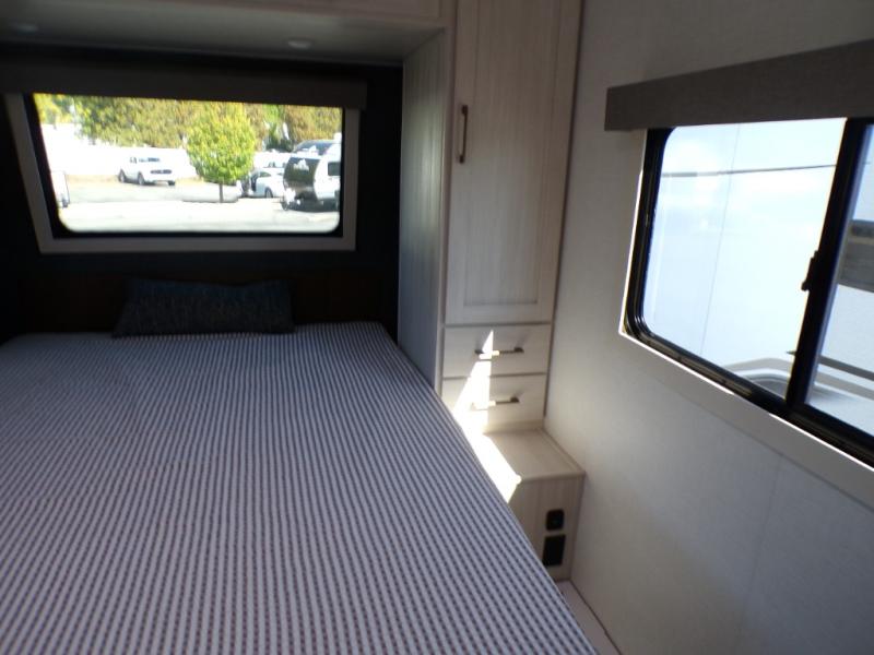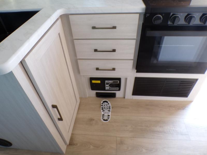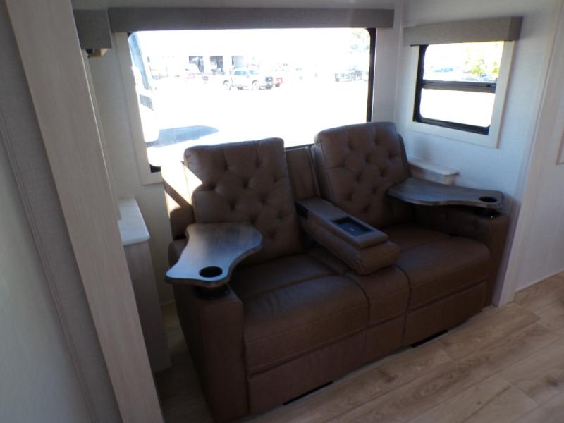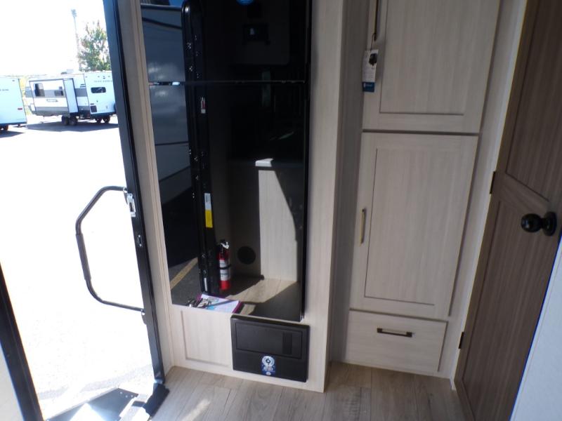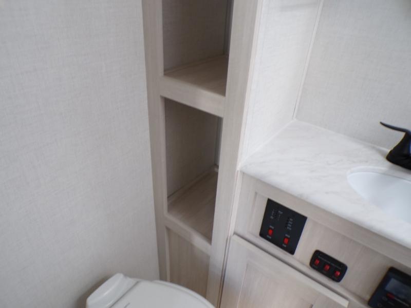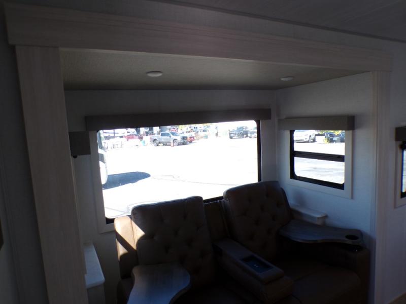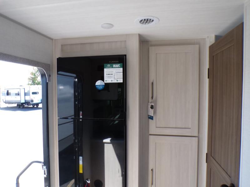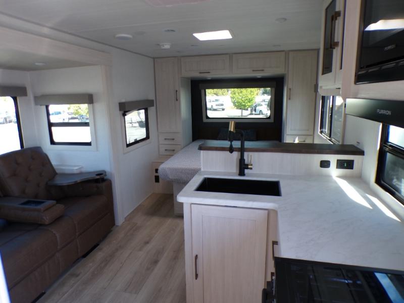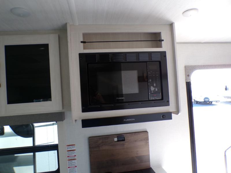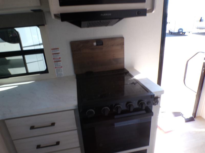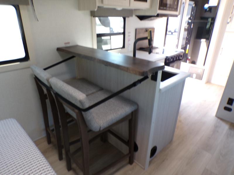 You're going to love every minute spent in this 25' travel trailer! The counter with stools will be the perfect place to enjoy your morning coffee at, plus there is a dinette slide for more seating space. You will get a great night's rest on the queen bed in the front bedroom, and the two wardrobes allow you to keep your clothes tidy. Further customize this trailer by adding the theater seating option or tri-fold sofa option in place of the dinette, and you'll enjoy the standard HD TV for late-night movies!