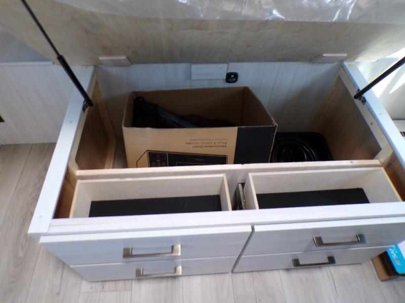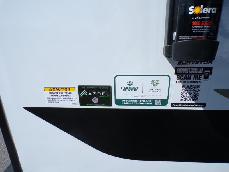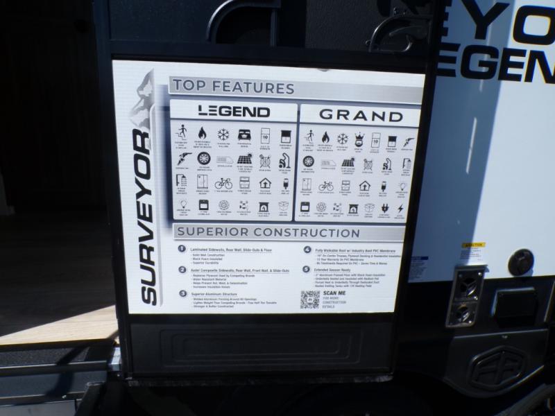 With any Surveyor Legend travel trailer by Forest River you will enjoy quality craftsmanship, convenient amenities, and at-home comforts. The Azdel composite walls provide a longer-lasting trailer, and the power tongue jack with a hitch light will get you back on the road in no-time. There are also Goodyear tires and a tire pressure monitoring system for hassle-free towing. Each model includes the Surveyor Legend Package that comes standard with oversized dinette storage access doors, front slam latch baggage doors, plus an automotive style tinted front windshield. You'll appreciate camping with a tankless water heater for endless hot showers, a 2" accessory hitch to bring bikes along, plus carpet-free interiors and a central vacuum system for easy clean up.