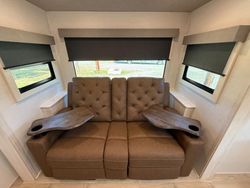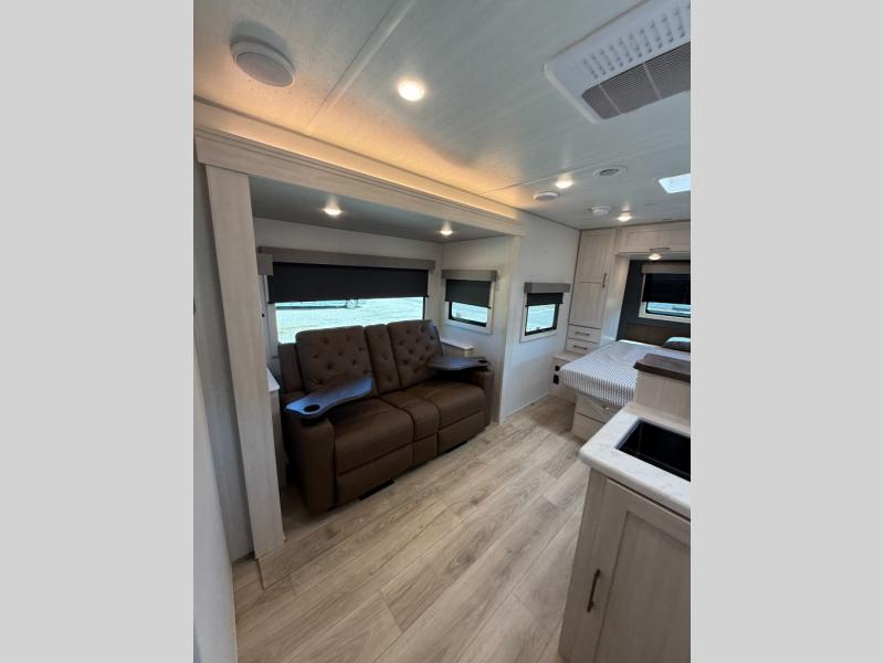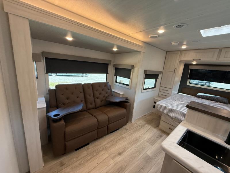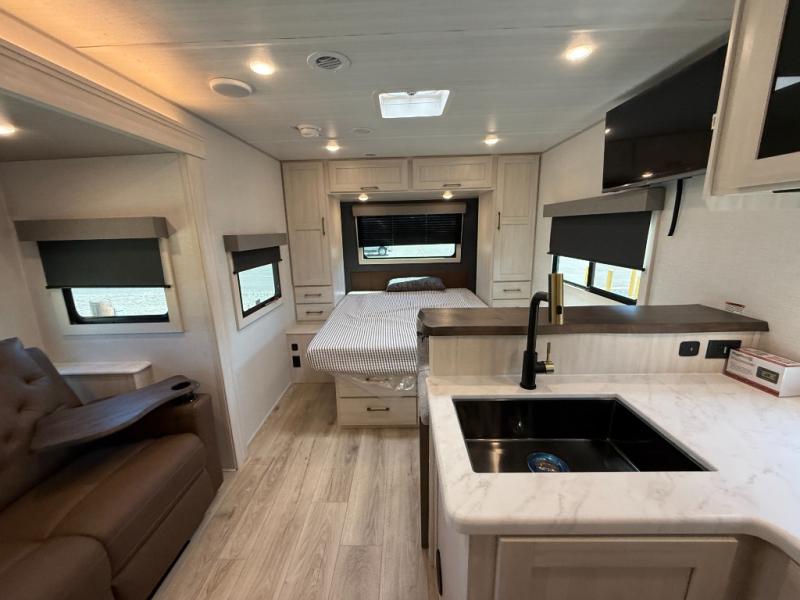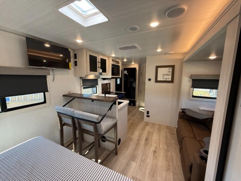You're going to love every minute spent in this 25' travel trailer! The counter with stools will be the perfect place to enjoy your morning coffee at, plus there is a dinette slide for more seating space. You will get a great night's rest on the queen bed in the front bedroom, and the two wardrobes allow you to keep your clothes tidy. Further customize this trailer by adding the theater seating option or tri-fold sofa option in place of the dinette, and you'll enjoy the standard HD TV for late-night movies!