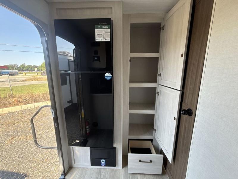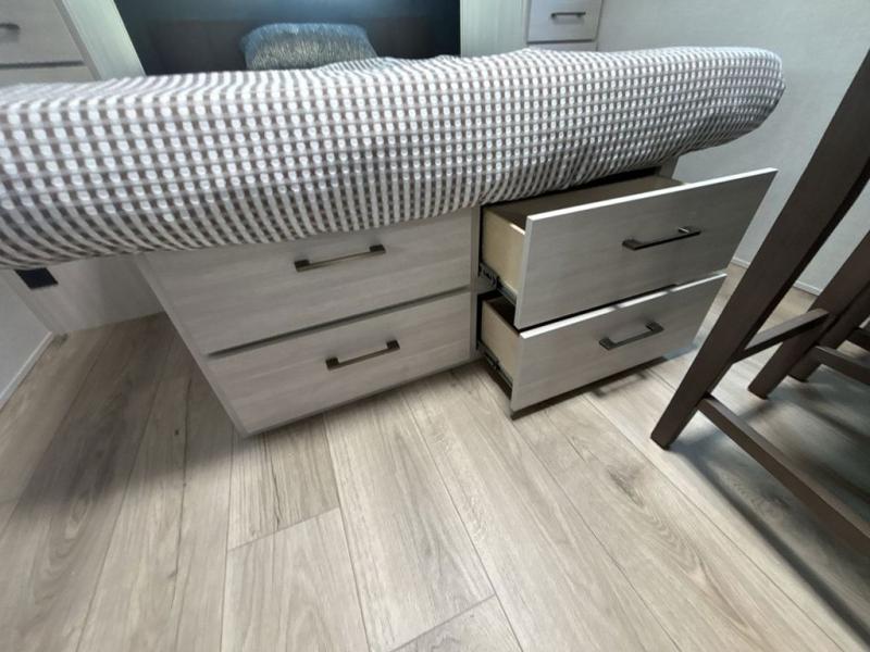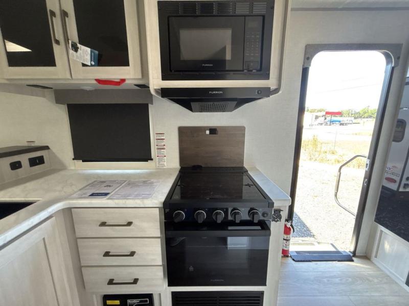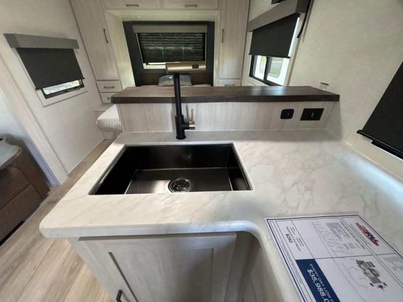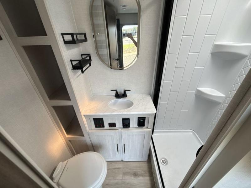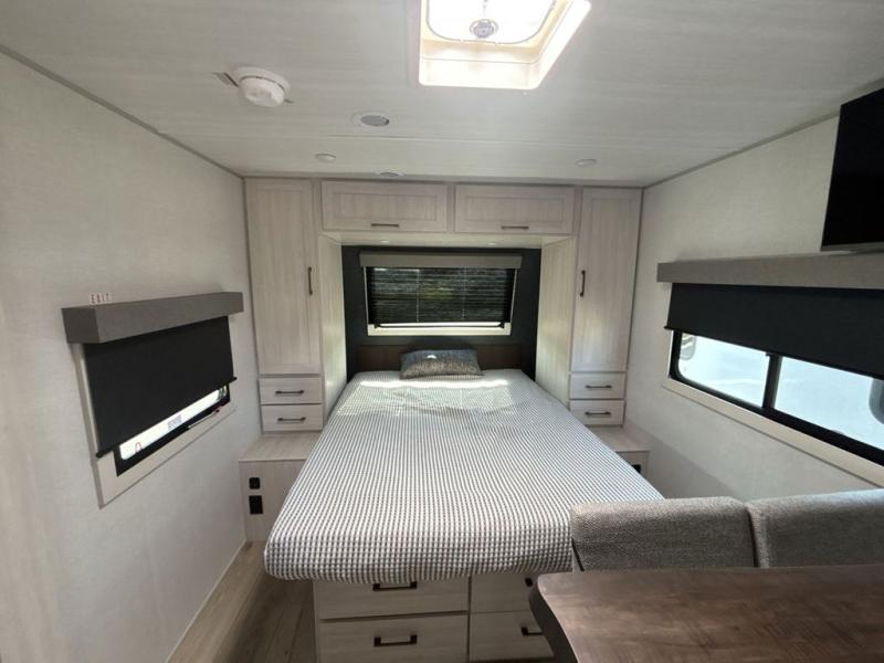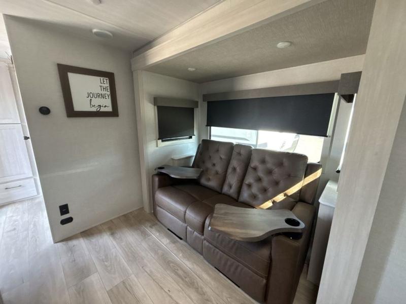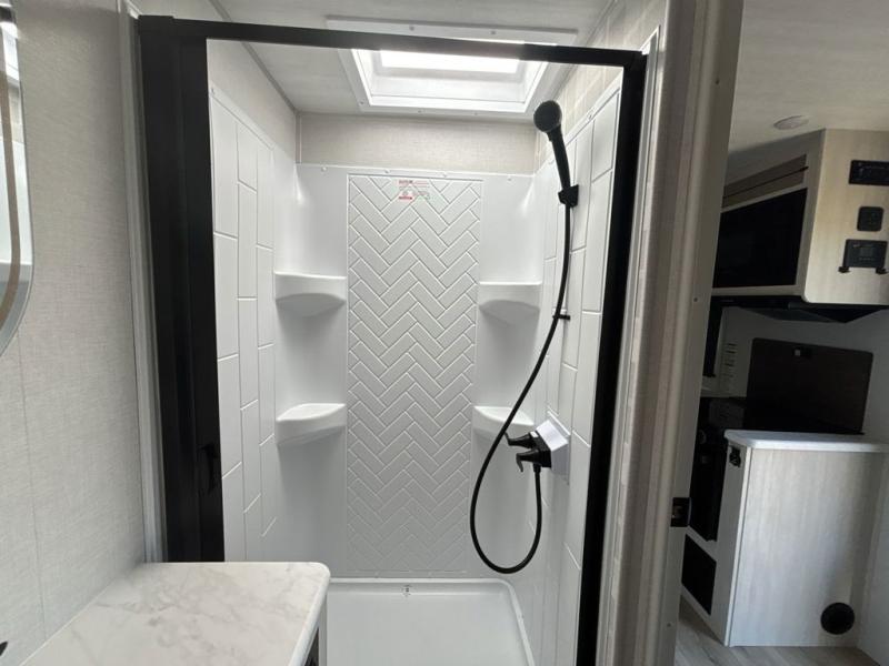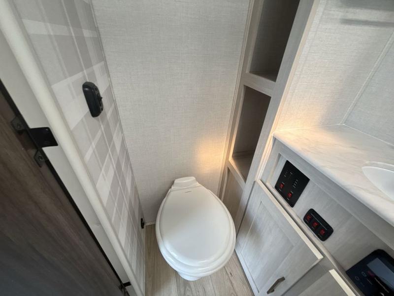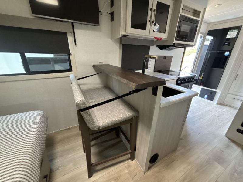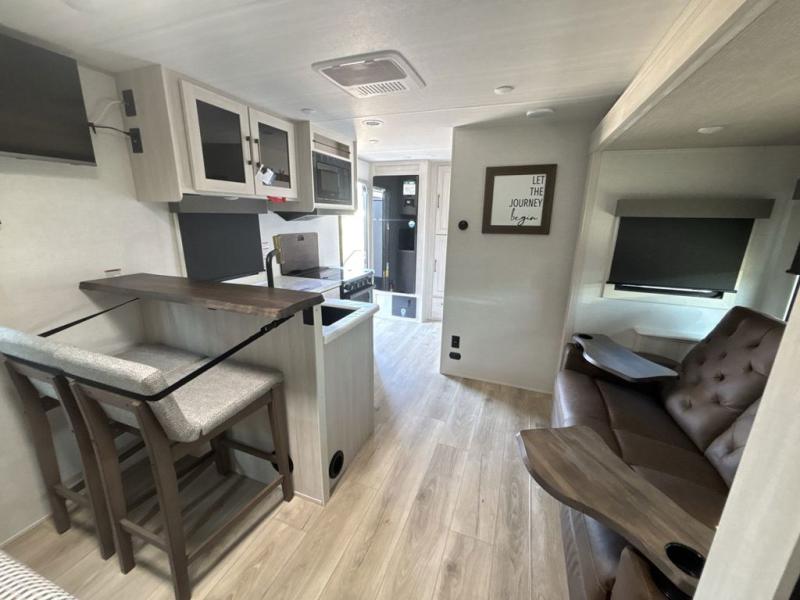You're going to love every minute spent in this 25' travel trailer! The counter with stools will be the perfect place to enjoy your morning coffee at, plus there is a dinette slide for more seating space. You will get a great night's rest on the queen bed in the front bedroom, and the two wardrobes allow you to keep your clothes tidy. Further customize this trailer by adding the theater seating option or tri-fold sofa option in place of the dinette, and you'll enjoy the standard HD TV for late-night movies!