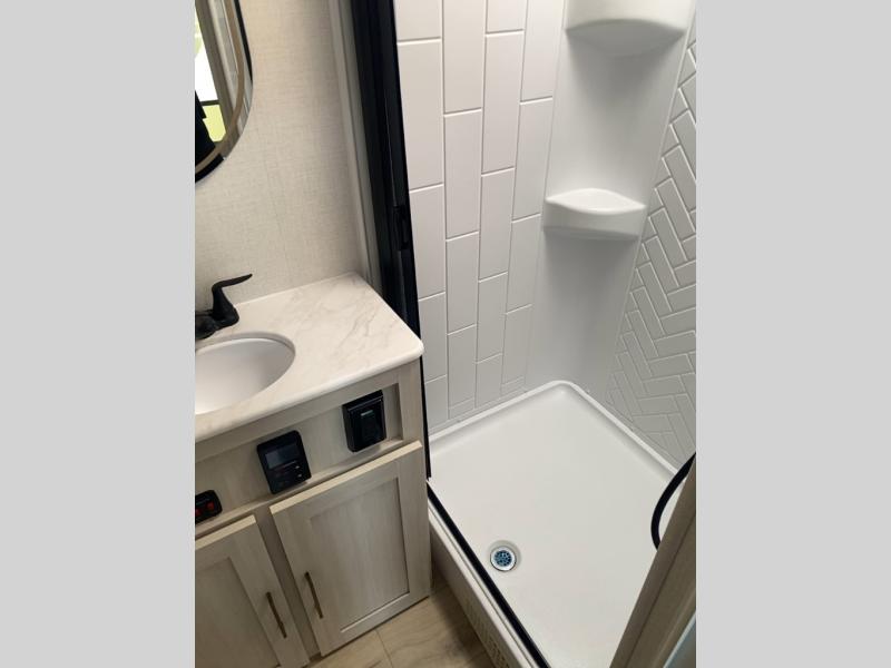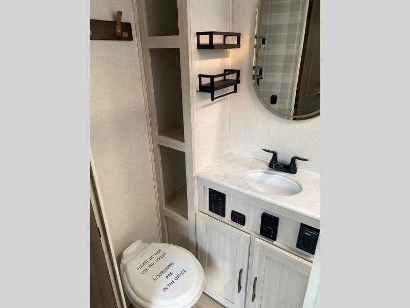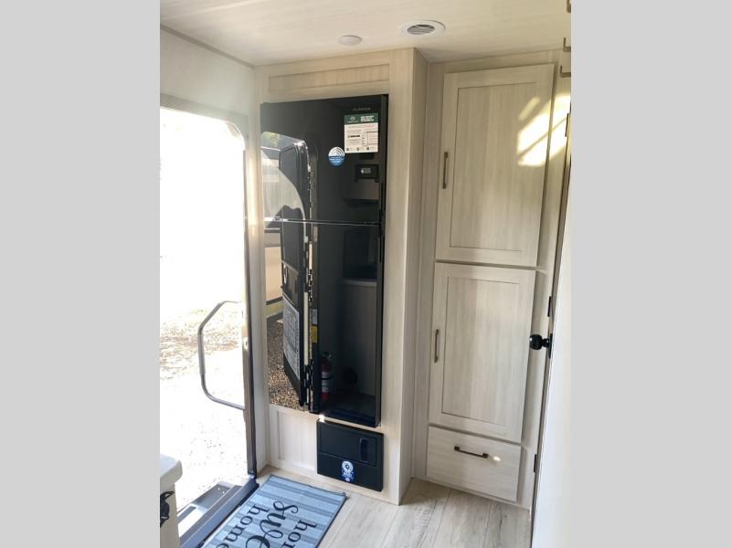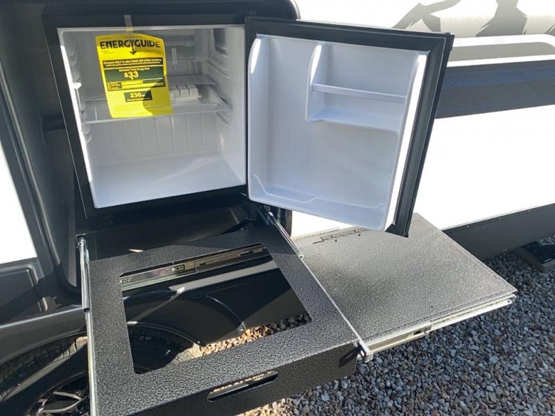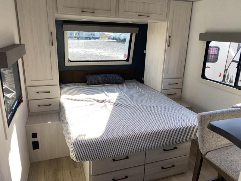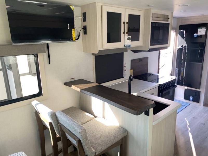 You're going to love every minute spent in this 25' travel trailer! The counter with stools will be the perfect place to enjoy your morning coffee at, plus there is a dinette slide for more seating space. You will get a great night's rest on the queen bed in the front bedroom, and the two wardrobes allow you to keep your clothes tidy. Further customize this trailer by adding the theater seating option or tri-fold sofa option in place of the dinette, and you'll enjoy the standard HD TV for late-night movies!