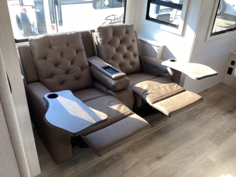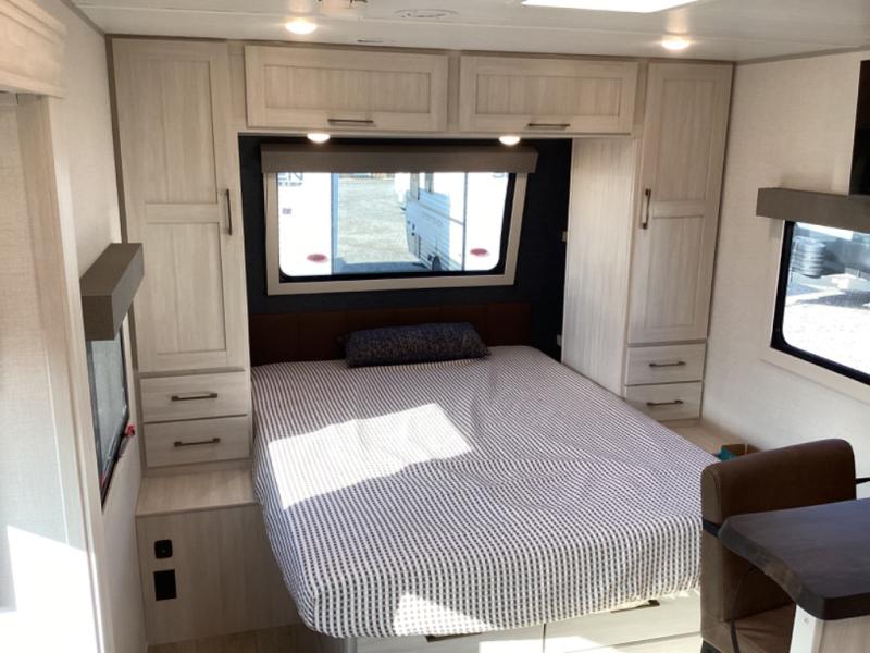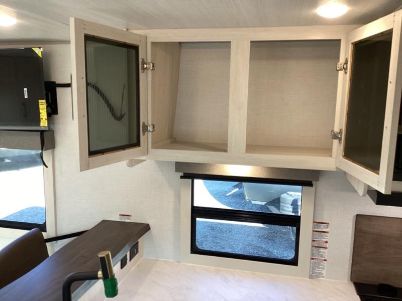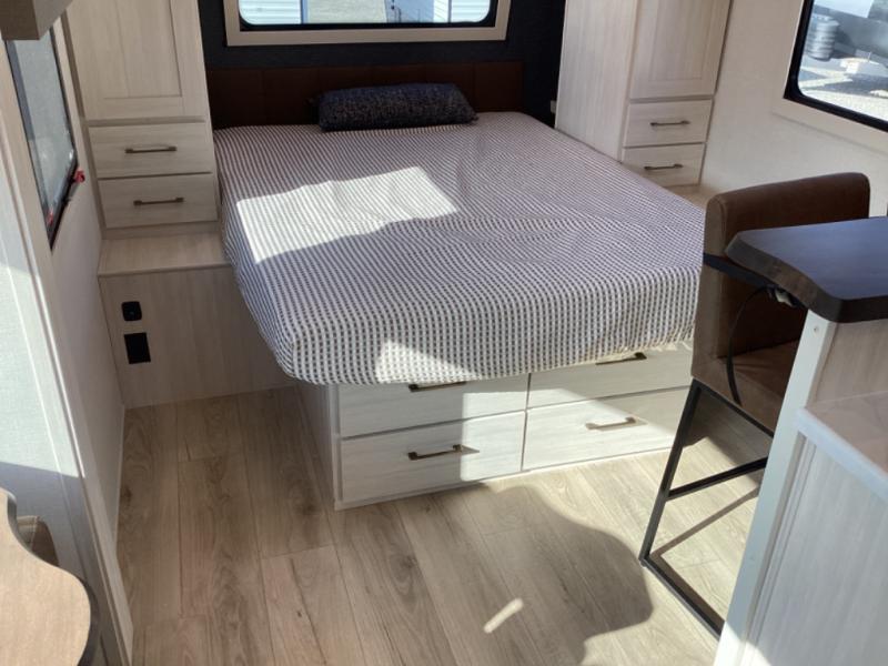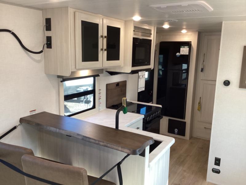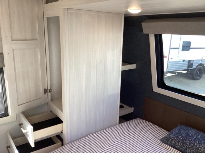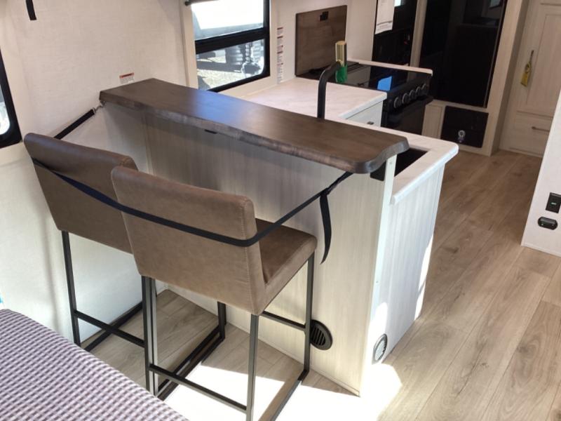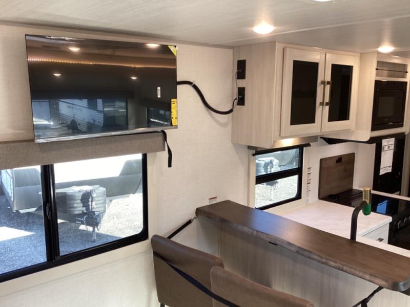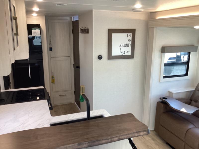 You're going to love every minute spent in this 25' travel trailer! The counter with stools will be the perfect place to enjoy your morning coffee at, plus there is a dinette slide for more seating space. You will get a great night's rest on the queen bed in the front bedroom, and the two wardrobes allow you to keep your clothes tidy. Further customize this trailer by adding the theater seating option or tri-fold sofa option in place of the dinette, and you'll enjoy the standard HD TV for late-night movies!