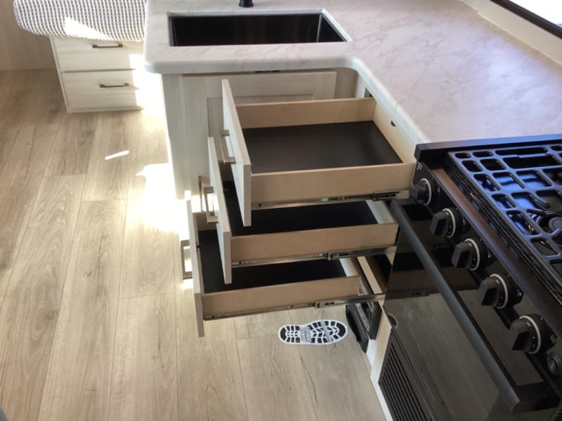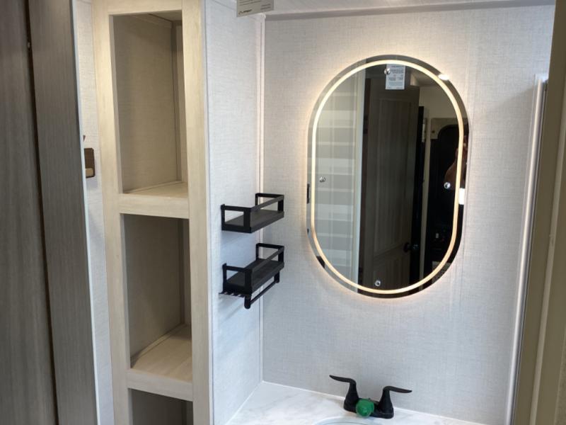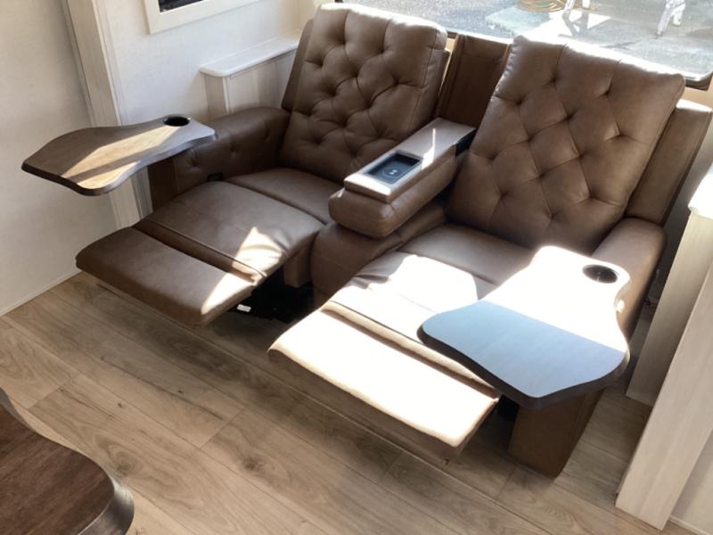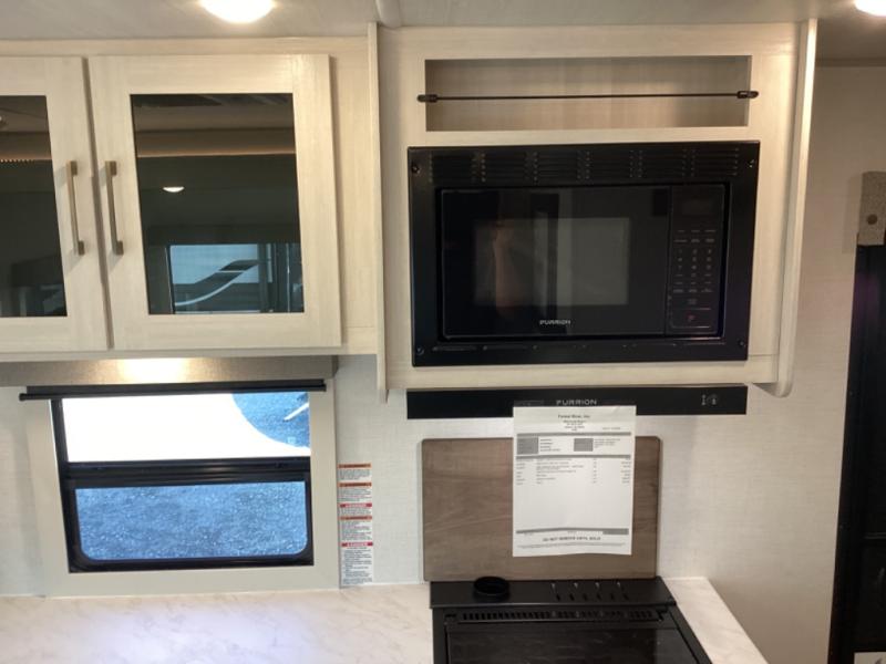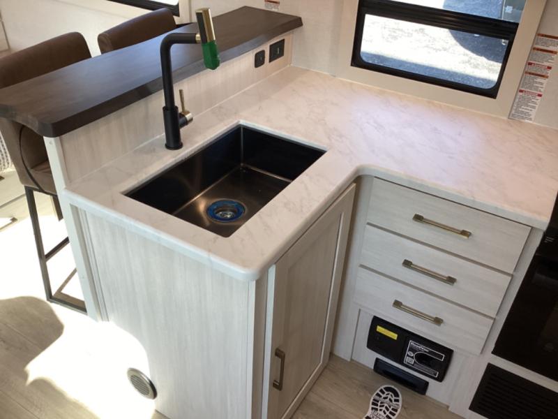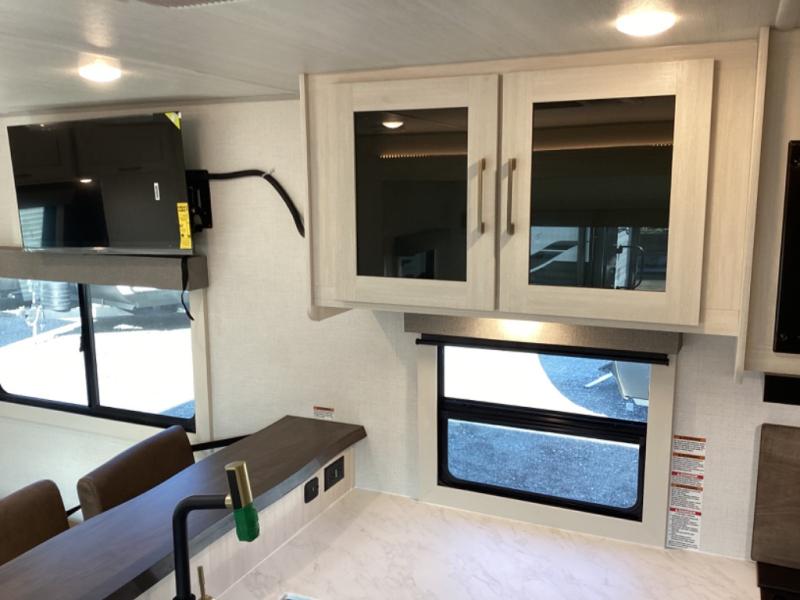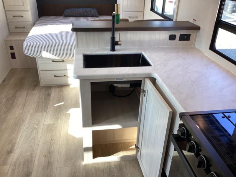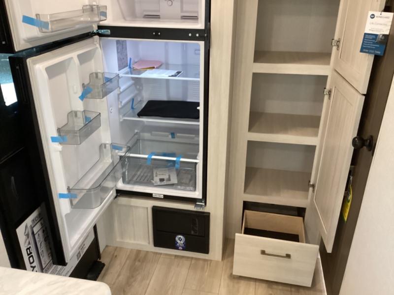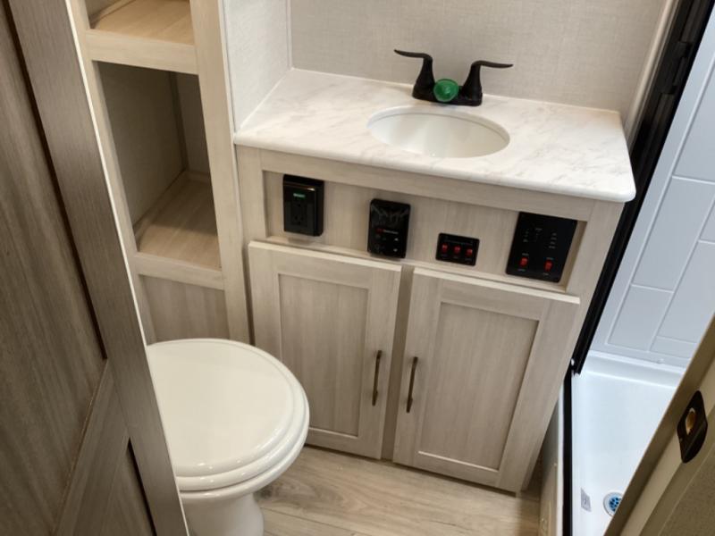 You're going to love every minute spent in this 25' travel trailer! The counter with stools will be the perfect place to enjoy your morning coffee at, plus there is a dinette slide for more seating space. You will get a great night's rest on the queen bed in the front bedroom, and the two wardrobes allow you to keep your clothes tidy. Further customize this trailer by adding the theater seating option or tri-fold sofa option in place of the dinette, and you'll enjoy the standard HD TV for late-night movies!