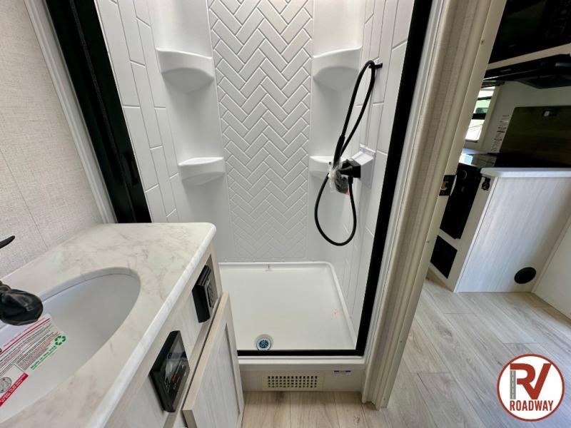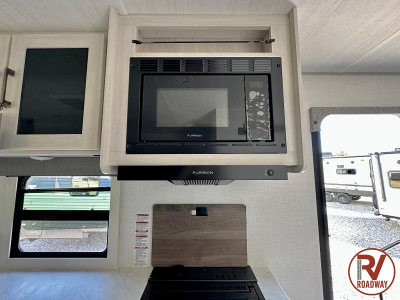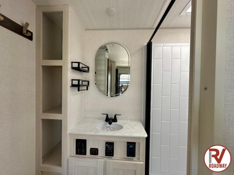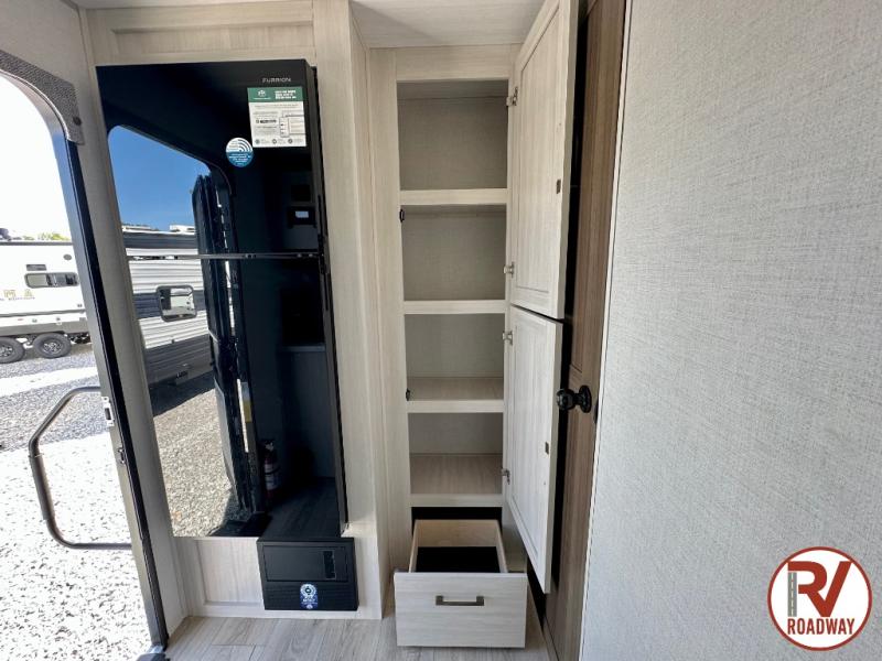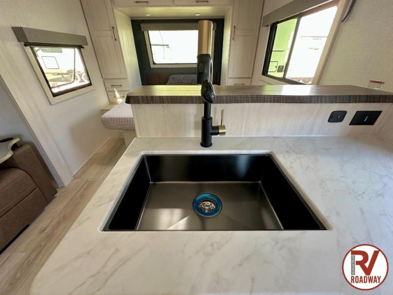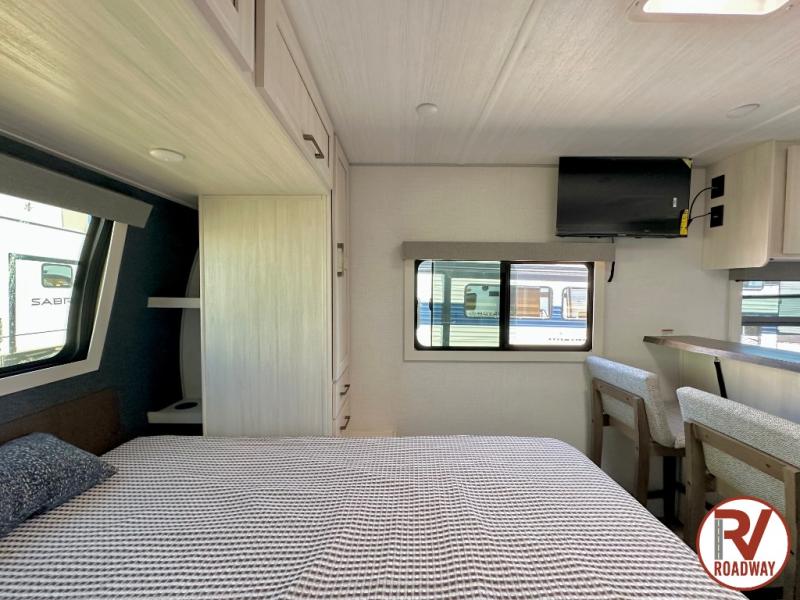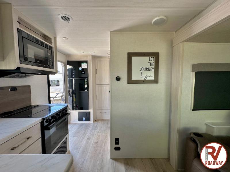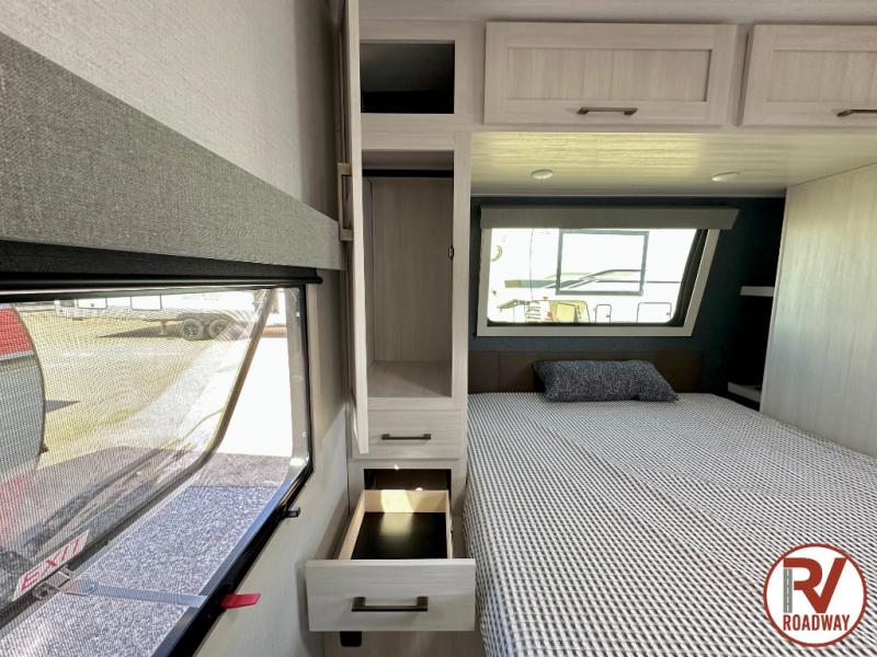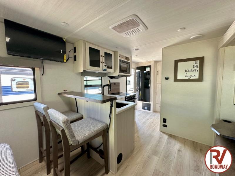 You're going to love every minute spent in this 25' travel trailer! The counter with stools will be the perfect place to enjoy your morning coffee at, plus there is a dinette slide for more seating space. You will get a great night's rest on the queen bed in the front bedroom, and the two wardrobes allow you to keep your clothes tidy. Further customize this trailer by adding the theater seating option or tri-fold sofa option in place of the dinette, and you'll enjoy the standard HD TV for late-night movies!