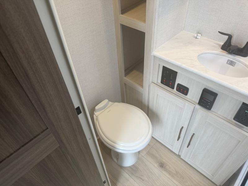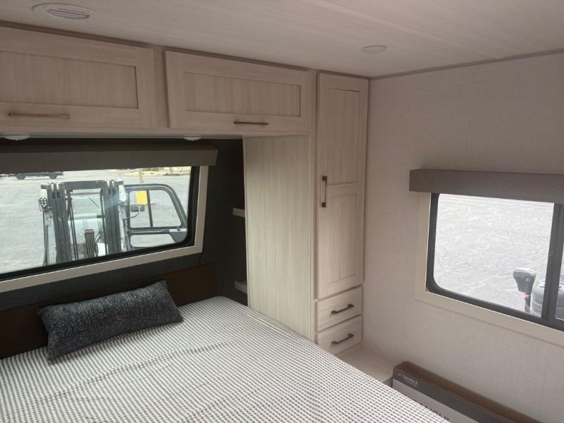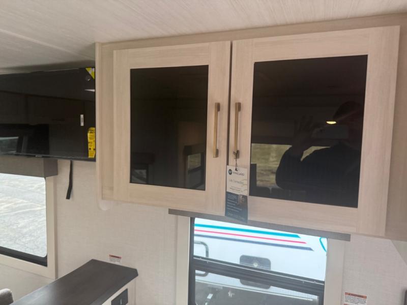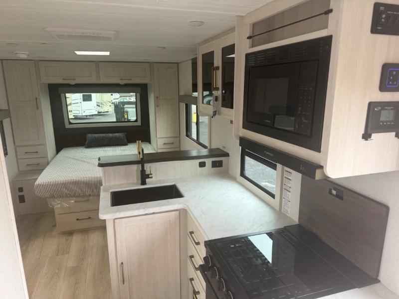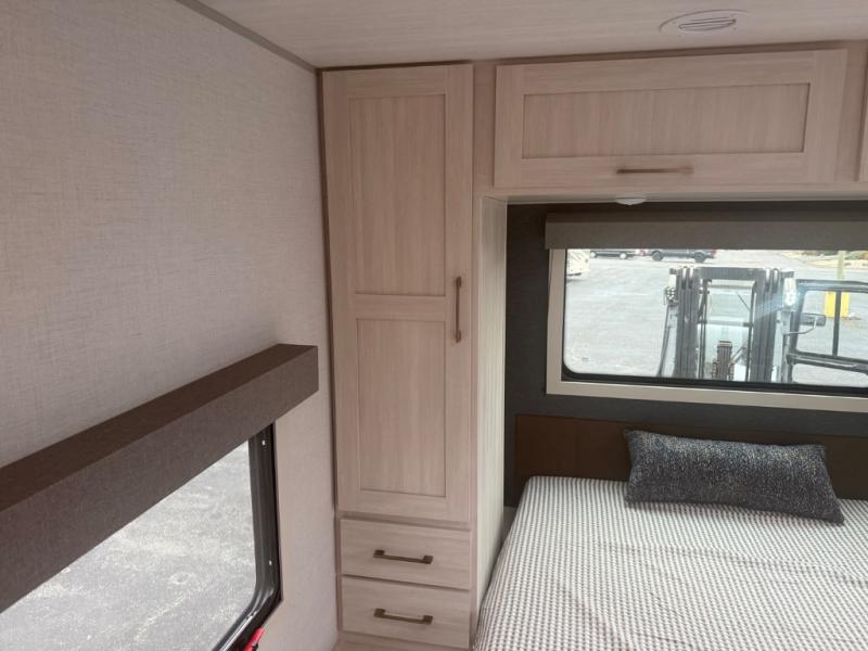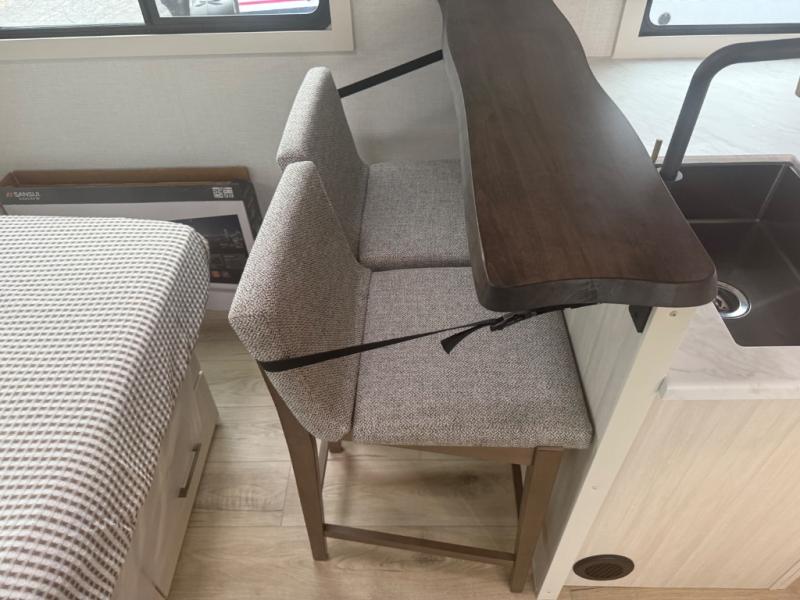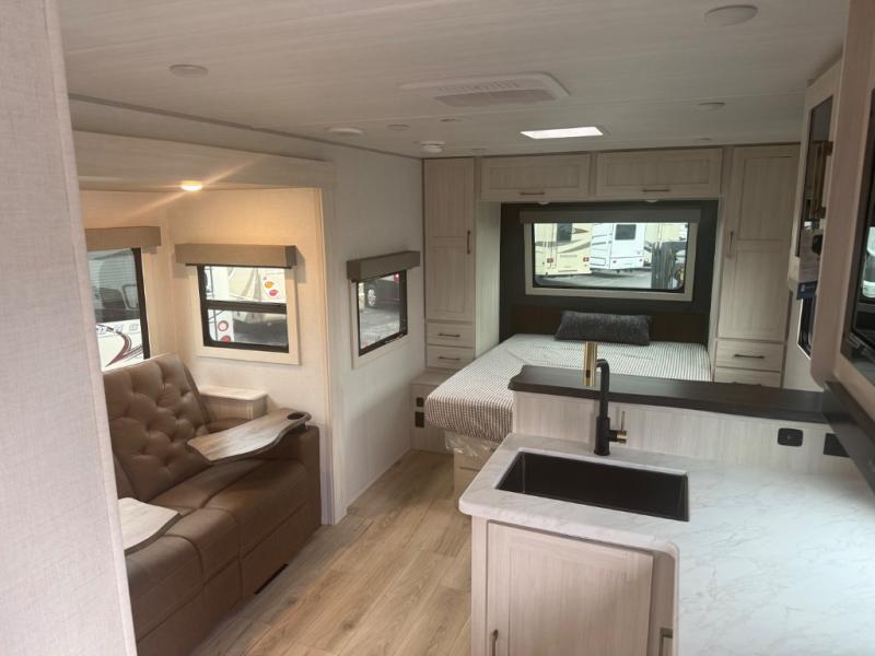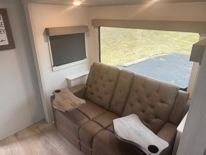 You're going to love every minute spent in this 25' travel trailer! The counter with stools will be the perfect place to enjoy your morning coffee at, plus there is a dinette slide for more seating space. You will get a great night's rest on the queen bed in the front bedroom, and the two wardrobes allow you to keep your clothes tidy. Further customize this trailer by adding the theater seating option or tri-fold sofa option in place of the dinette, and you'll enjoy the standard HD TV for late-night movies!