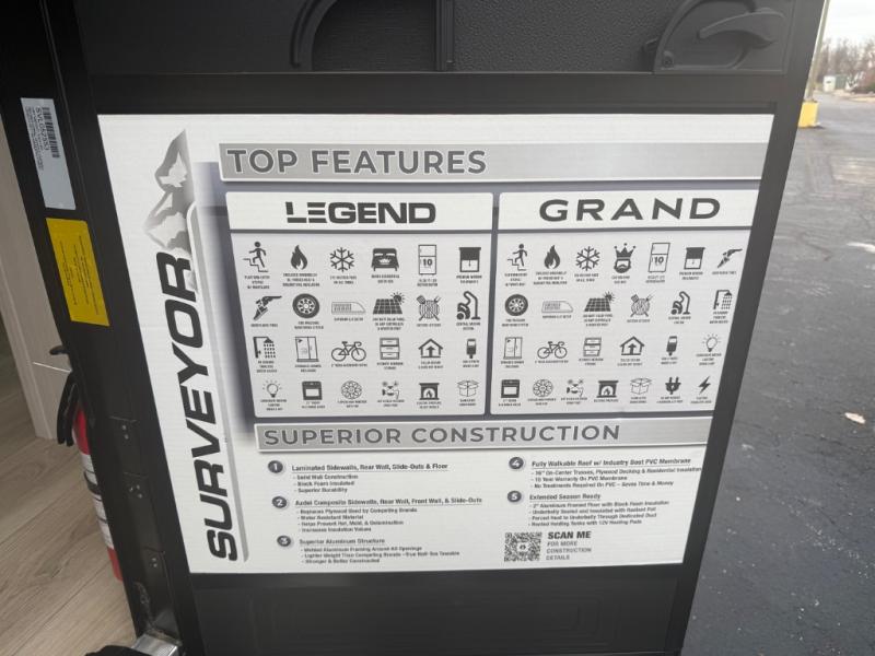 With any Surveyor Legend travel trailer by Forest River you will enjoy quality craftsmanship, convenient amenities, and at-home comforts. The Azdel composite walls provide a longer-lasting trailer, and the power tongue jack with a hitch light will get you back on the road in no-time. There are also Goodyear tires and a tire pressure monitoring system for hassle-free towing. Each model includes the Surveyor Legend Package that comes standard with oversized dinette storage access doors, front slam latch baggage doors, plus an automotive style tinted front windshield. You'll appreciate camping with a tankless water heater for endless hot showers, a 2" accessory hitch to bring bikes along, plus carpet-free interiors and a central vacuum system for easy clean up.