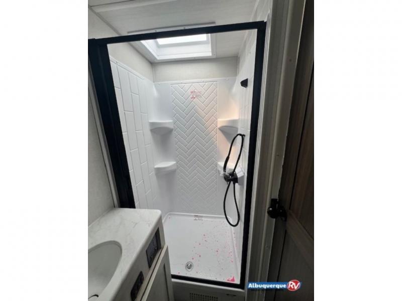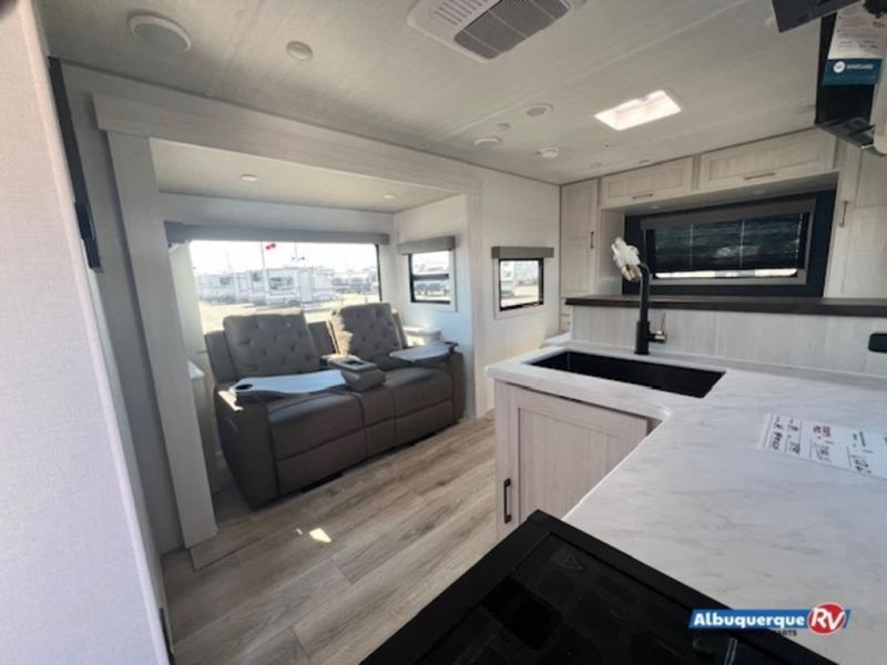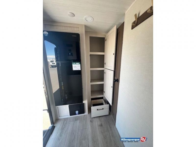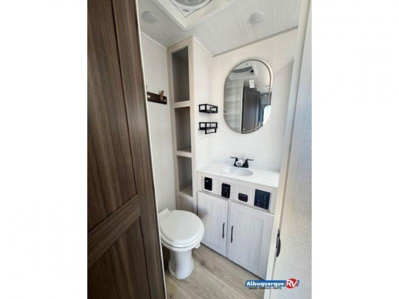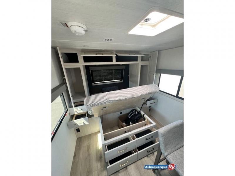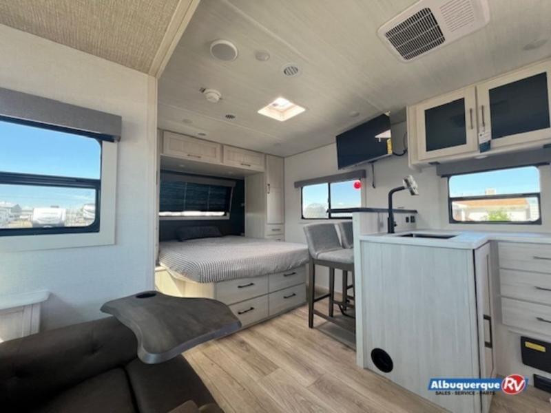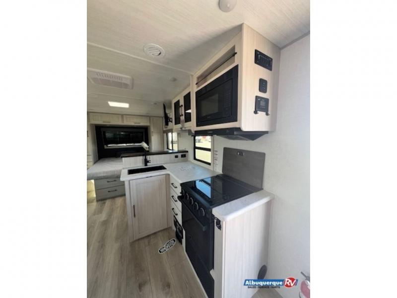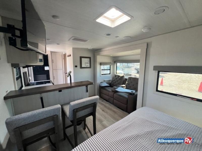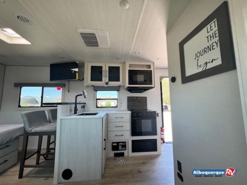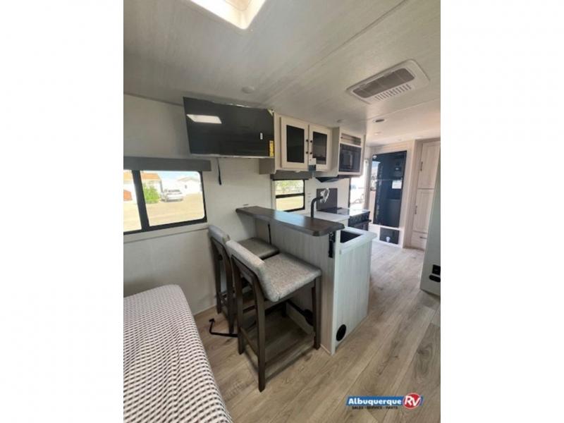 You're going to love every minute spent in this 25' travel trailer! The counter with stools will be the perfect place to enjoy your morning coffee at, plus there is a dinette slide for more seating space. You will get a great night's rest on the queen bed in the front bedroom, and the two wardrobes allow you to keep your clothes tidy. Further customize this trailer by adding the theater seating option or tri-fold sofa option in place of the dinette, and you'll enjoy the standard HD TV for late-night movies!
