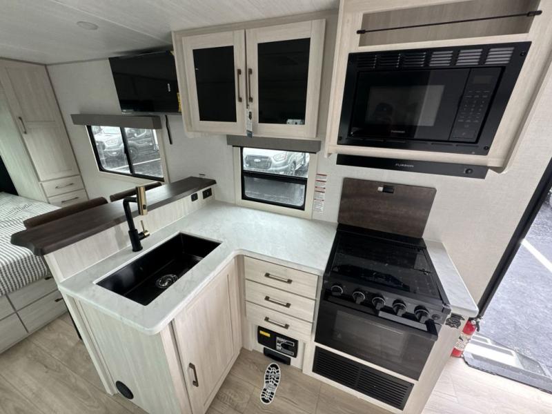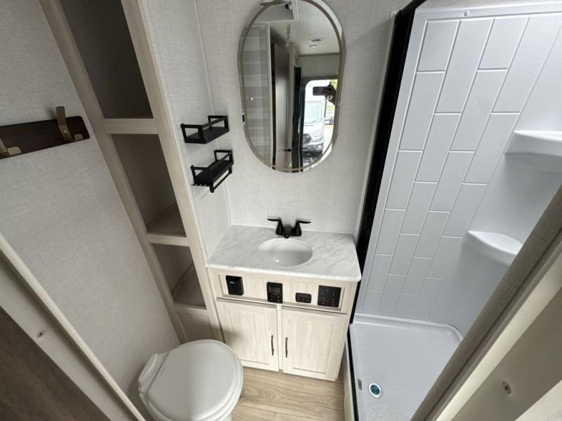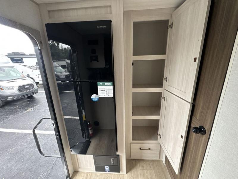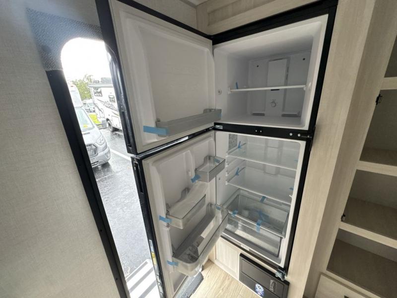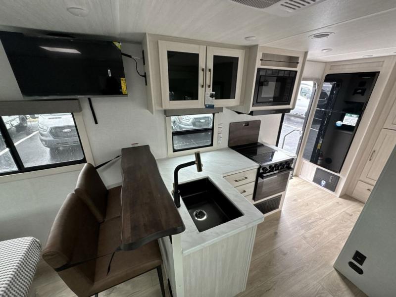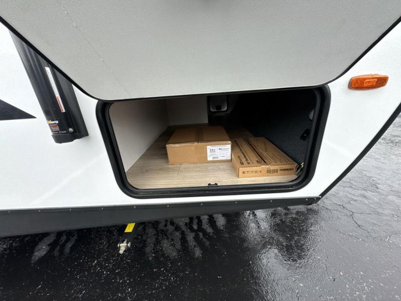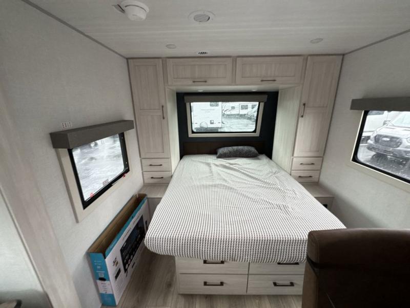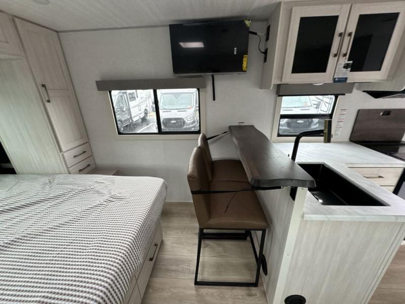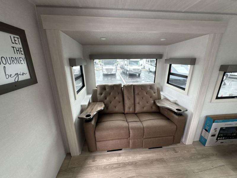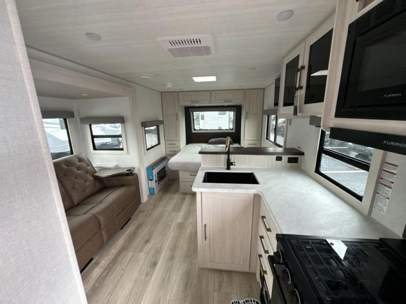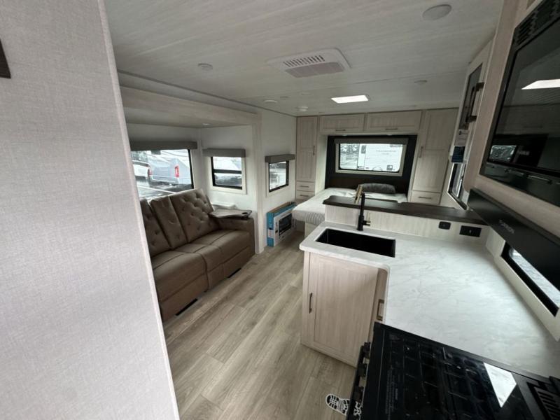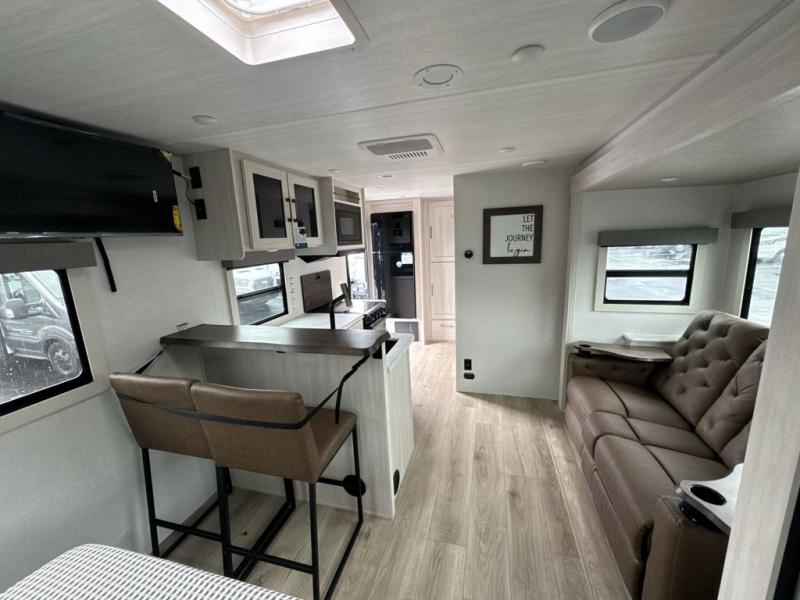 You're going to love every minute spent in this 25' travel trailer! The counter with stools will be the perfect place to enjoy your morning coffee at, plus there is a dinette slide for more seating space. You will get a great night's rest on the queen bed in the front bedroom, and the two wardrobes allow you to keep your clothes tidy. Further customize this trailer by adding the theater seating option or tri-fold sofa option in place of the dinette, and you'll enjoy the standard HD TV for late-night movies!