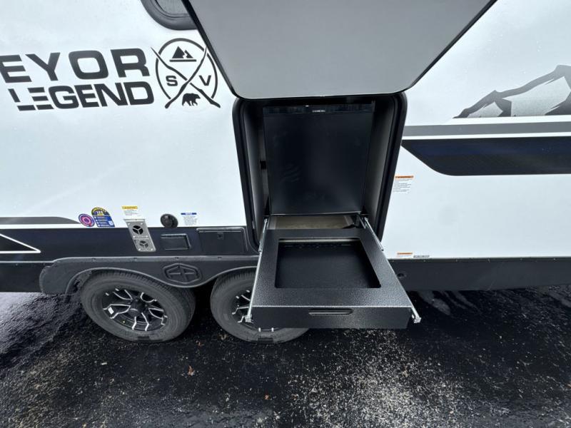 With any Surveyor Legend travel trailer by Forest River you will enjoy quality craftsmanship, convenient amenities, and at-home comforts. The Azdel composite walls provide a longer-lasting trailer, and the power tongue jack with a hitch light will get you back on the road in no-time. There are also Goodyear tires and a tire pressure monitoring system for hassle-free towing. Each model includes the Surveyor Legend Package that comes standard with oversized dinette storage access doors, front slam latch baggage doors, plus an automotive style tinted front windshield. You'll appreciate camping with a tankless water heater for endless hot showers, a 2" accessory hitch to bring bikes along, plus carpet-free interiors and a central vacuum system for easy clean up.