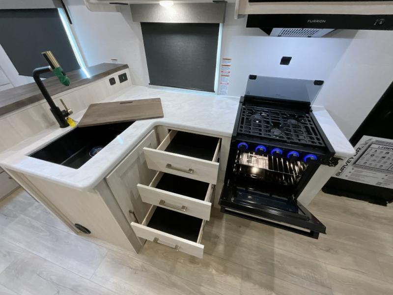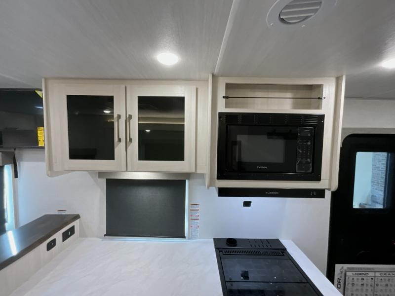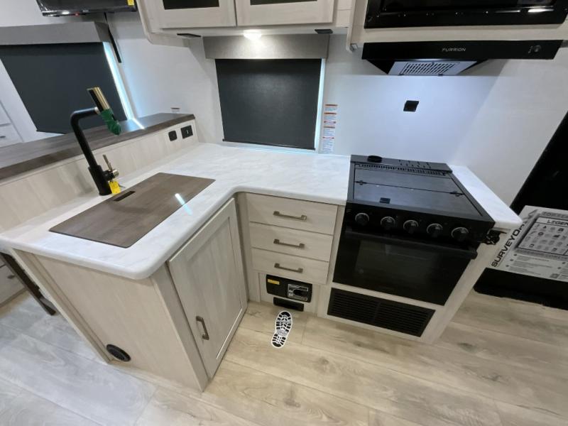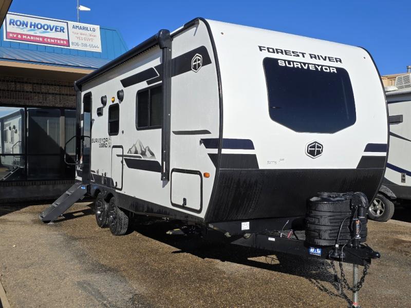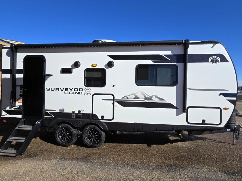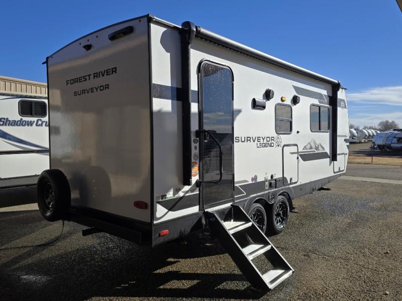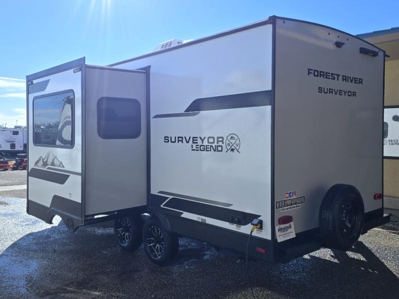 With any Surveyor Legend travel trailer by Forest River you will enjoy quality craftsmanship, convenient amenities, and at-home comforts. The Azdel composite walls provide a longer-lasting trailer, and the power tongue jack with hitch light makes getting back on the road quick and easy. There are also Goodyear® tires and a tire pressure monitoring system (TPMS) for more confident, hassle-free towing. Each model is built with thoughtful details like slam-latch exterior baggage doors and an automotive-style tinted front windshield that gives the front cap a sleek look while letting in natural light. You’ll appreciate camping with a tankless water heater for endless hot showers, a 2" rear accessory hitch to bring bikes or extra gear along, plus a central vacuum system that helps keep your easy-to-clean interior looking fresh.