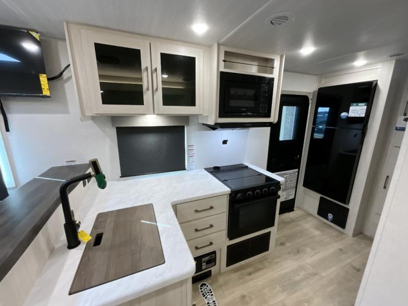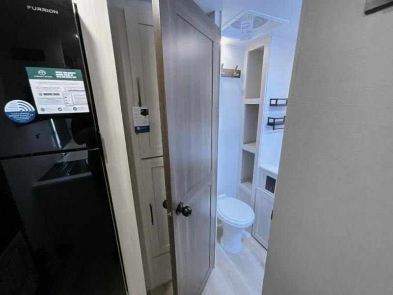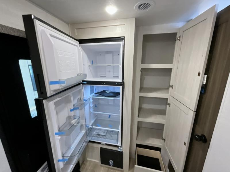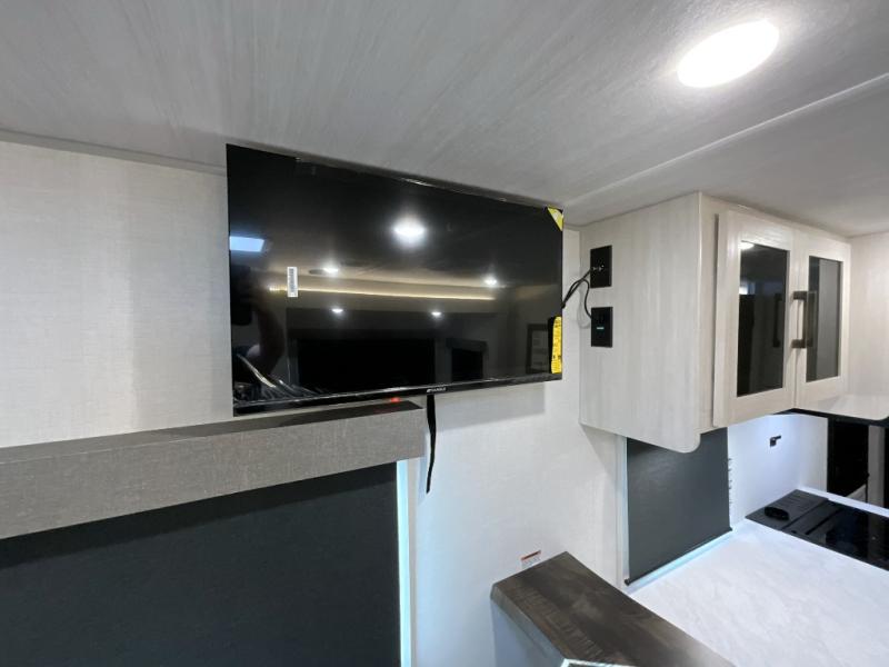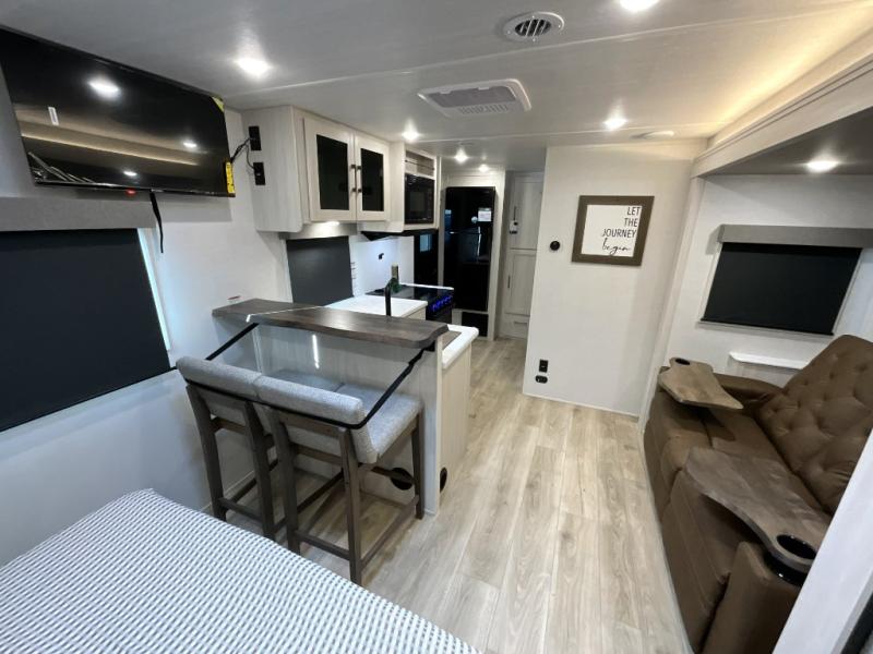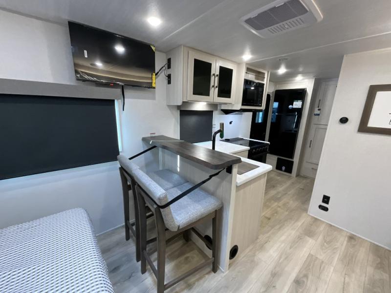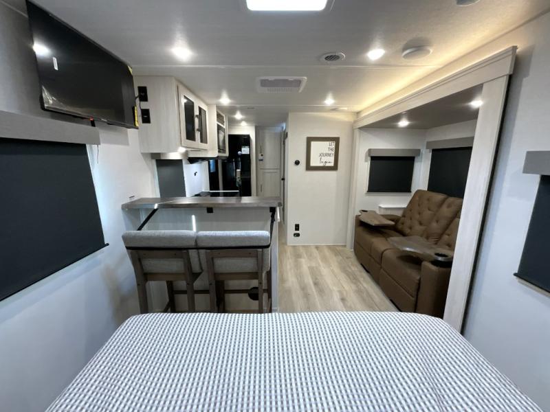 You're going to love every minute spent in this 25' travel trailer! The counter with stools will be the perfect place to enjoy your morning coffee at, plus there is a dinette slide for more seating space. You will get a great night's rest on the queen bed in the front bedroom, and the two wardrobes allow you to keep your clothes tidy. Further customize this trailer by adding the theater seating option or tri-fold sofa option in place of the dinette, and you'll enjoy the standard HD TV for late-night movies!