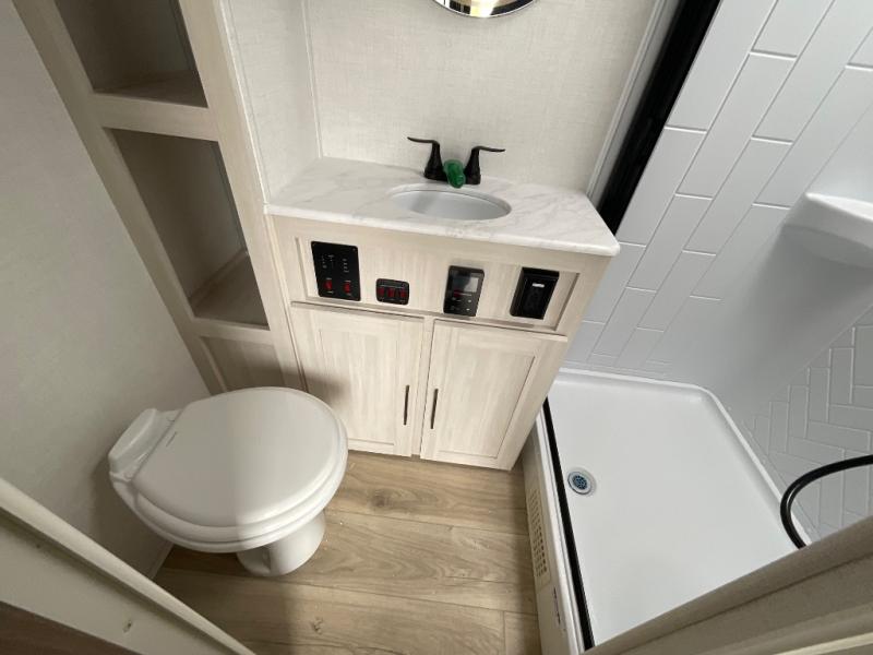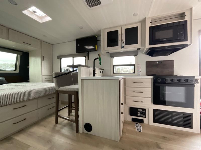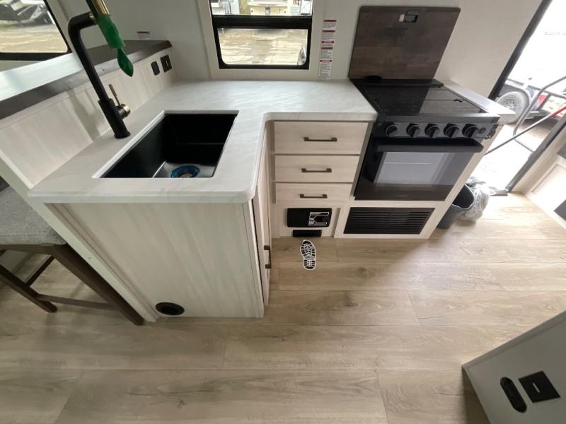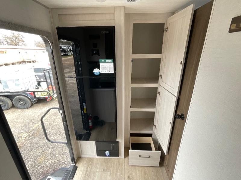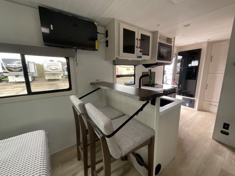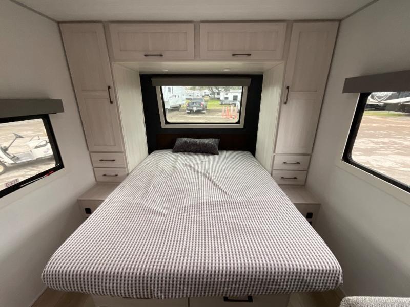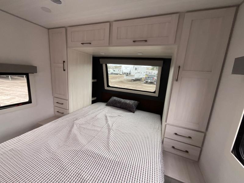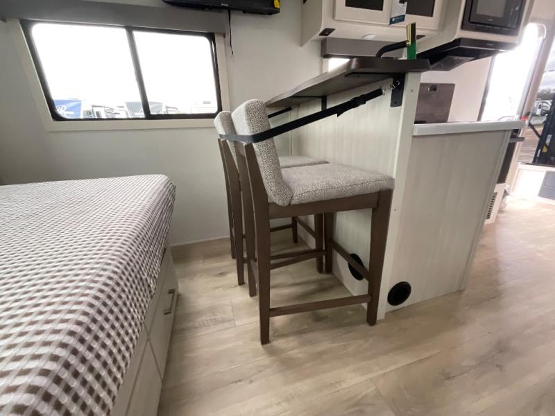 You're going to love every minute spent in this 25' travel trailer! The counter with stools will be the perfect place to enjoy your morning coffee at, plus there is a dinette slide for more seating space. You will get a great night's rest on the queen bed in the front bedroom, and the two wardrobes allow you to keep your clothes tidy. Further customize this trailer by adding the theater seating option or tri-fold sofa option in place of the dinette, and you'll enjoy the standard HD TV for late-night movies!