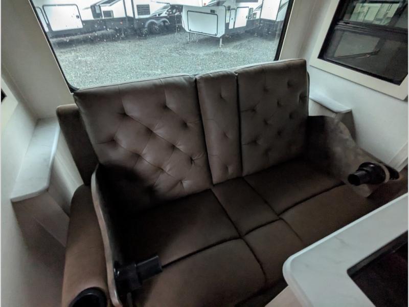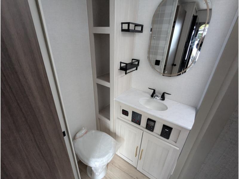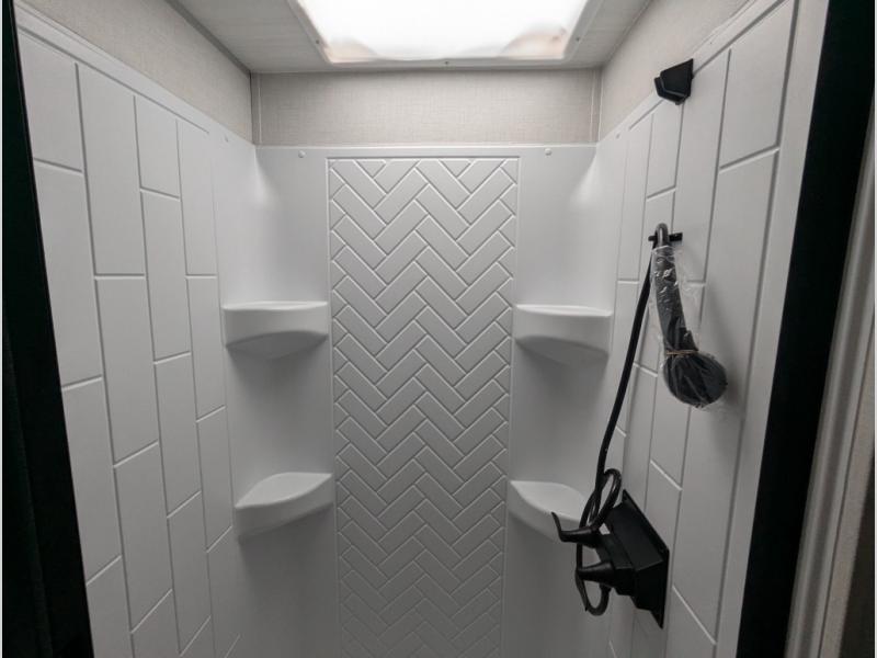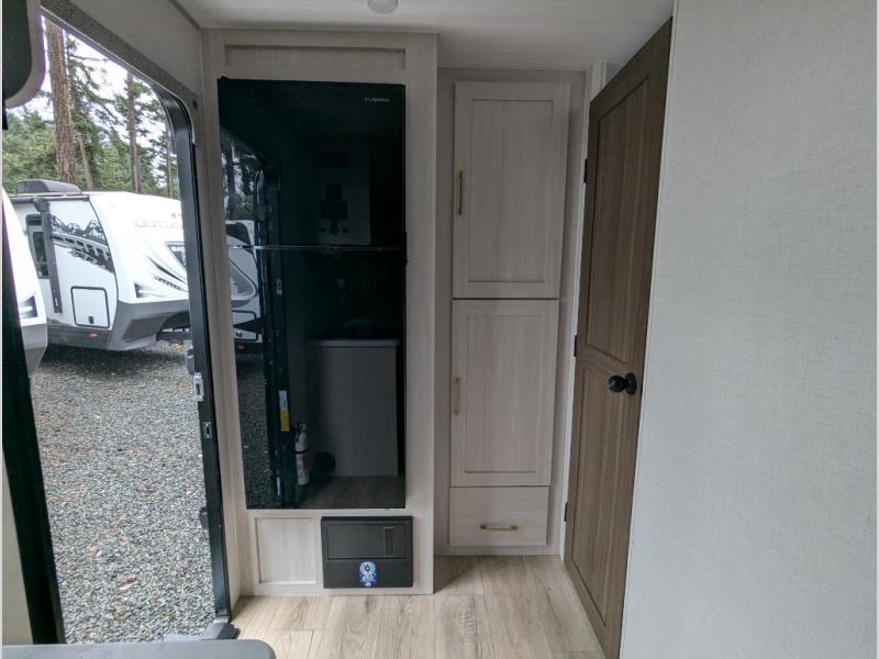 You're going to love every minute spent in this 25' travel trailer! The counter with stools will be the perfect place to enjoy your morning coffee at, plus there is a dinette slide for more seating space. You will get a great night's rest on the queen bed in the front bedroom, and the two wardrobes allow you to keep your clothes tidy. Further customize this trailer by adding the theater seating option or tri-fold sofa option in place of the dinette, and you'll enjoy the standard HD TV for late-night movies!