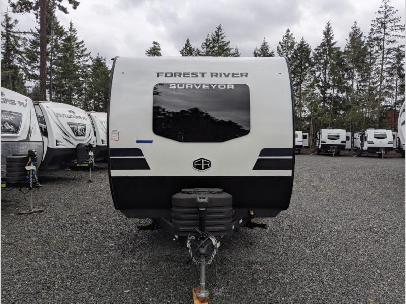 With any Surveyor Legend travel trailer by Forest River you will enjoy quality craftsmanship, convenient amenities, and at-home comforts. The Azdel composite walls provide a longer-lasting trailer, and the power tongue jack with a hitch light will get you back on the road in no-time. There are also Goodyear tires and a tire pressure monitoring system for hassle-free towing. Each model includes the Surveyor Legend Package that comes standard with oversized dinette storage access doors, front slam latch baggage doors, plus an automotive style tinted front windshield. You'll appreciate camping with a tankless water heater for endless hot showers, a 2" accessory hitch to bring bikes along, plus carpet-free interiors and a central vacuum system for easy clean up.