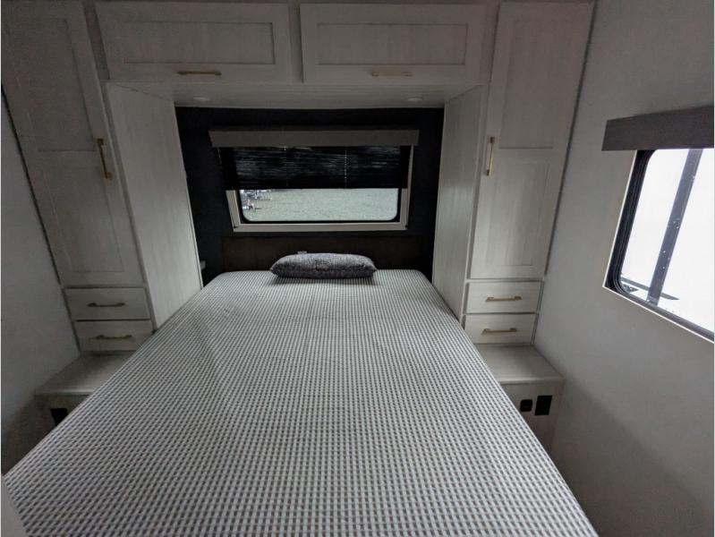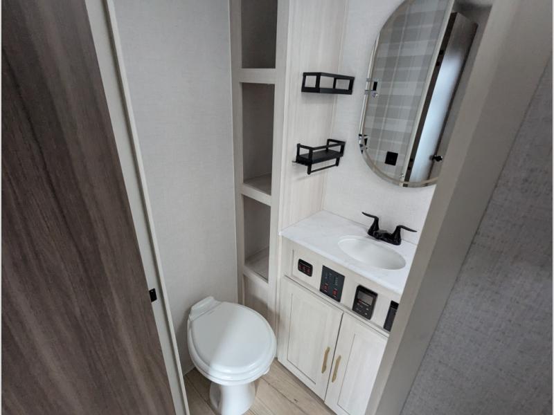 You're going to love every minute spent in this 25' travel trailer! The counter with stools will be the perfect place to enjoy your morning coffee at, plus there is a dinette slide for more seating space. You will get a great night's rest on the queen bed in the front bedroom, and the two wardrobes allow you to keep your clothes tidy. Further customize this trailer by adding the theater seating option or tri-fold sofa option in place of the dinette, and you'll enjoy the standard HD TV for late-night movies!
