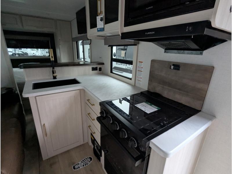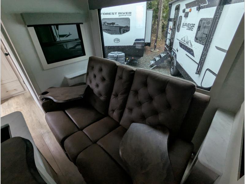 With any Surveyor Legend travel trailer by Forest River you will enjoy quality craftsmanship, convenient amenities, and at-home comforts. The Azdel composite walls provide a longer-lasting trailer, and the power tongue jack with a hitch light will get you back on the road in no-time. There are also Goodyear tires and a tire pressure monitoring system for hassle-free towing. Each model includes the Surveyor Legend Package that comes standard with oversized dinette storage access doors, front slam latch baggage doors, plus an automotive style tinted front windshield. You'll appreciate camping with a tankless water heater for endless hot showers, a 2" accessory hitch to bring bikes along, plus carpet-free interiors and a central vacuum system for easy clean up.