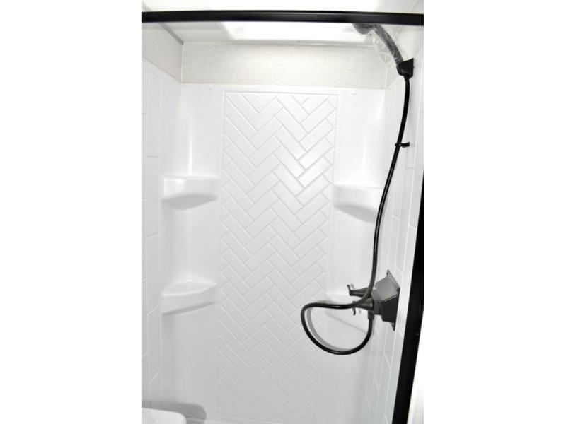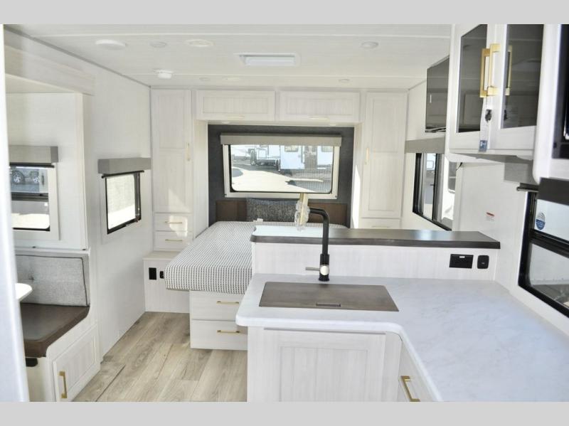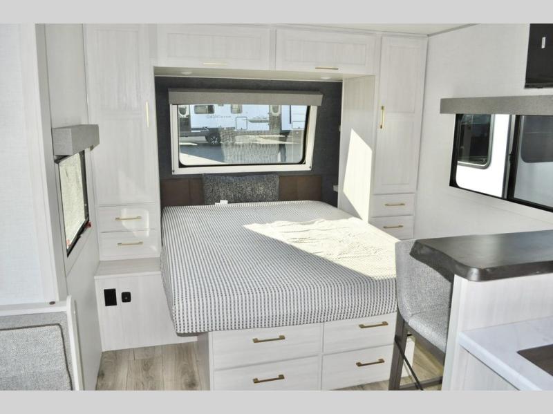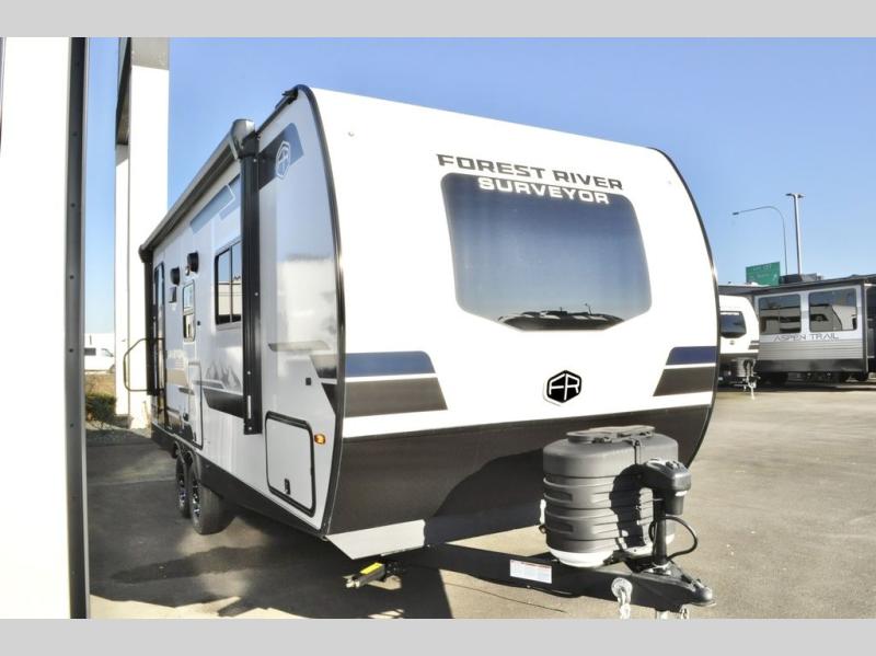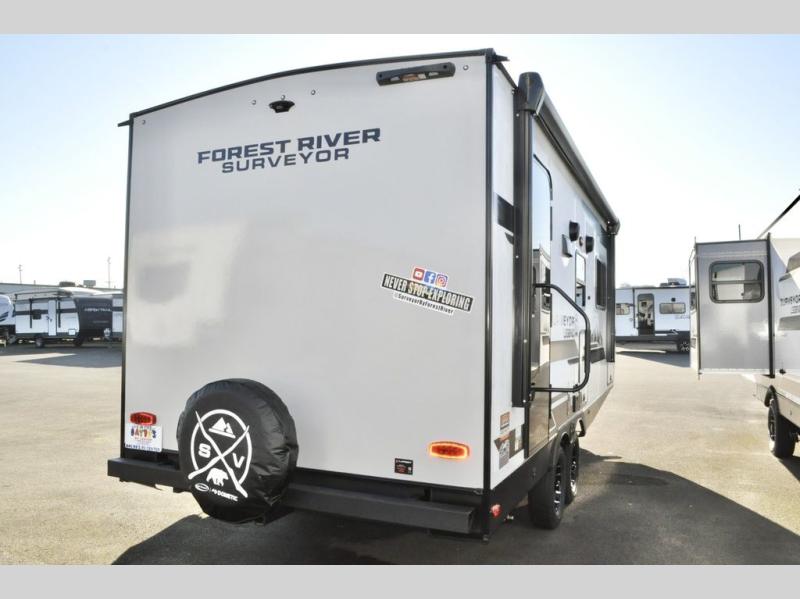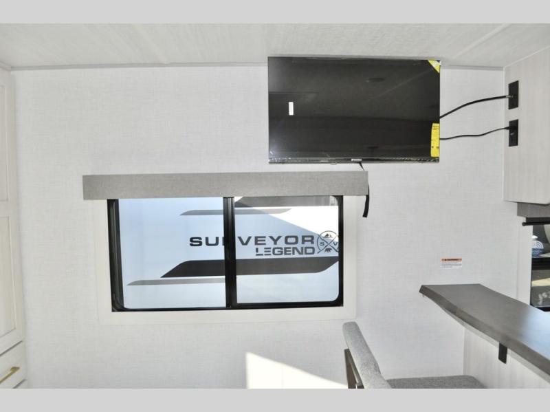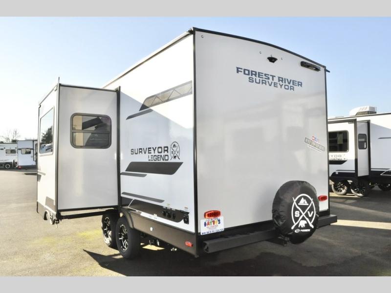 With any Surveyor Legend travel trailer by Forest River you will enjoy quality craftsmanship, convenient amenities, and at-home comforts. The Azdel composite walls provide a longer-lasting trailer, and the power tongue jack with hitch light makes getting back on the road quick and easy. There are also Goodyear® tires and a tire pressure monitoring system (TPMS) for more confident, hassle-free towing. Each model is built with thoughtful details like slam-latch exterior baggage doors and an automotive-style tinted front windshield that gives the front cap a sleek look while letting in natural light. You’ll appreciate camping with a tankless water heater for endless hot showers, a 2" rear accessory hitch to bring bikes or extra gear along, plus a central vacuum system that helps keep your easy-to-clean interior looking fresh.