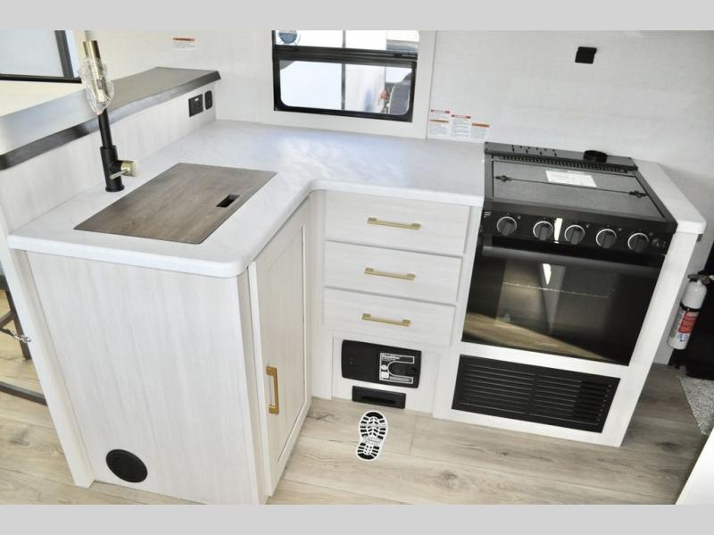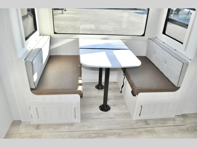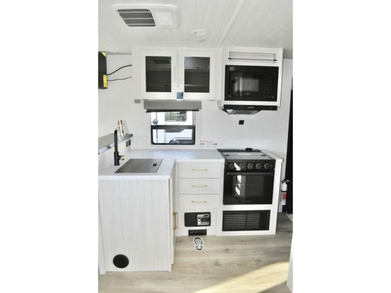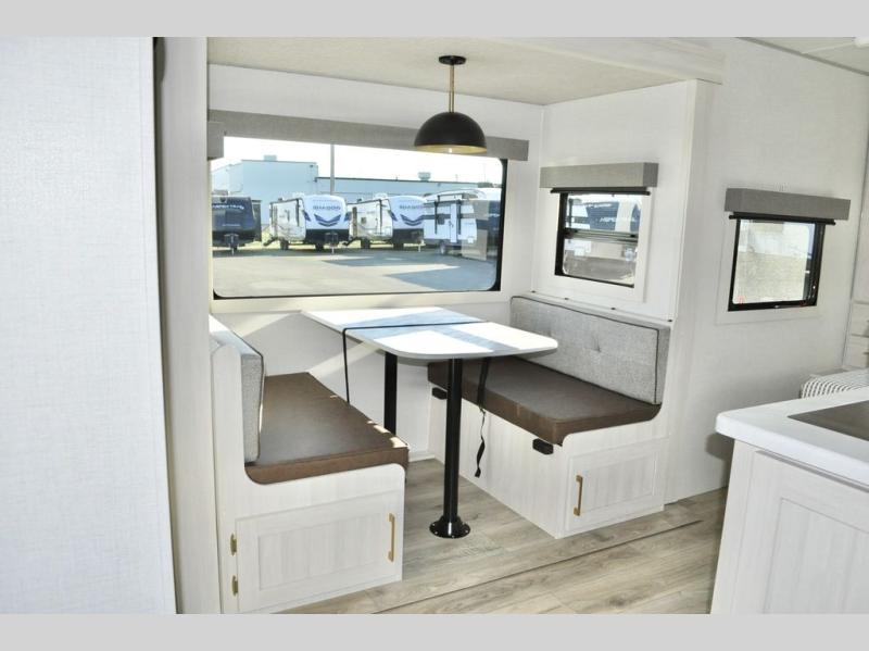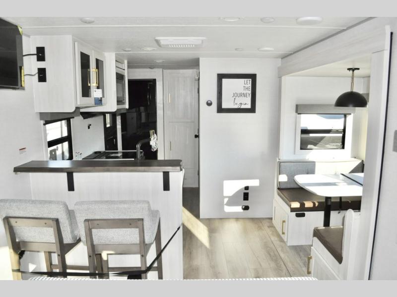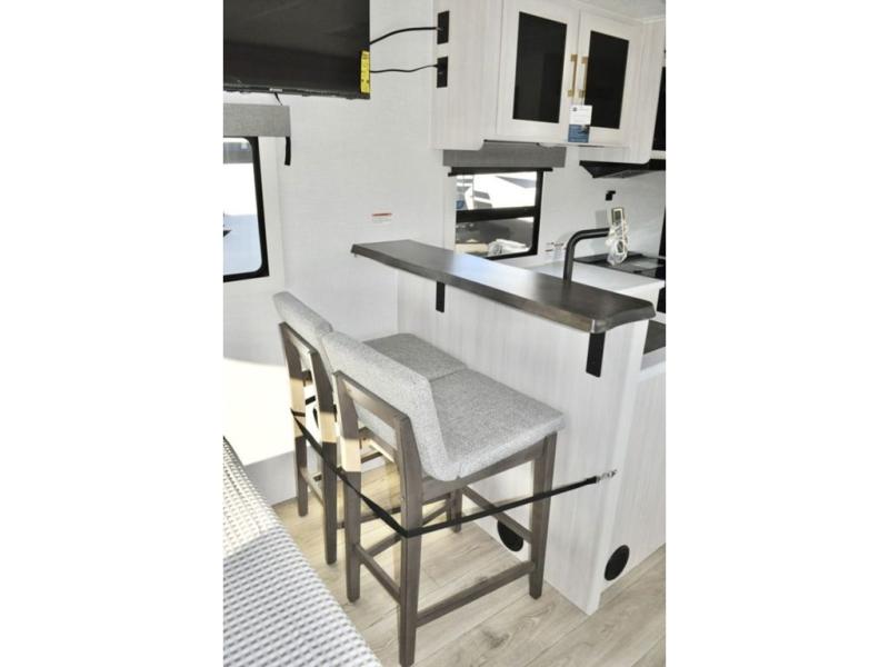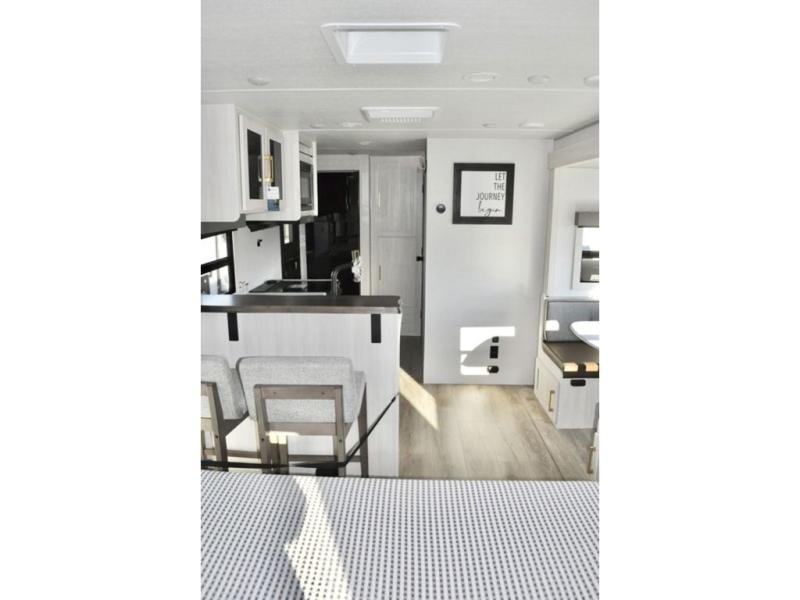 You're going to love every minute spent in this 25' travel trailer! The counter with stools will be the perfect place to enjoy your morning coffee at, plus there is a dinette slide for more seating space. You will get a great night's rest on the queen bed in the front bedroom, and the two wardrobes allow you to keep your clothes tidy. Further customize this trailer by adding the theater seating option or tri-fold sofa option in place of the dinette, and you'll enjoy the standard HD TV for late-night movies!