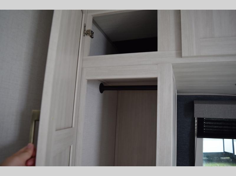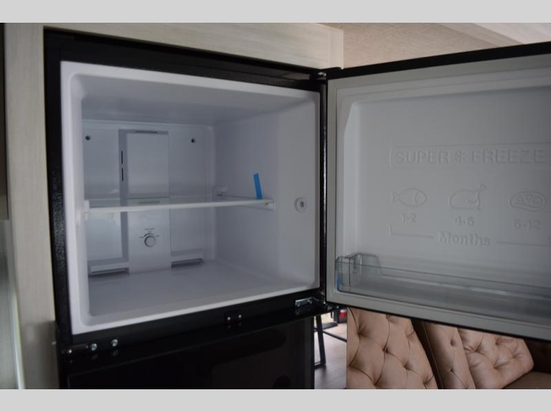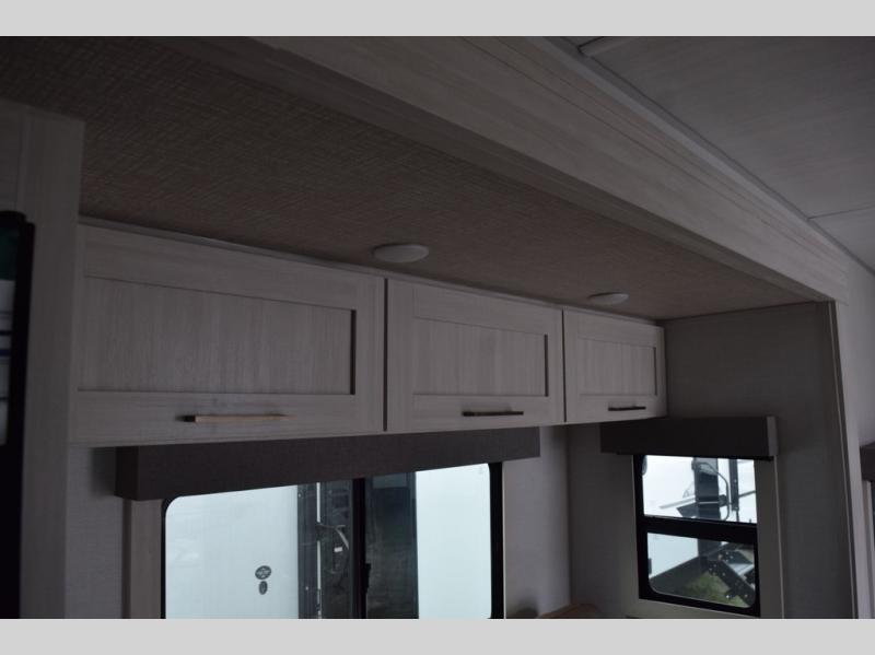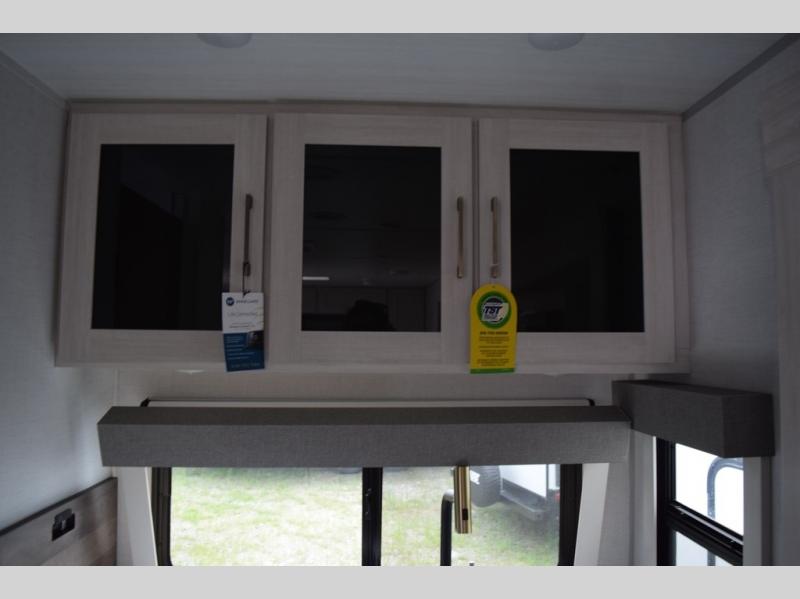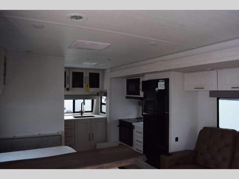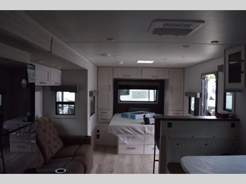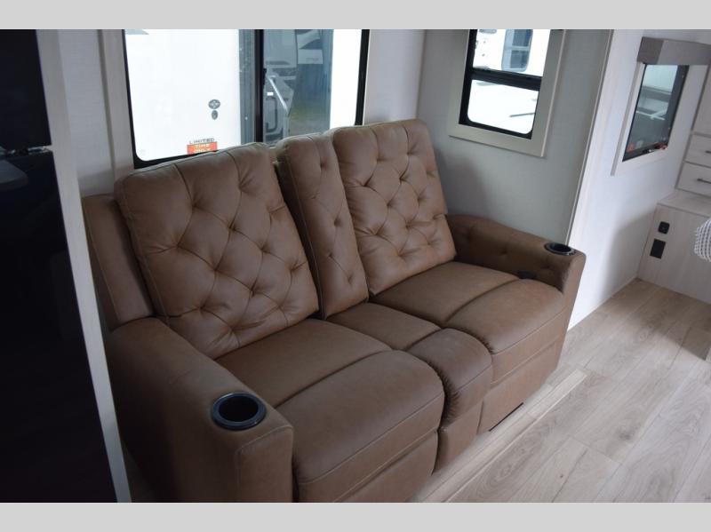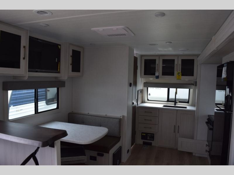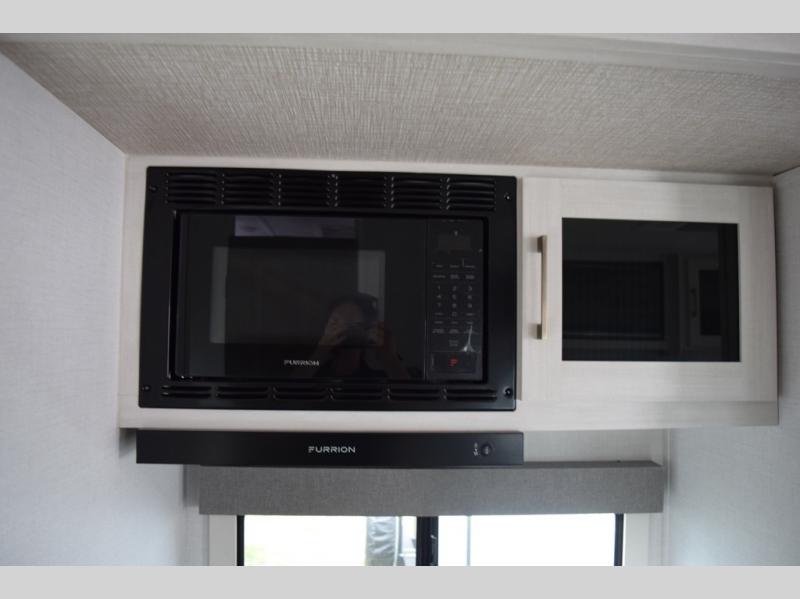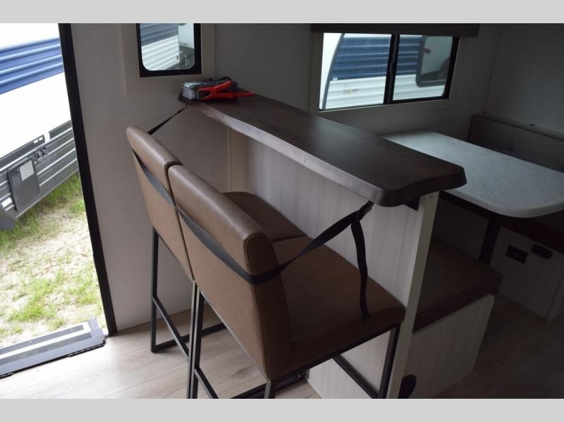 You'll love camping and spending time with loved ones in this spacious travel trailer. The 18' power awning with LED lights can be set up once you arrive at the campground, and you can unload camp gear from the pass-through storage. Head inside to make lunch on the residential range top or in the microwave oven. There is a booth dinette and tri-fold sofa for seating space, plus an additional counter with bar stools beside the dinette. A full bath onboard lets you clean up each day, and the front queen bed is sure to bring a great night's rest. There are also dual wardrobes to keep your space tidy and overhead storage for even more belongings.