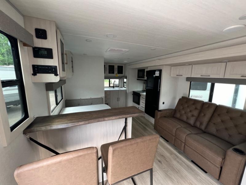 You'll love camping and spending time with loved ones in this spacious travel trailer. The 18' power awning with LED lights can be set up once you arrive at the campground, and you can unload camp gear from the pass-through storage. Head inside to make lunch on the residential range top or in the microwave oven. There is a booth dinette and tri-fold sofa for seating space, plus an additional counter with bar stools beside the dinette. A full bath onboard lets you clean up each day, and the front queen bed is sure to bring a great night's rest. There are also dual wardrobes to keep your space tidy and overhead storage for even more belongings.