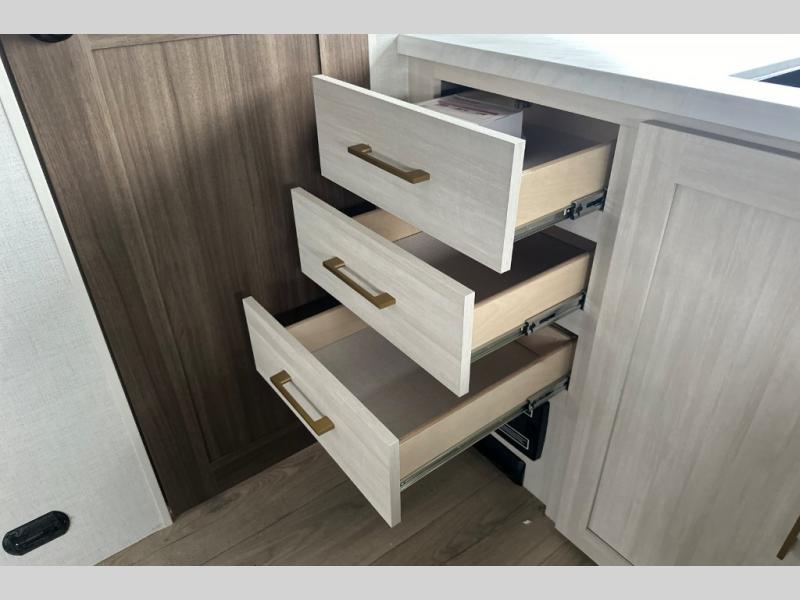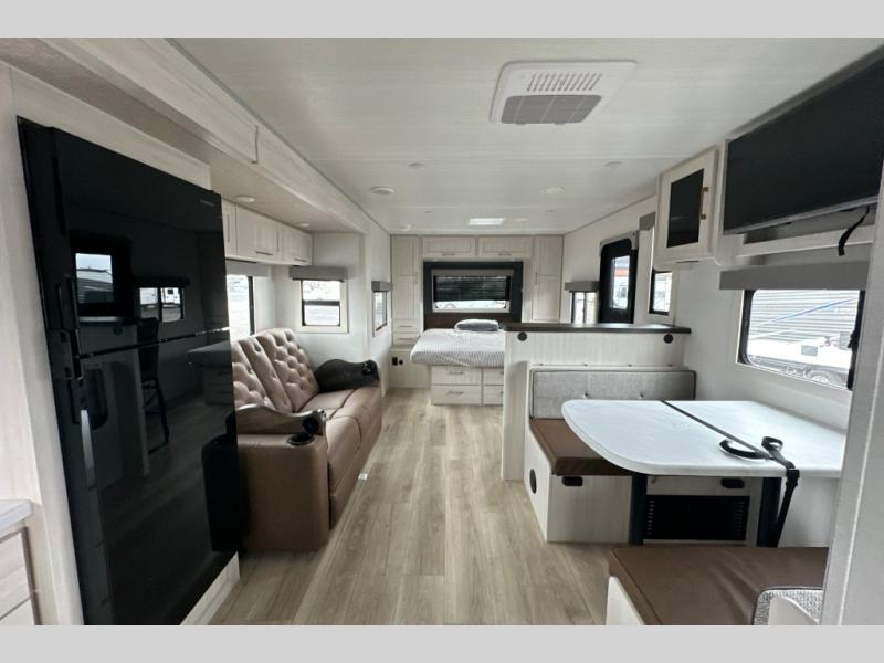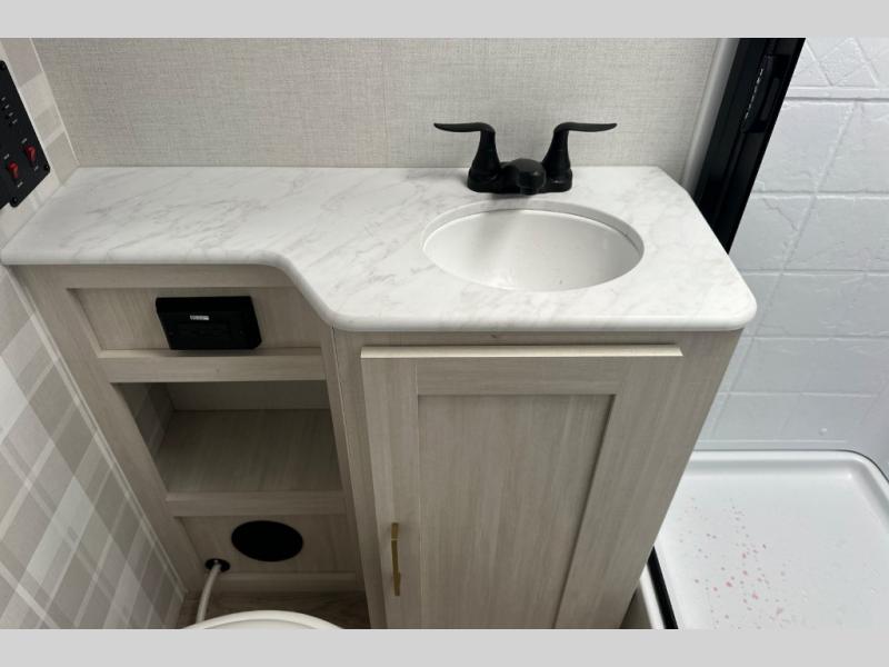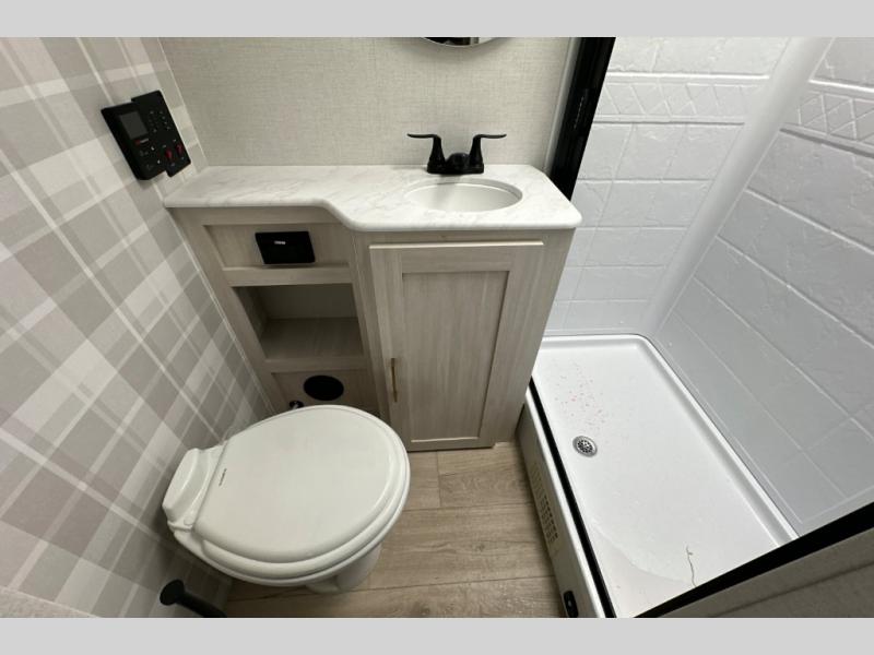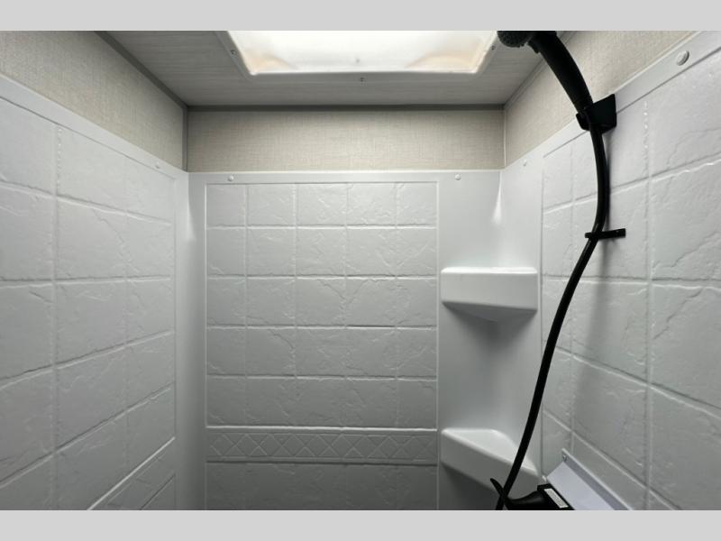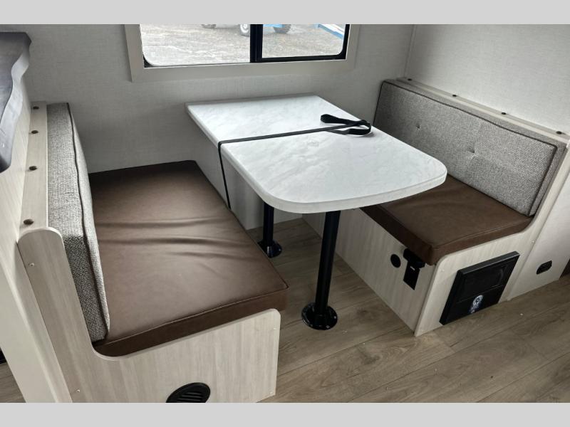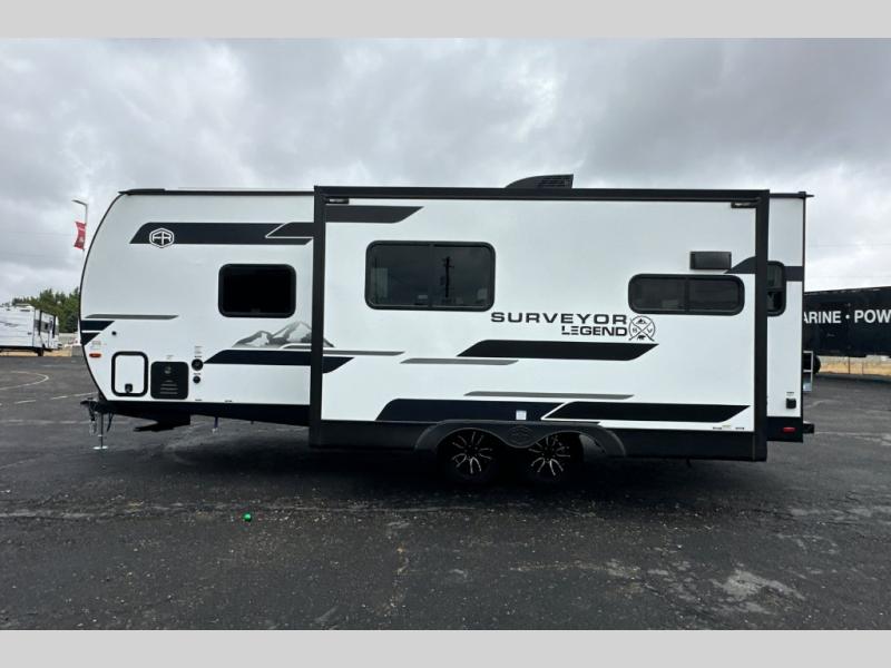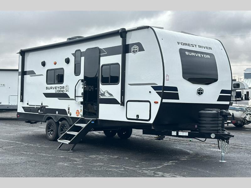 With any Surveyor Legend travel trailer by Forest River you will enjoy quality craftsmanship, convenient amenities, and at-home comforts. The Azdel composite walls provide a longer-lasting trailer, and the power tongue jack with a hitch light will get you back on the road in no-time. There are also Goodyear tires and a tire pressure monitoring system for hassle-free towing. Each model includes the Surveyor Legend Package that comes standard with oversized dinette storage access doors, front slam latch baggage doors, plus an automotive style tinted front windshield. You'll appreciate camping with a tankless water heater for endless hot showers, a 2" accessory hitch to bring bikes along, plus carpet-free interiors and a central vacuum system for easy clean up.